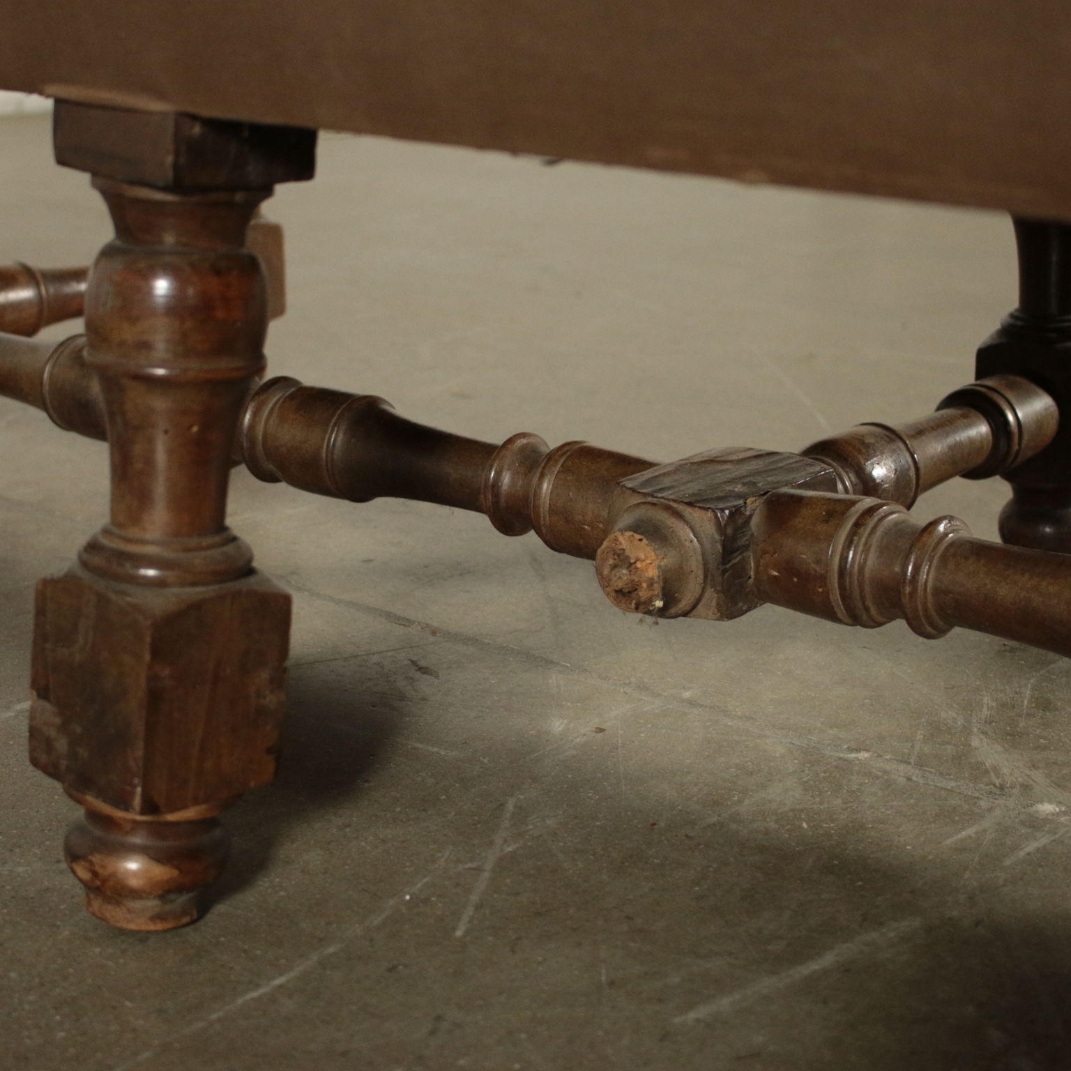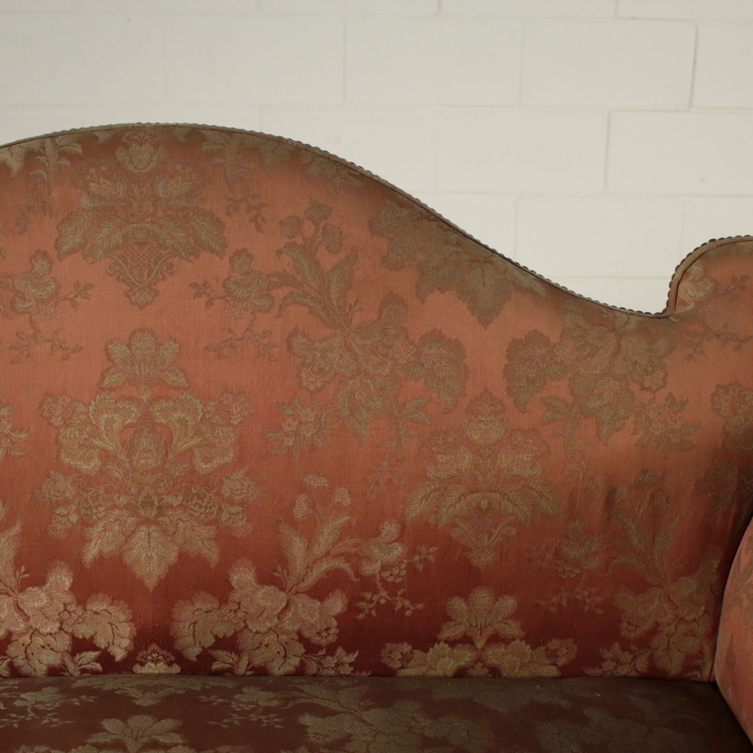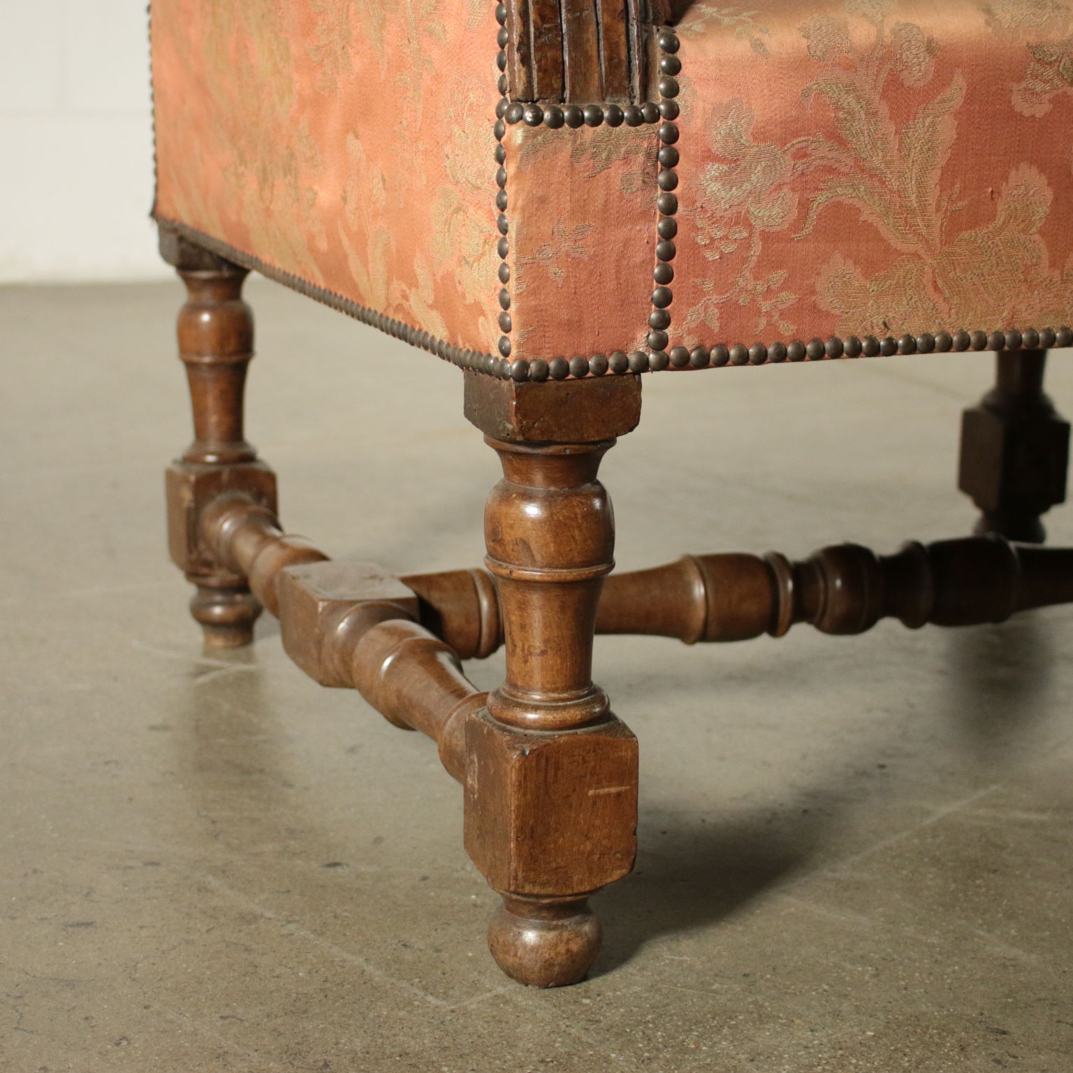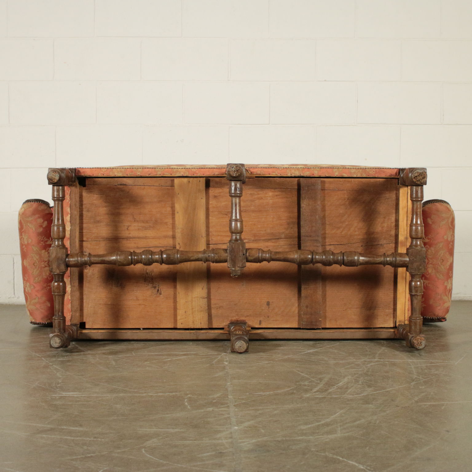 Divano due posti ad orecchioni. Retto da gambe tornite raccordate da crociera. Ampi braccioli intagliati. Schienale sagomato e seduta imbottiti.