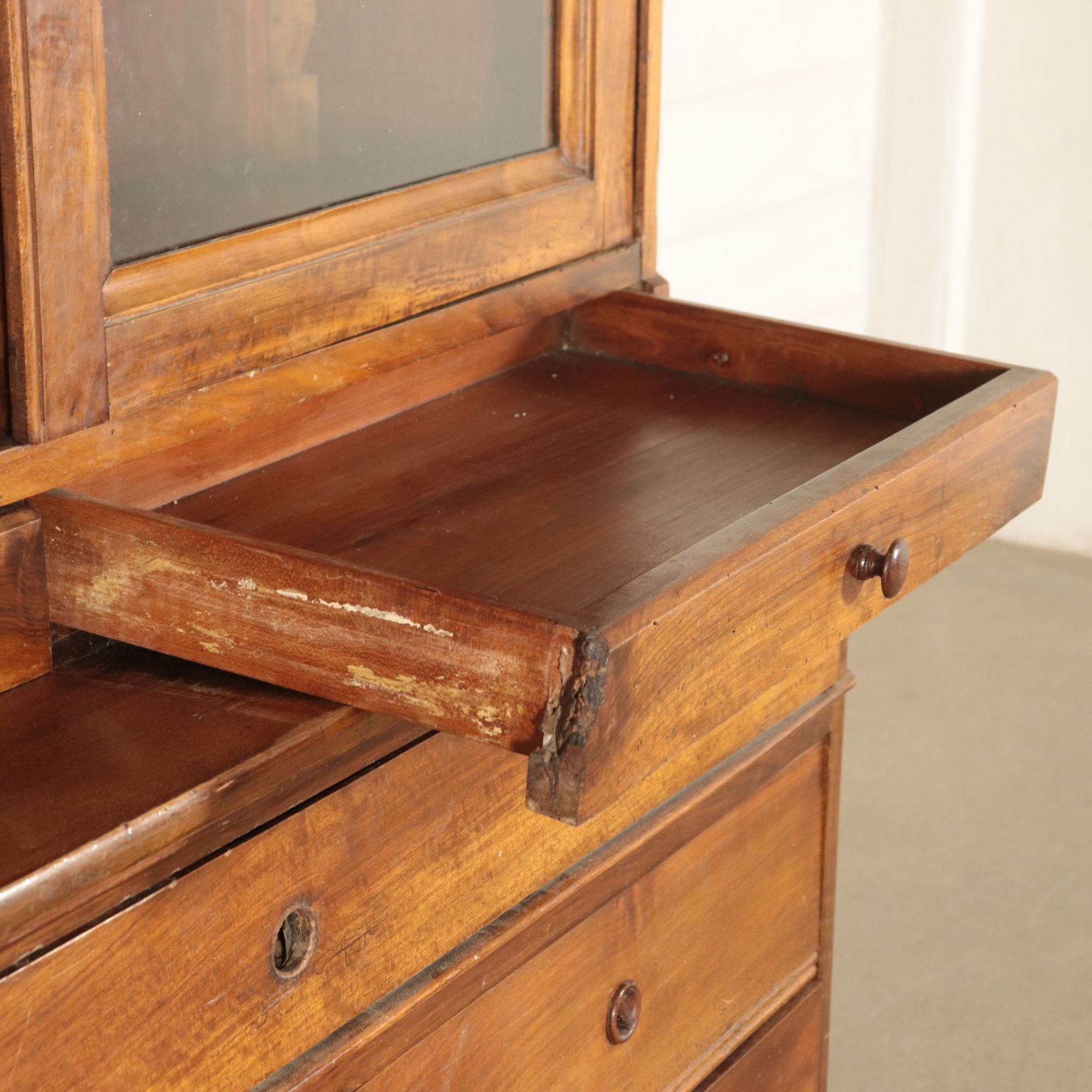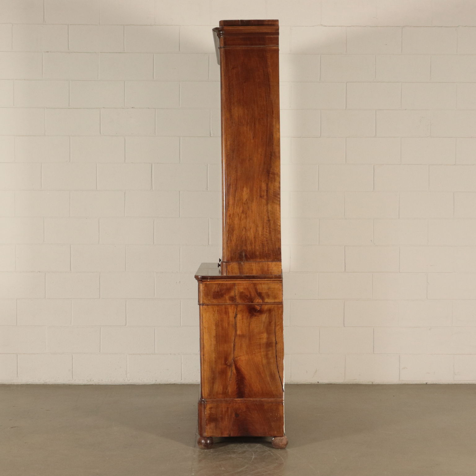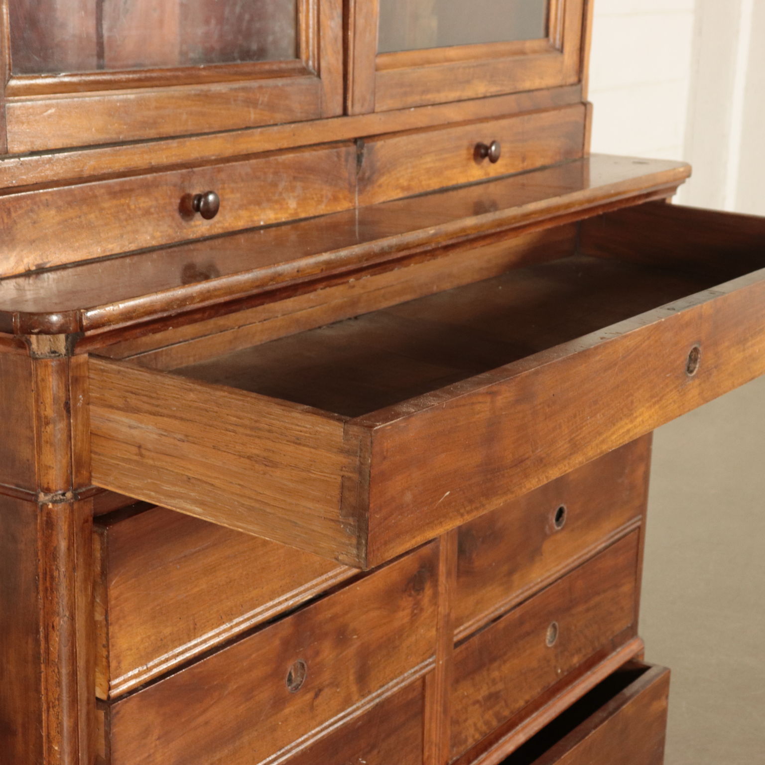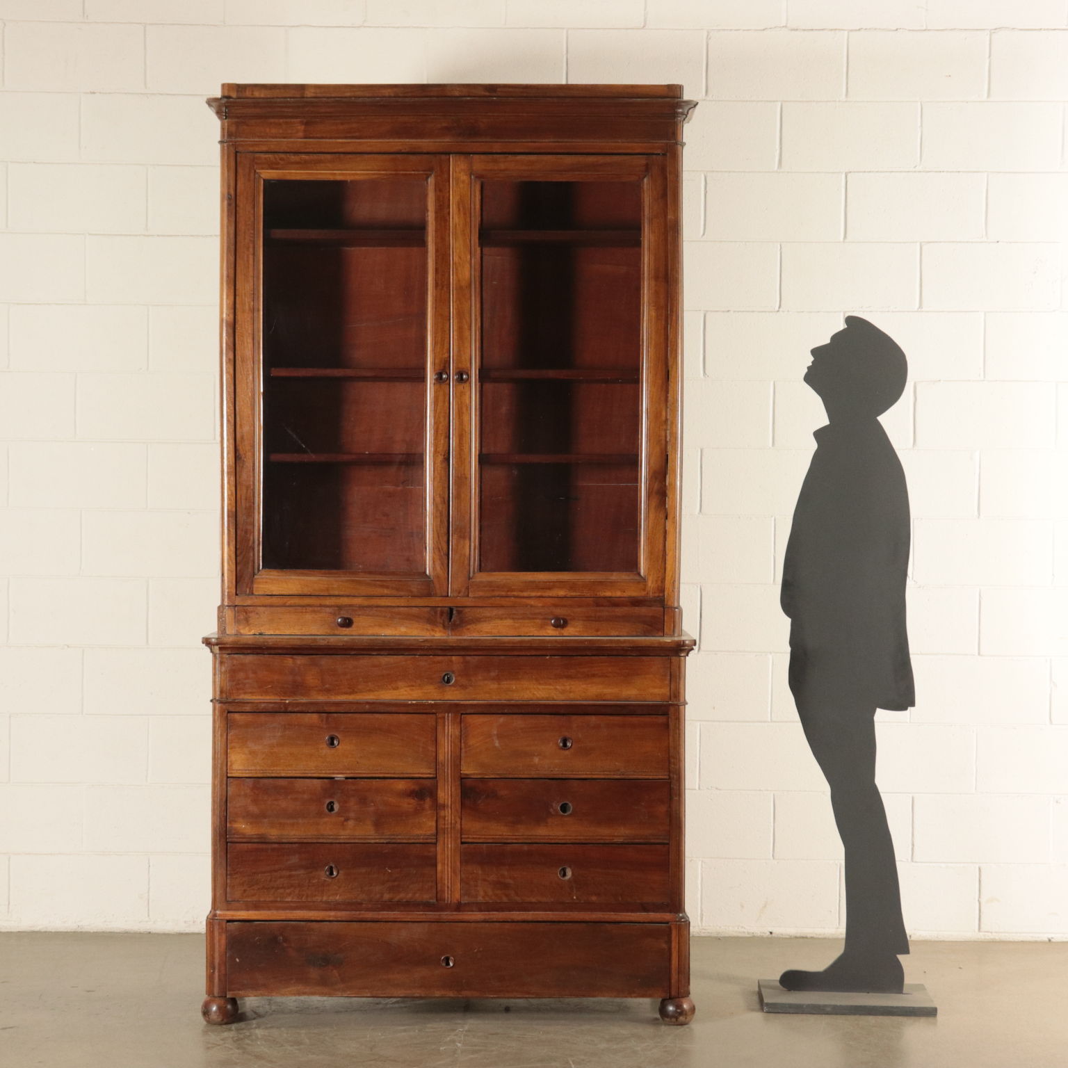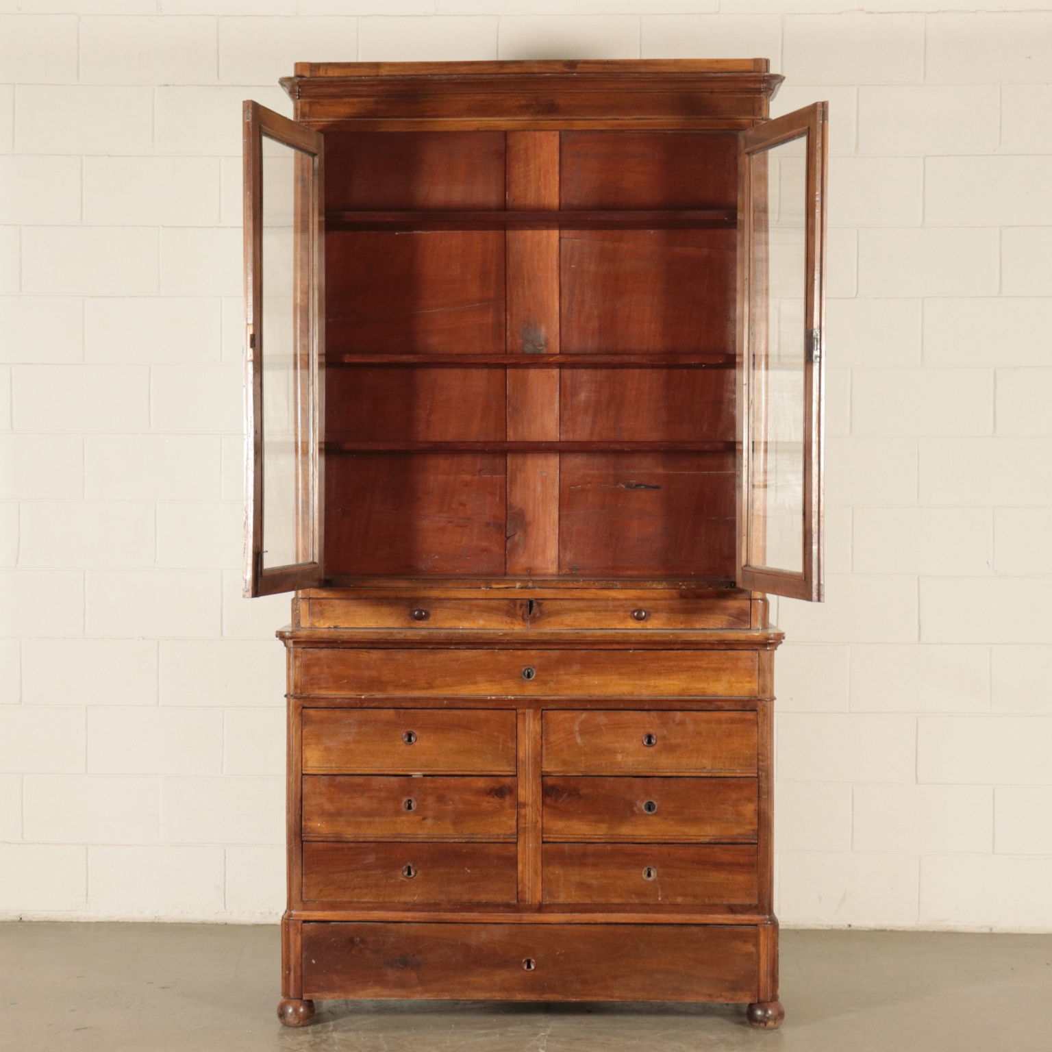 Libreria a due corpi retta da piedi torniti. Sul fronte otto cassetti. L'alzata con due ante con vetri presenta due cassettini allineati. Cappello con cornice.