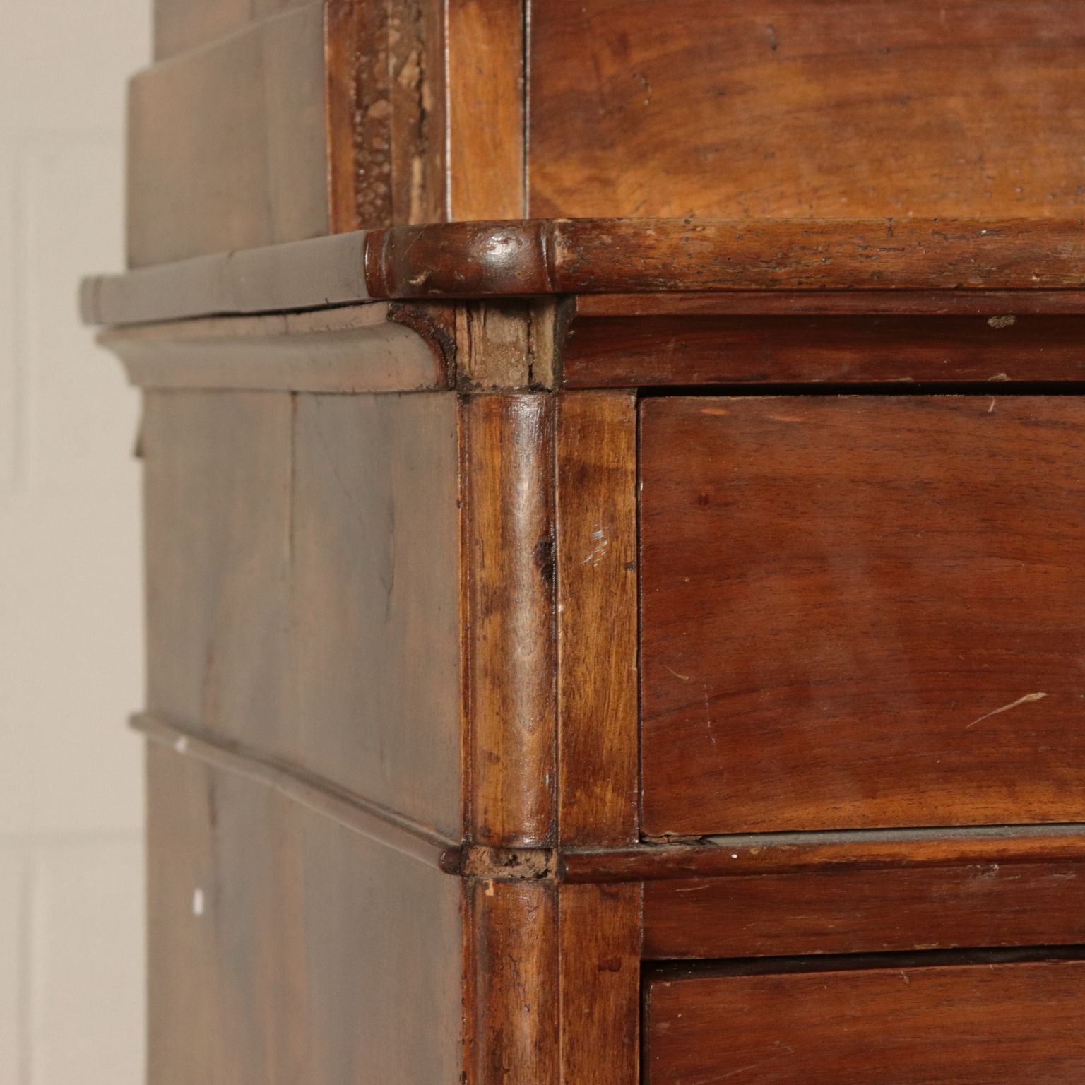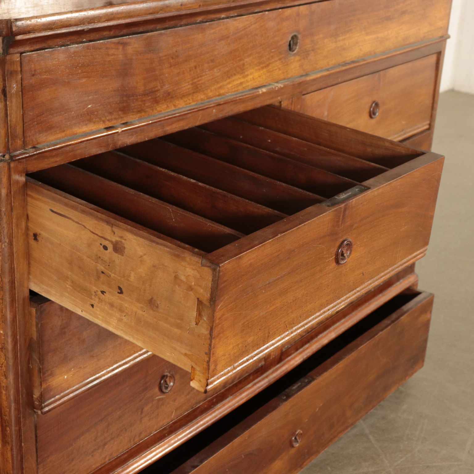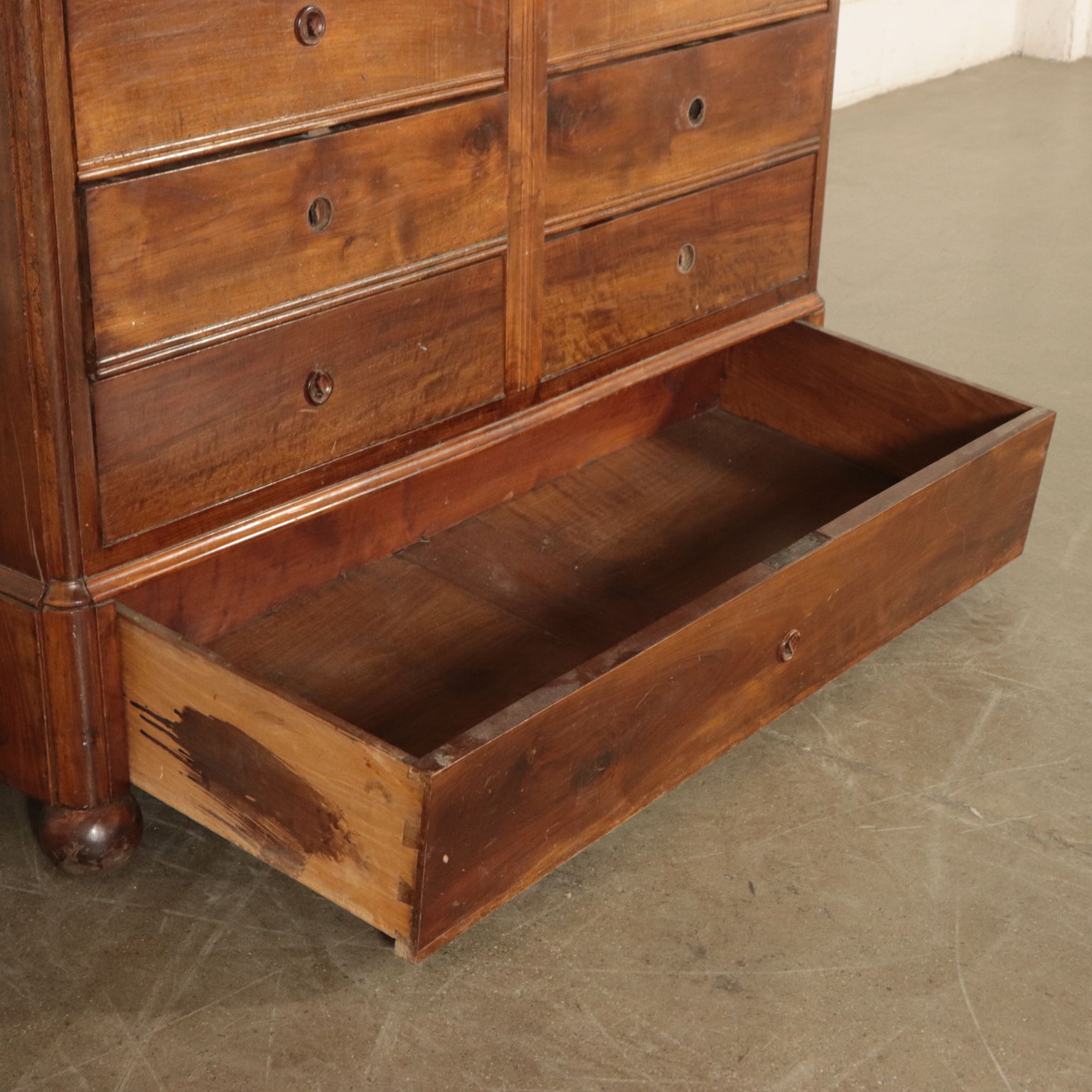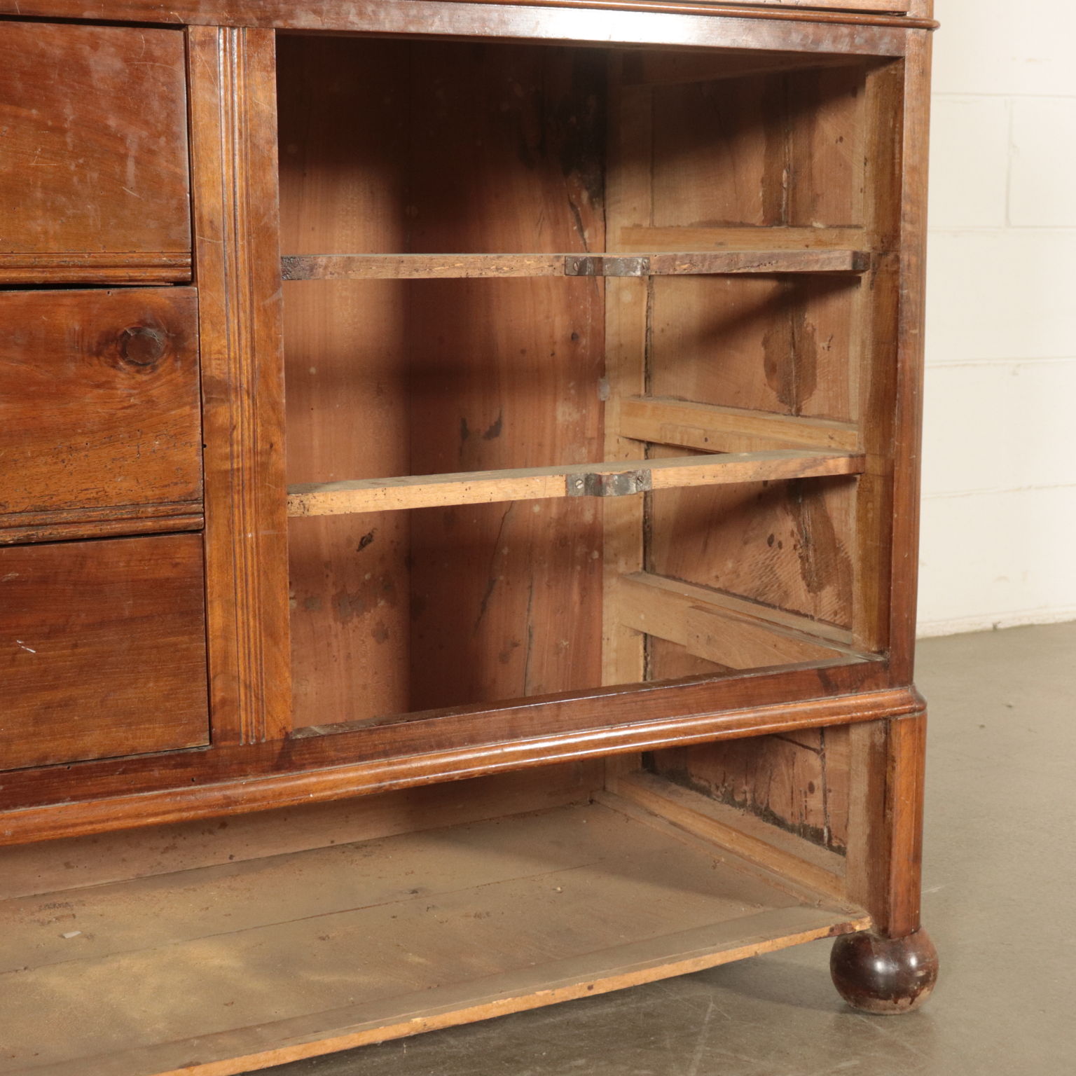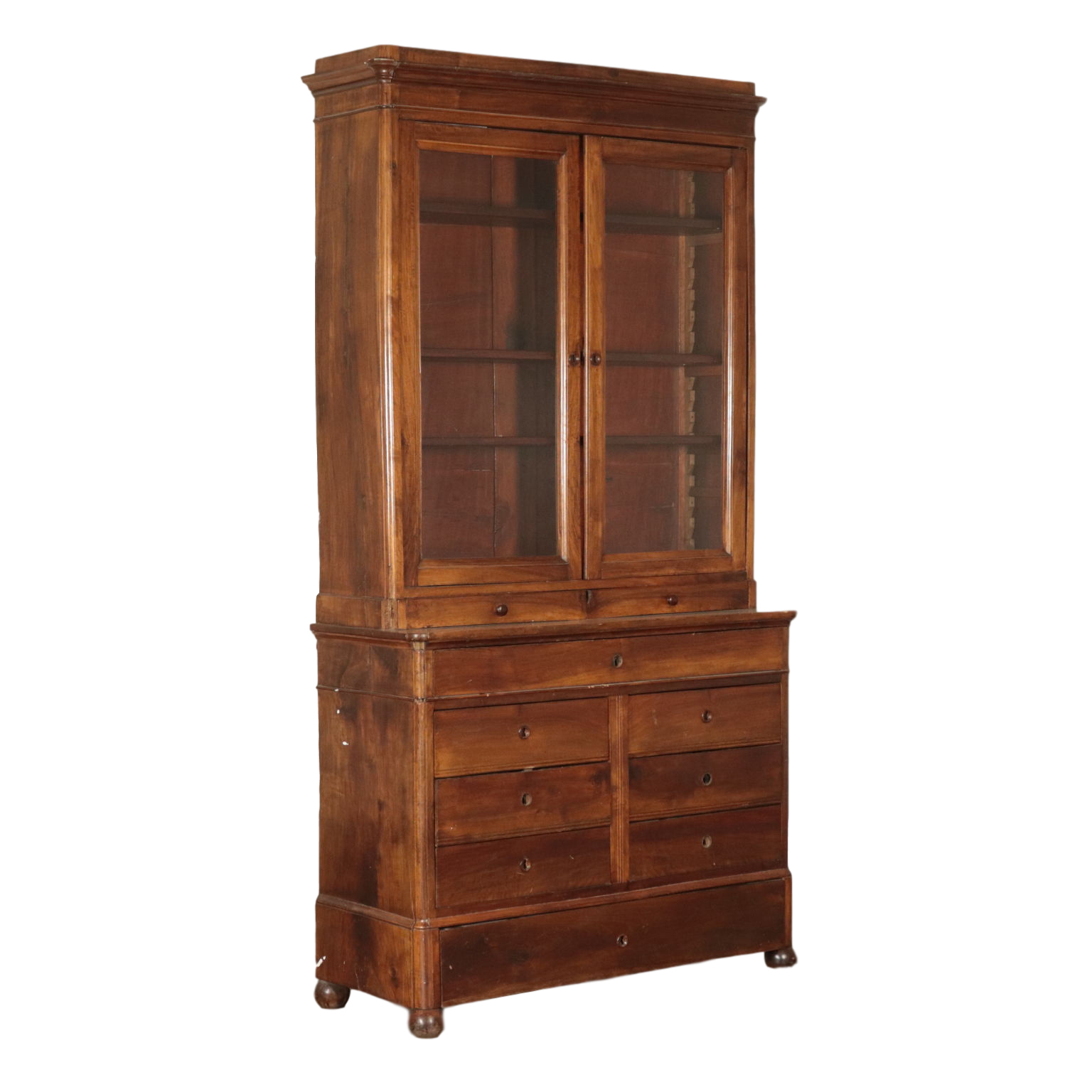 Libreria a due corpi retta da piedi torniti. Sul fronte otto cassetti. L'alzata con due ante con vetri presenta due cassettini allineati. Cappello con cornice.