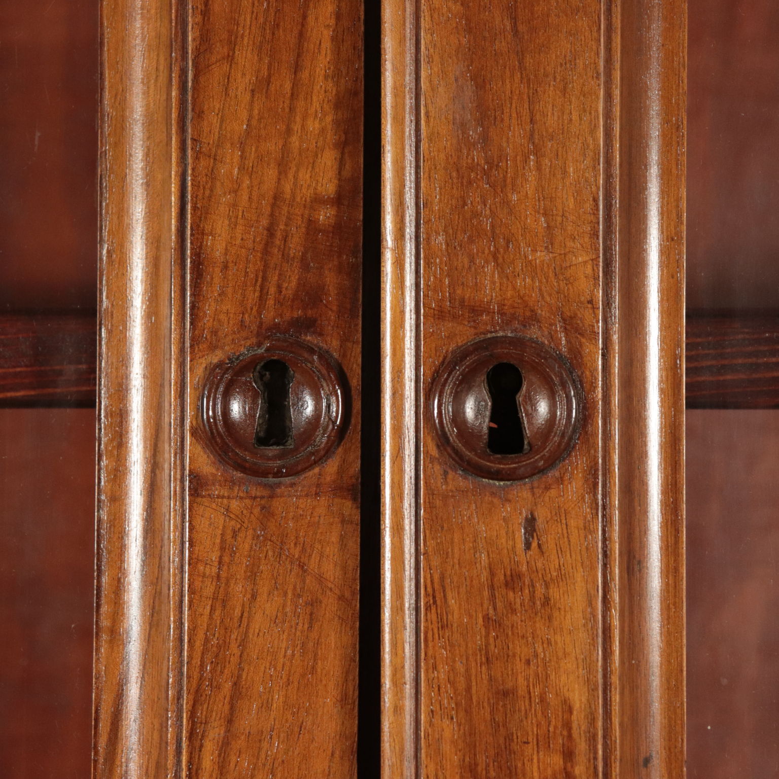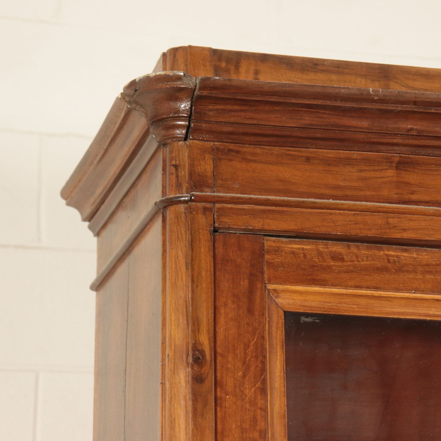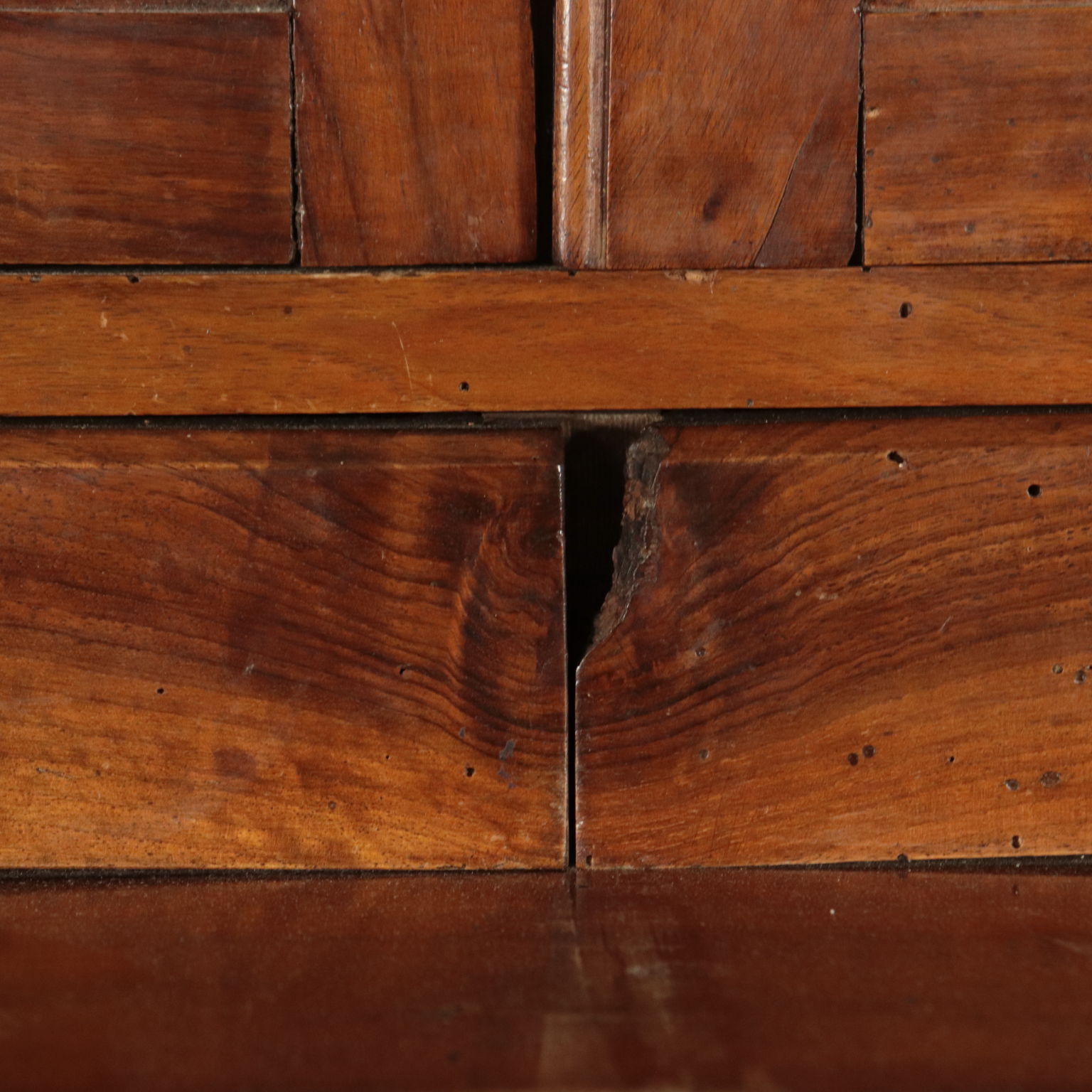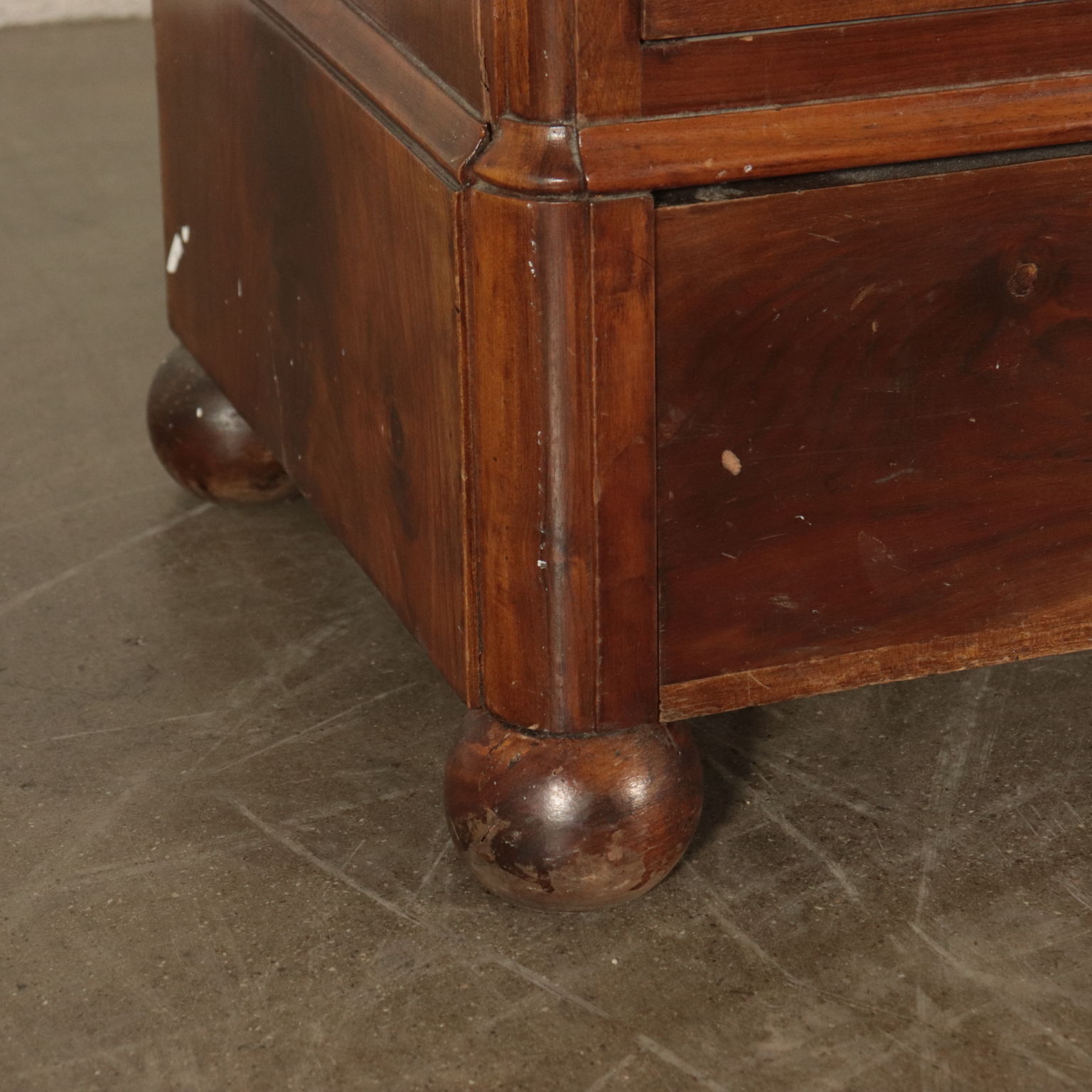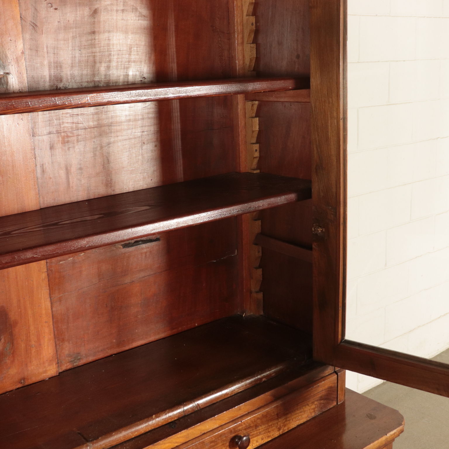 Libreria a due corpi retta da piedi torniti. Sul fronte otto cassetti. L'alzata con due ante con vetri presenta due cassettini allineati. Cappello con cornice.