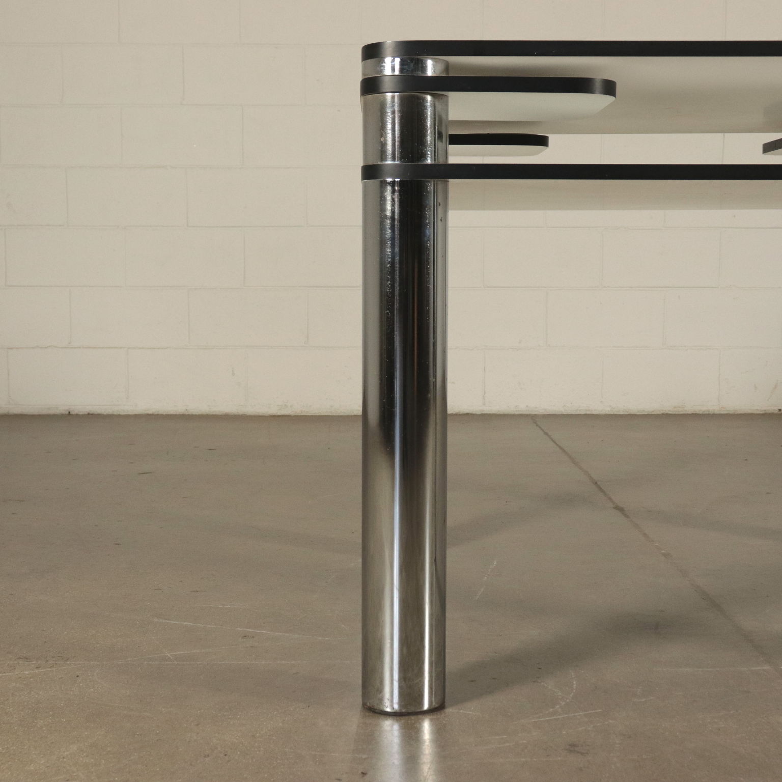 Tavolo da gioco con sottopiano e posacenere in legno laminato e gambe in metallo cromato.