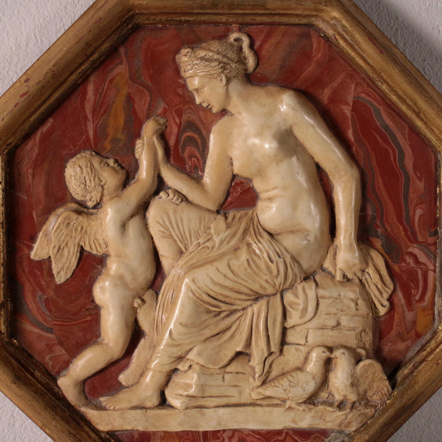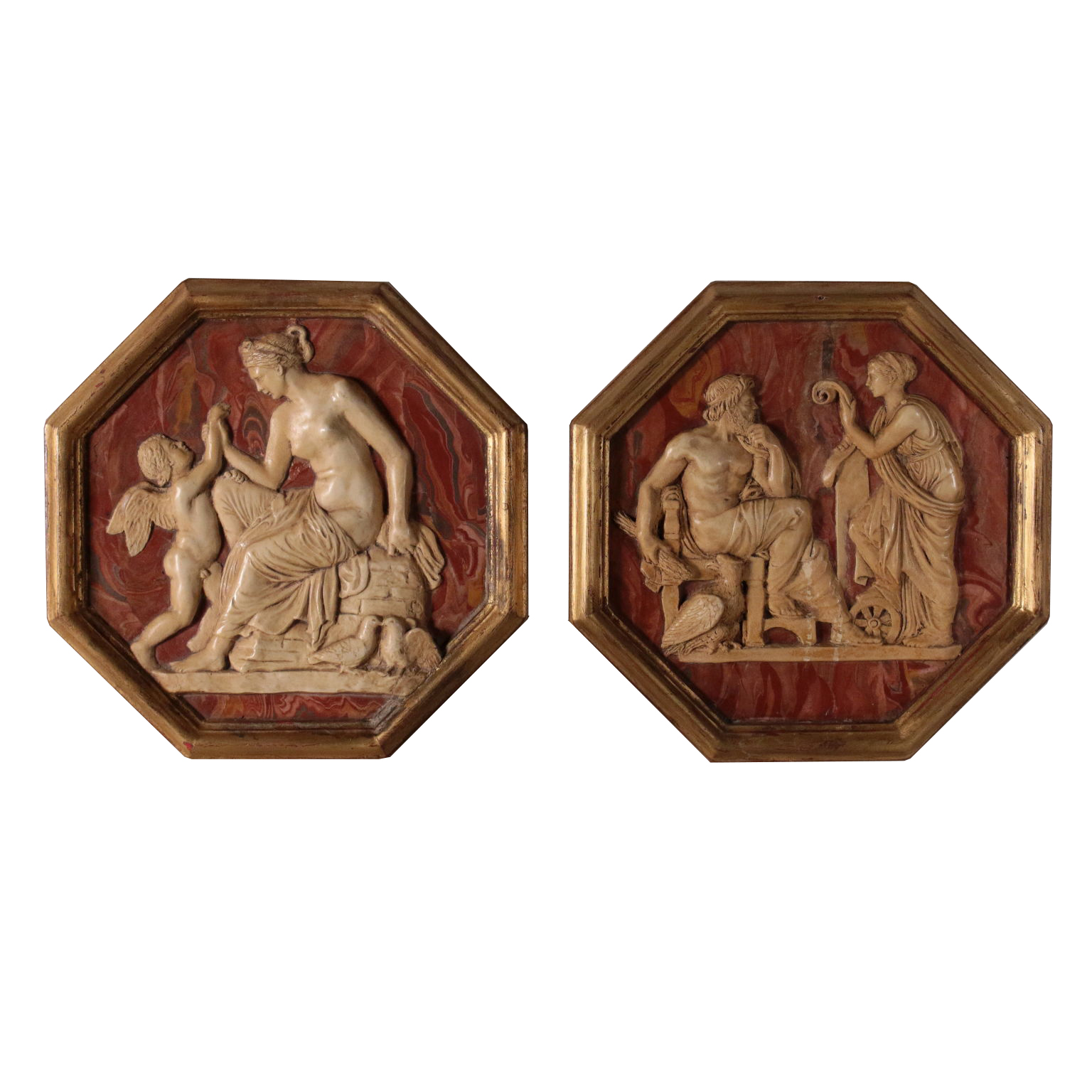 Coppia di formelle in gesso con cornice dorata e figure a rilievo di gusto neoclassico.