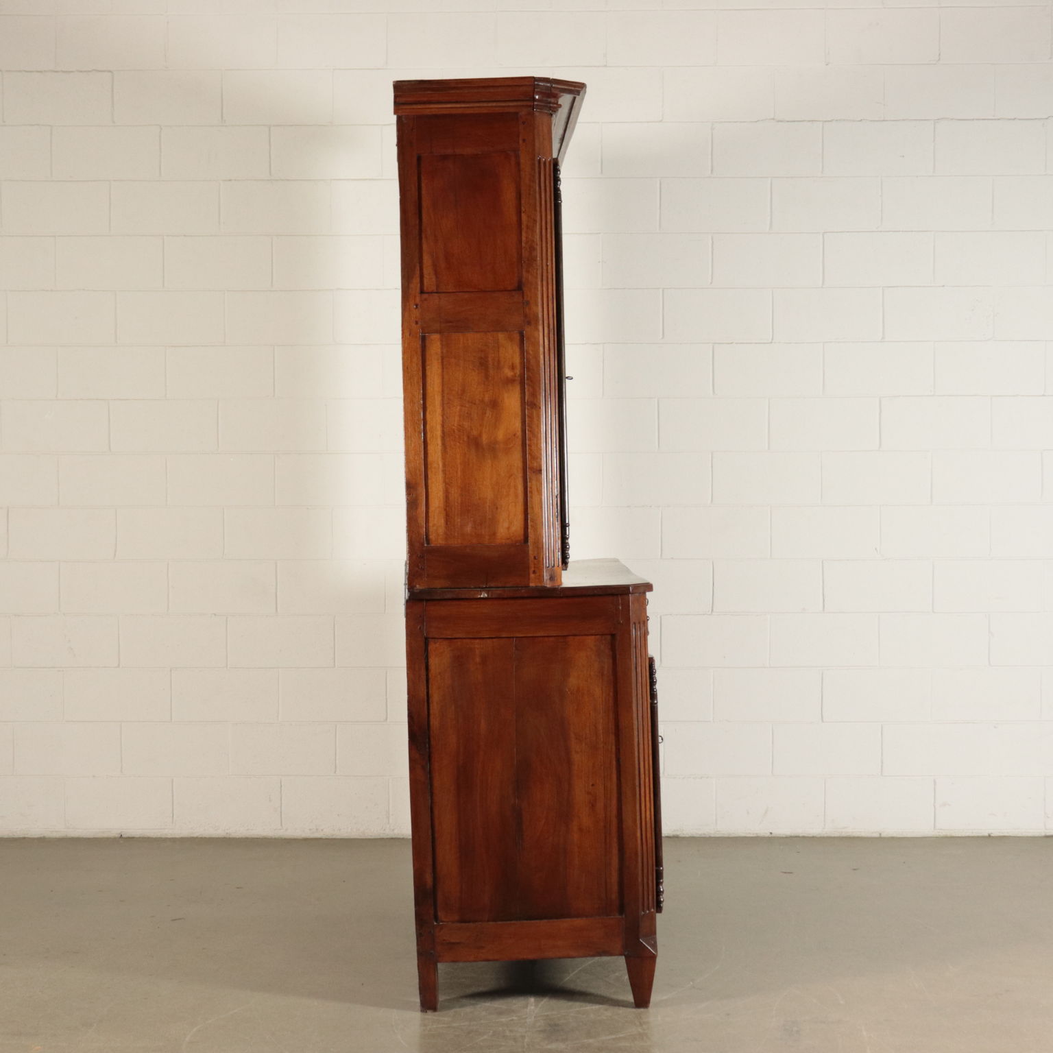 Credenza con alzata, presenta quattro ante con falso montante contrale scanalato a tre cassetti allineati sottopiano. Grande cerniere in ferro a vista. Ante con pannelli sagomati e bocchette in ferro lavorato.