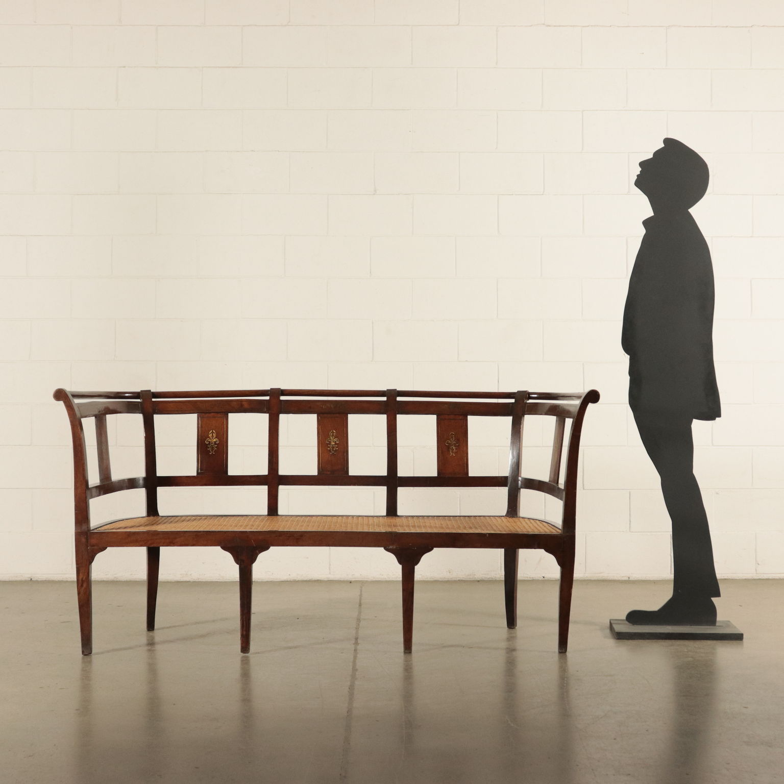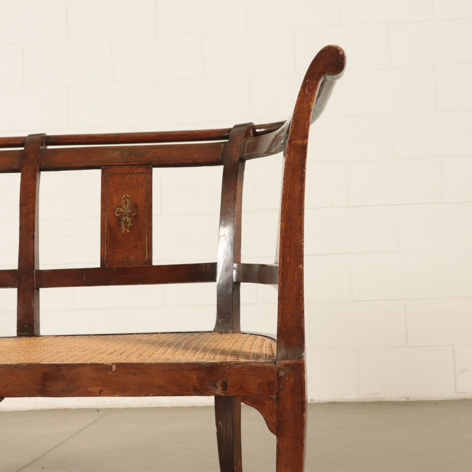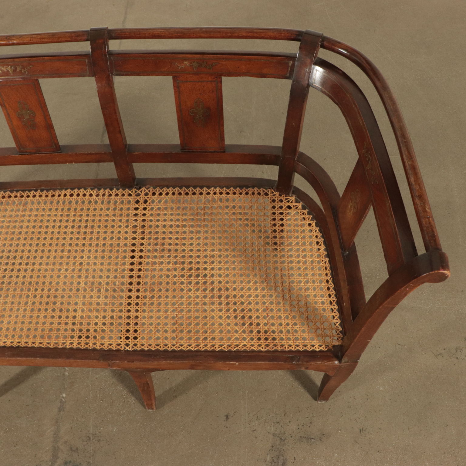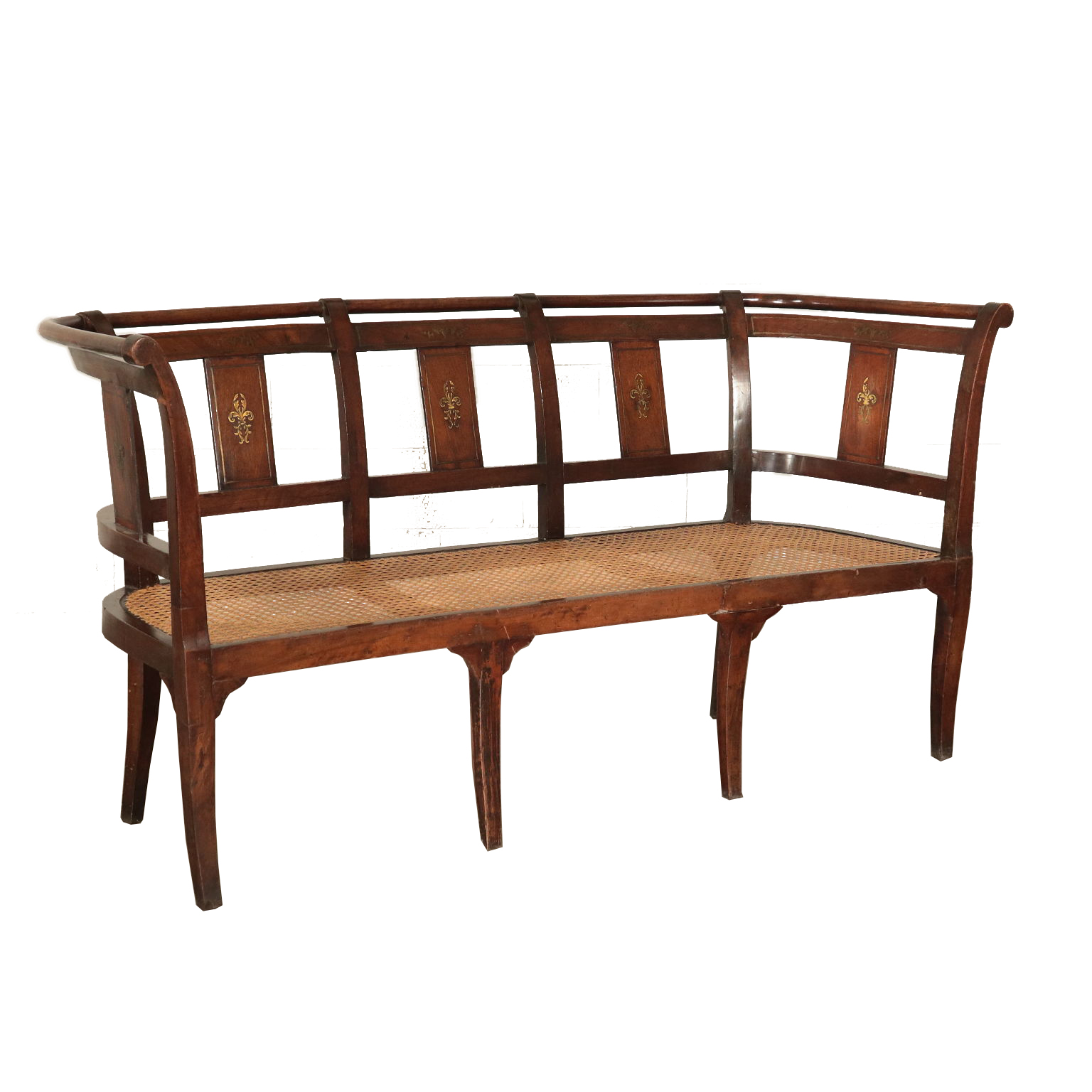 Divano panchetto retto da gambe a sciabola. Presenta schienale a giorno con cartelle con intarsi in ottone. Seduta incannucciata.