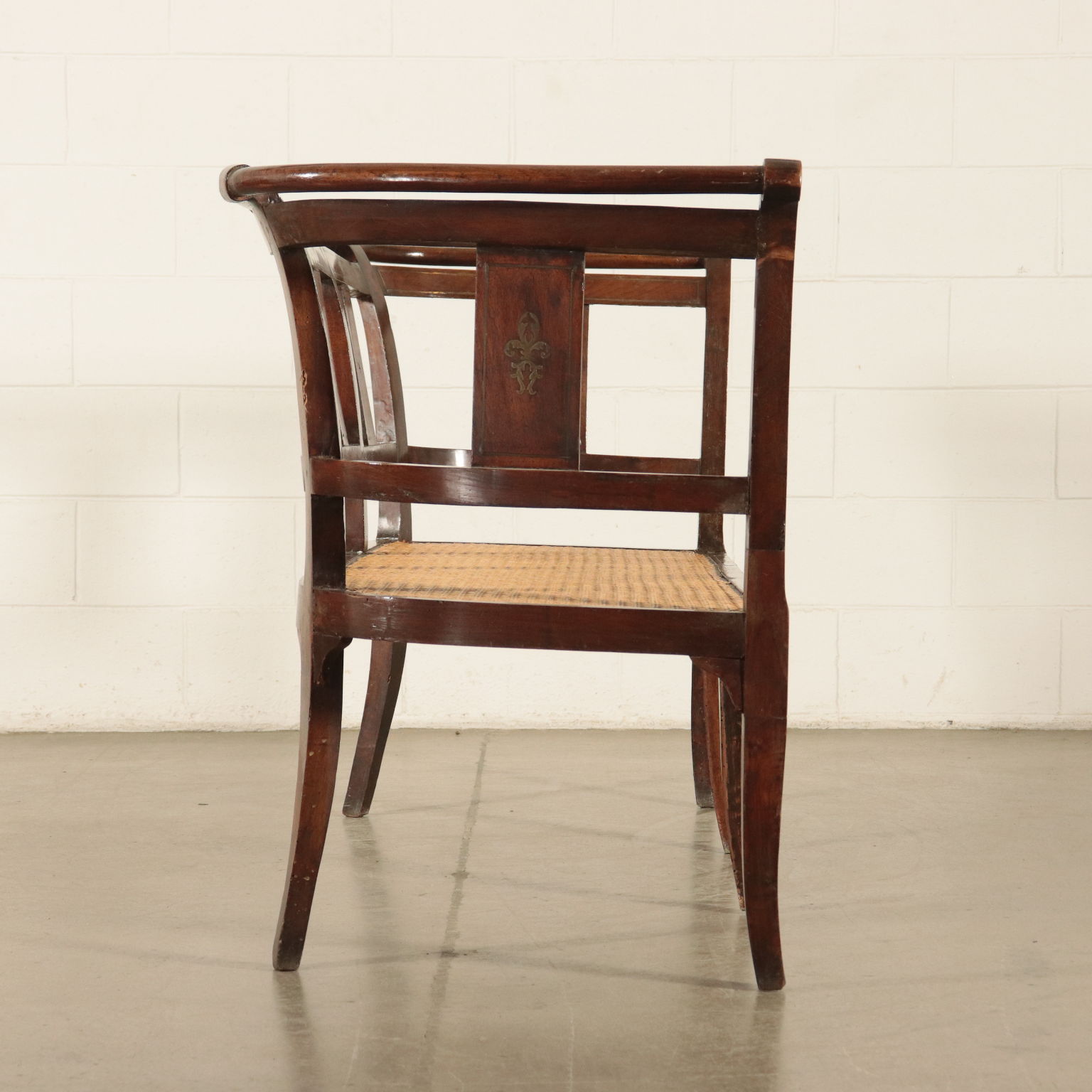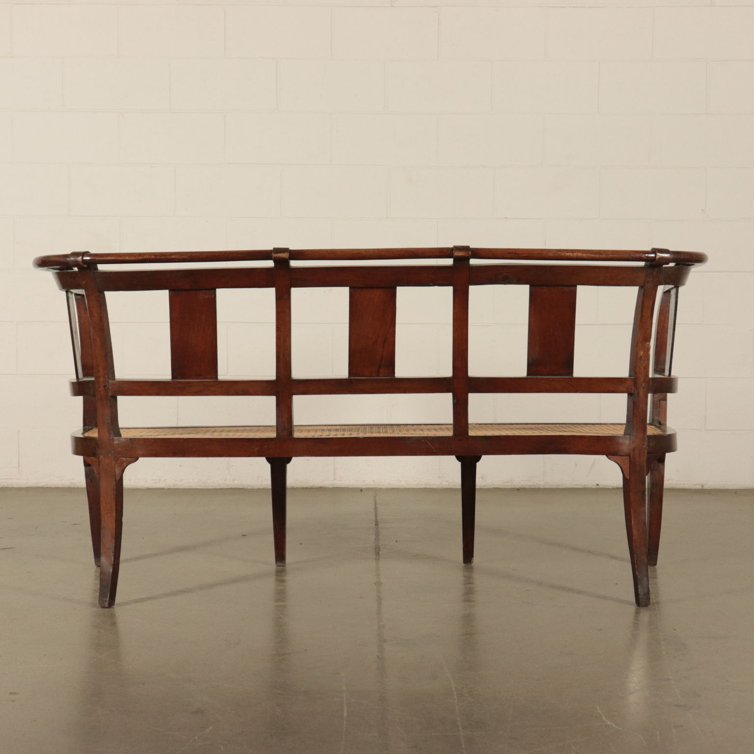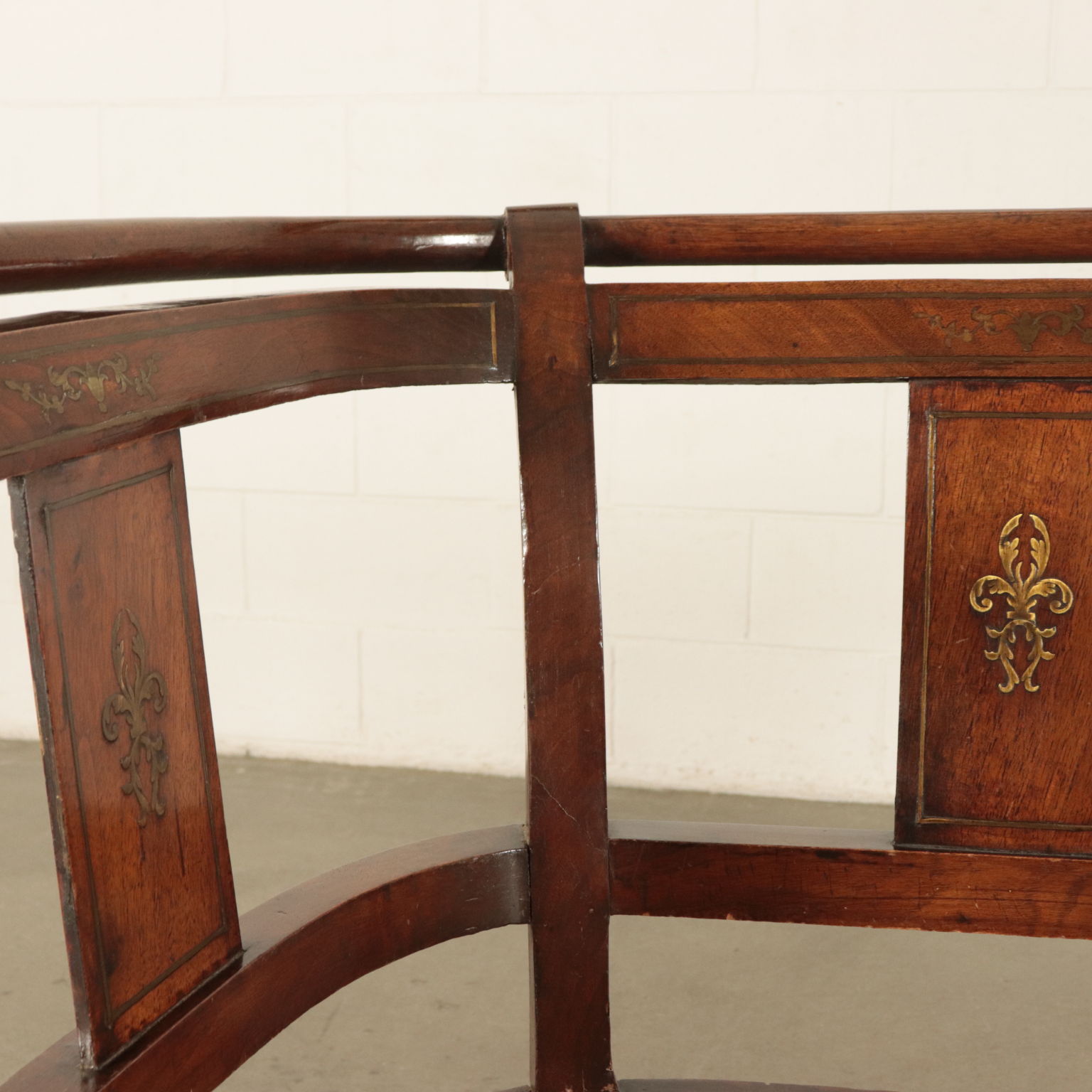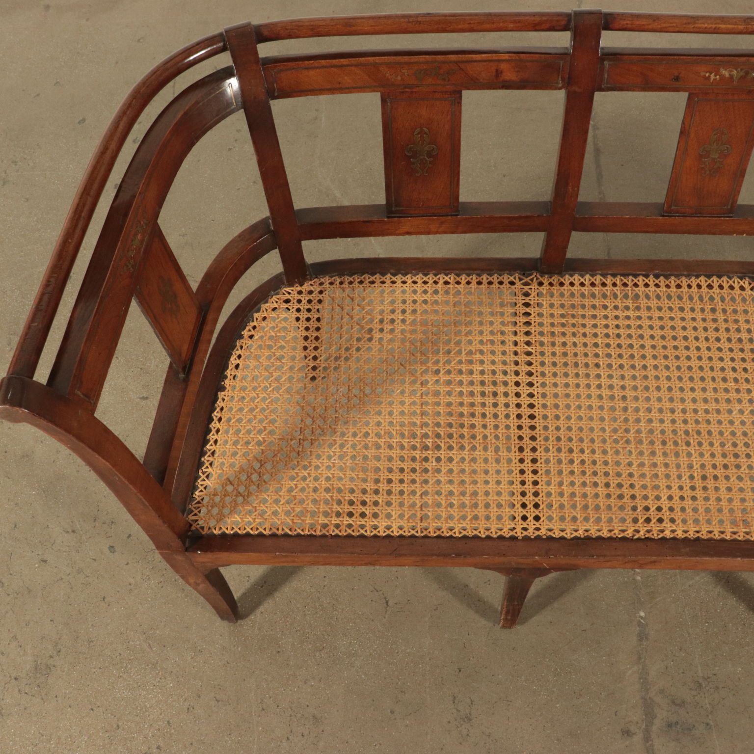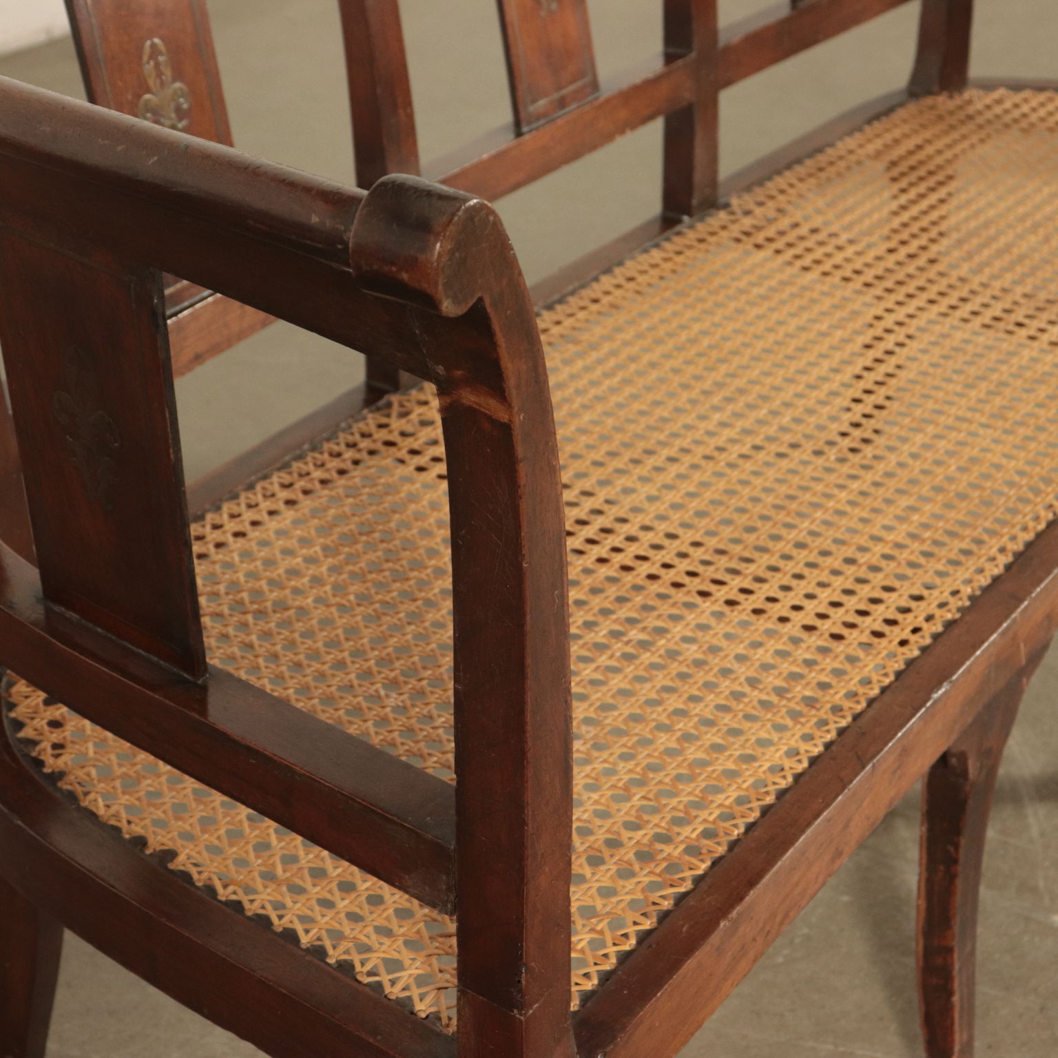 Divano panchetto retto da gambe a sciabola. Presenta schienale a giorno con cartelle con intarsi in ottone. Seduta incannucciata.