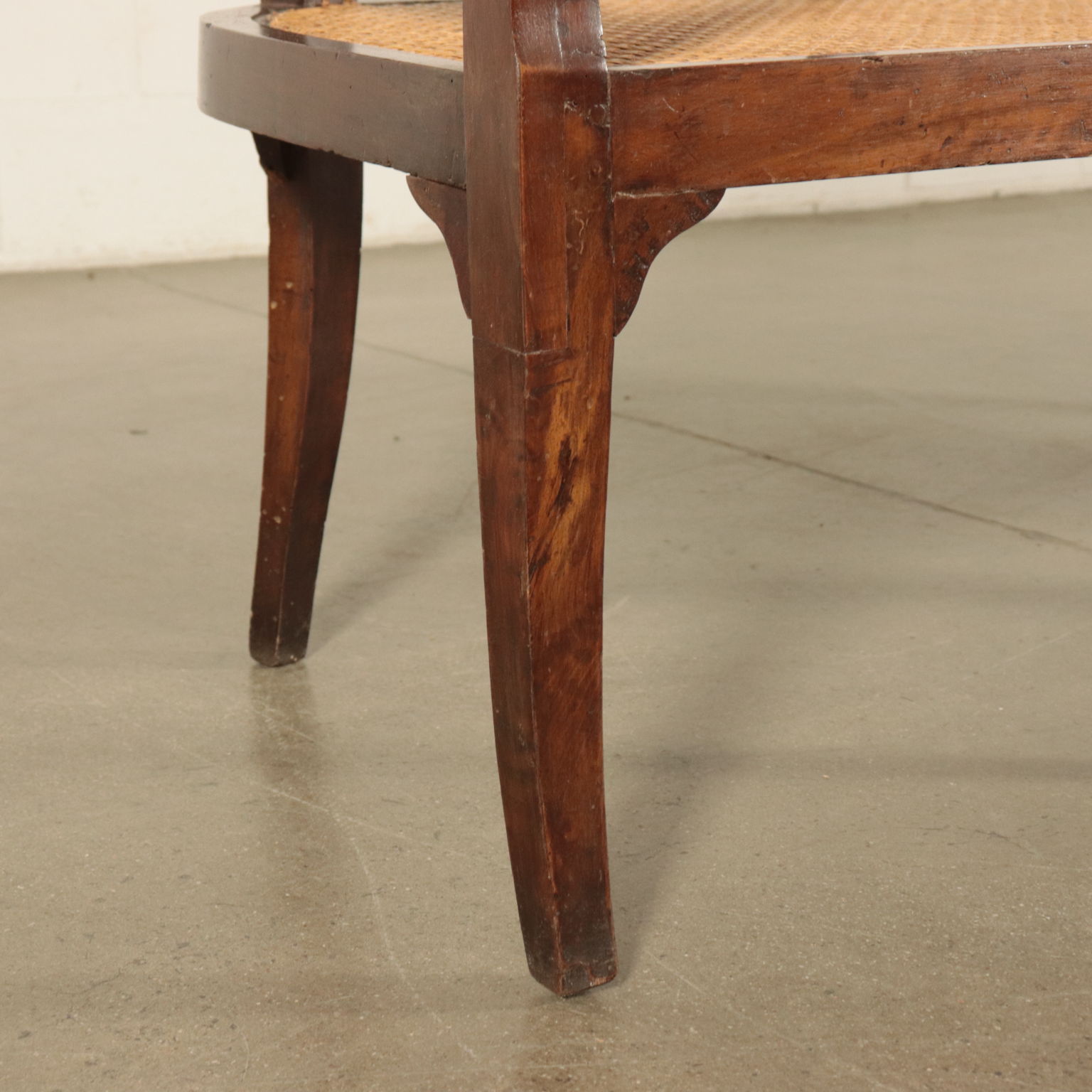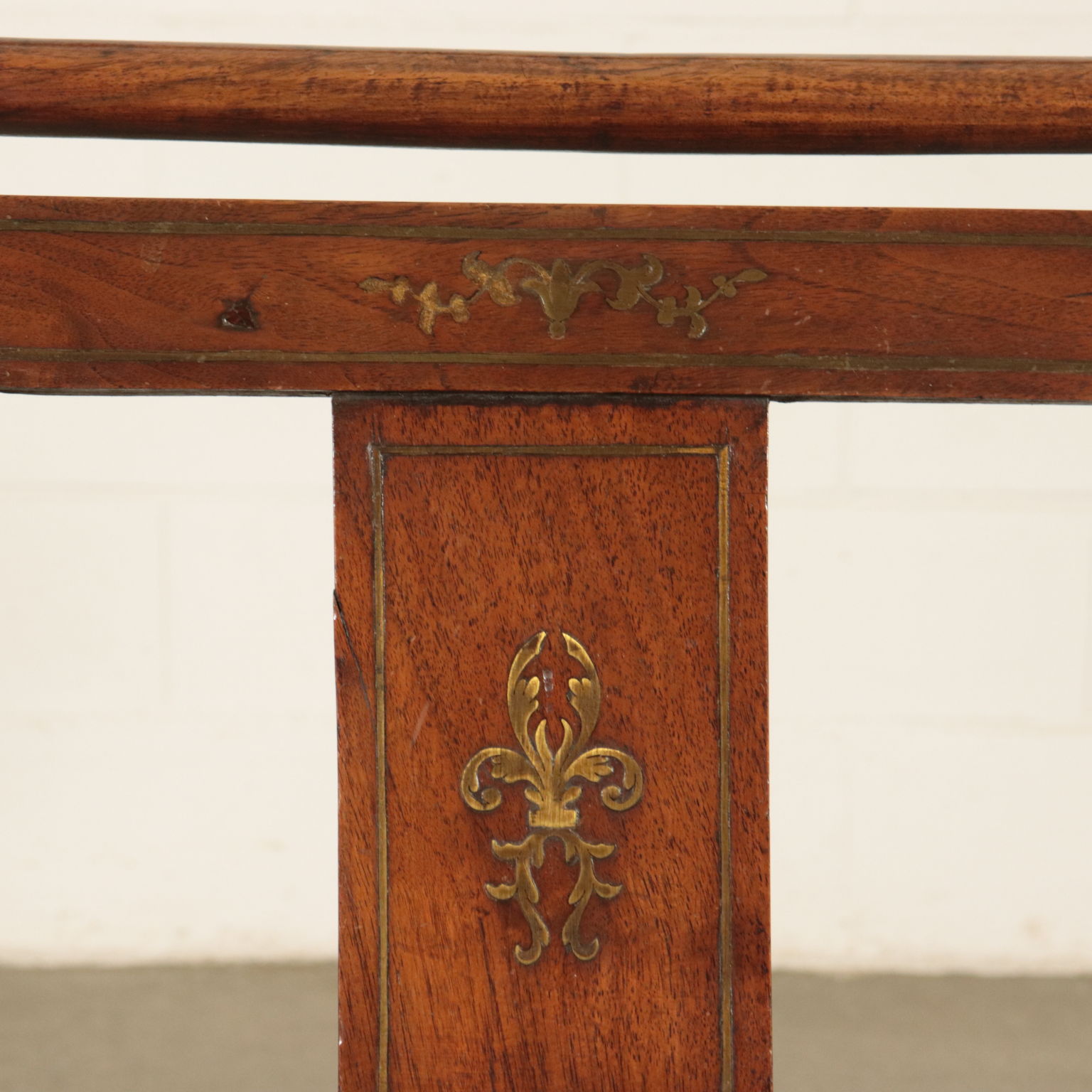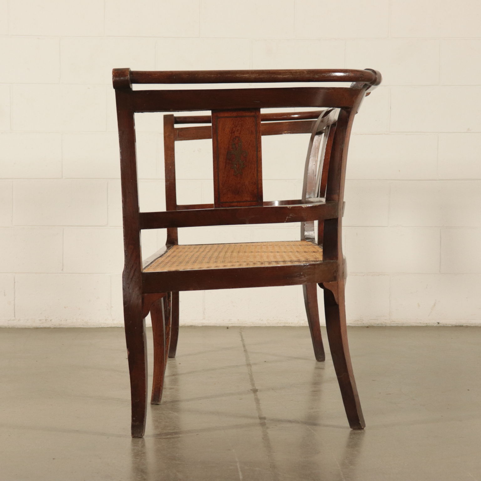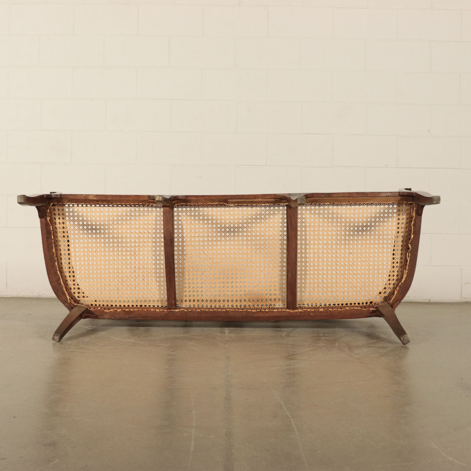 Divano panchetto retto da gambe a sciabola. Presenta schienale a giorno con cartelle con intarsi in ottone. Seduta incannucciata.