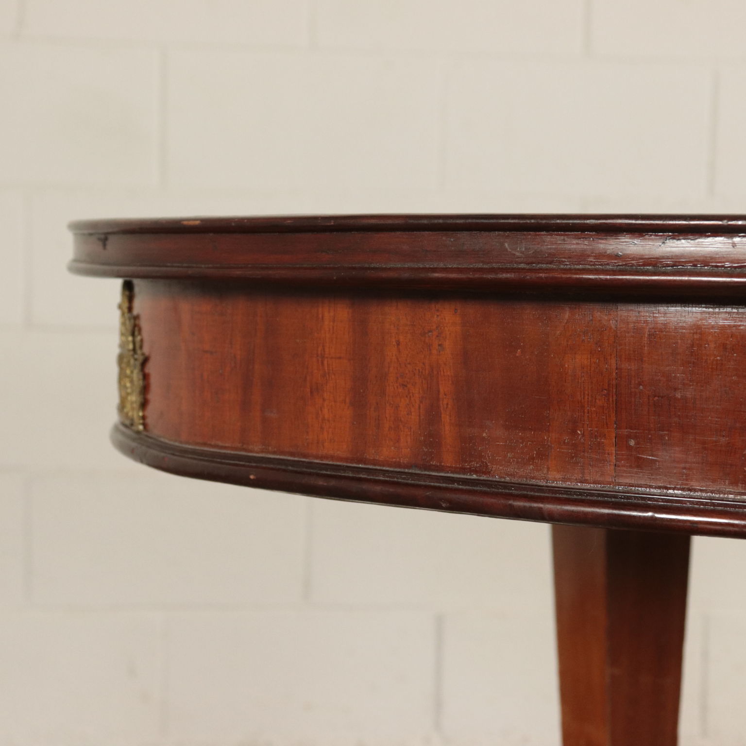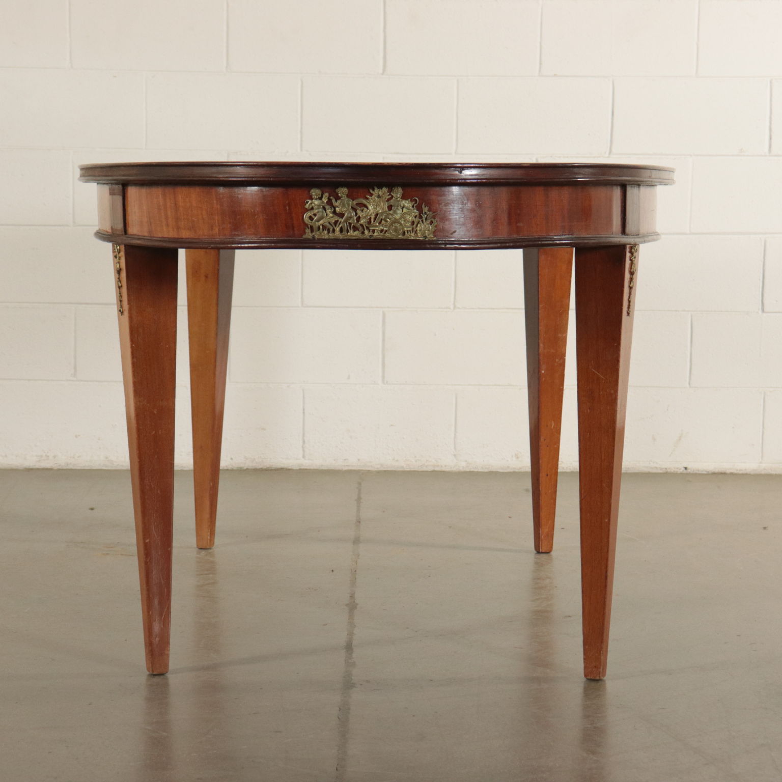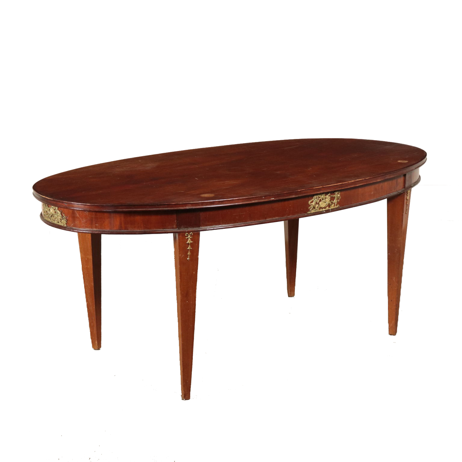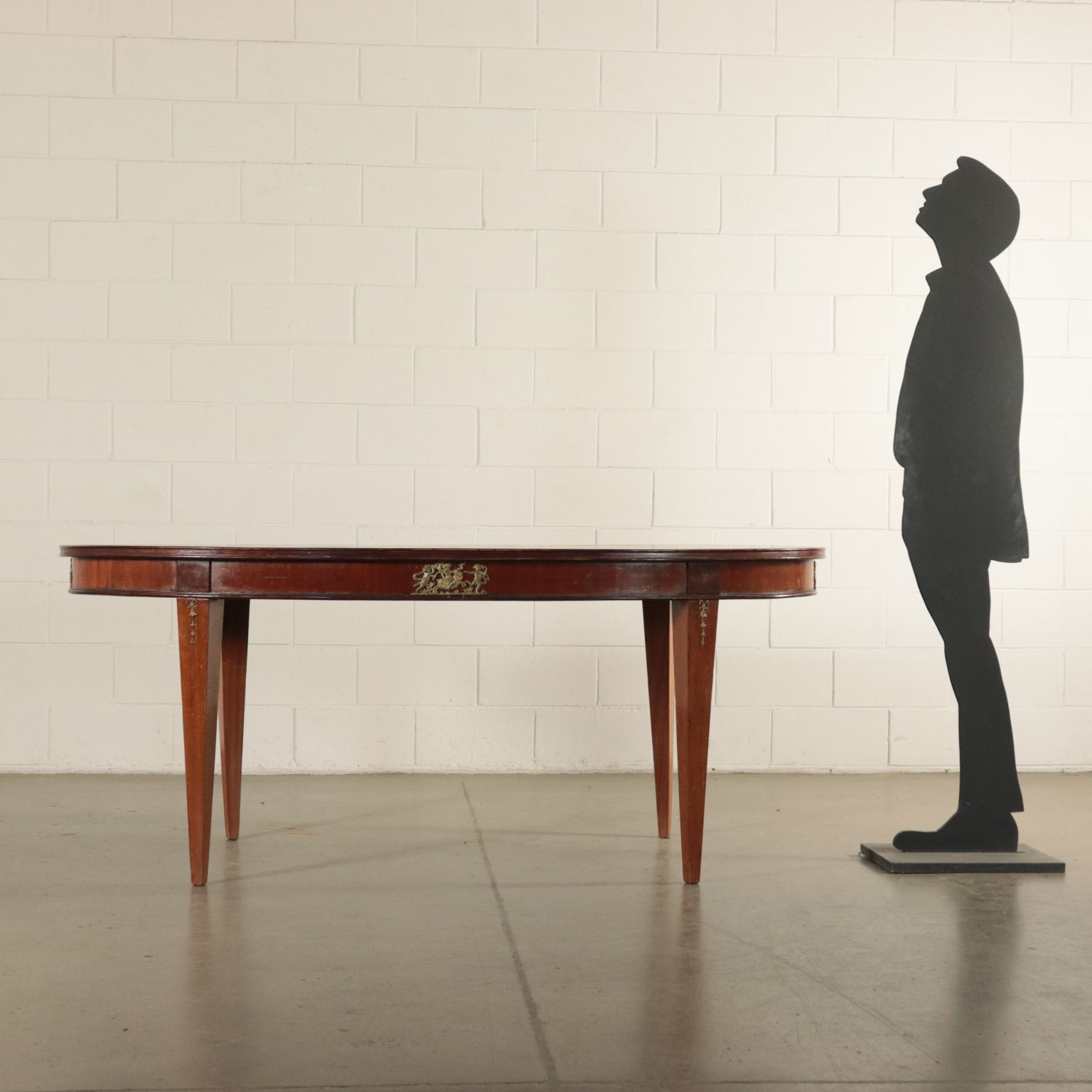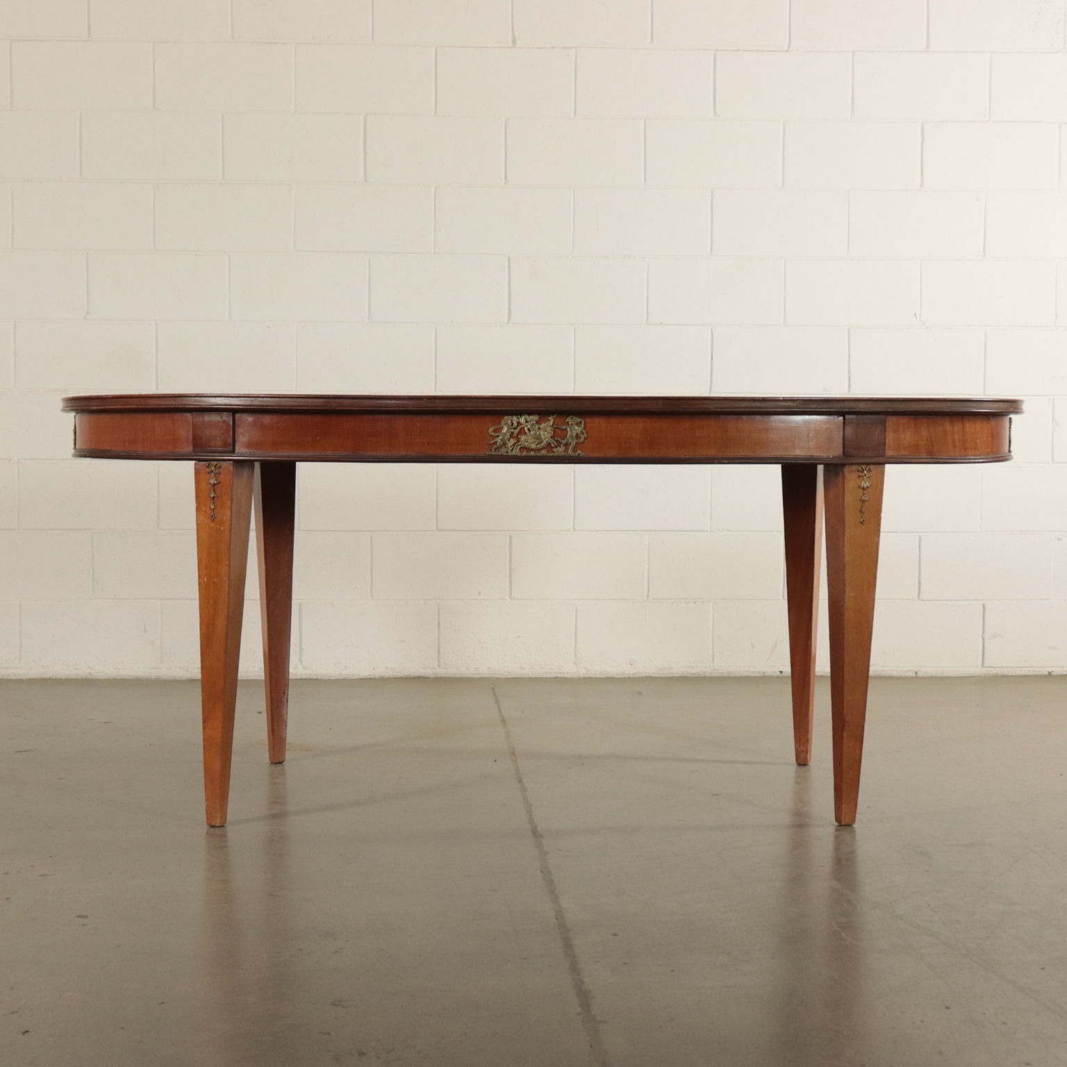 Grande tavolo retto da gambe troncopiramidali con fregi in bronzo. Piano ovale bordato da cornice.