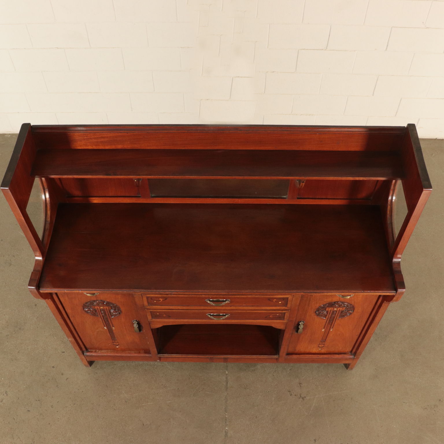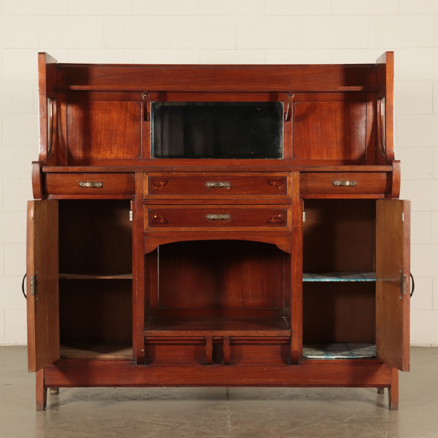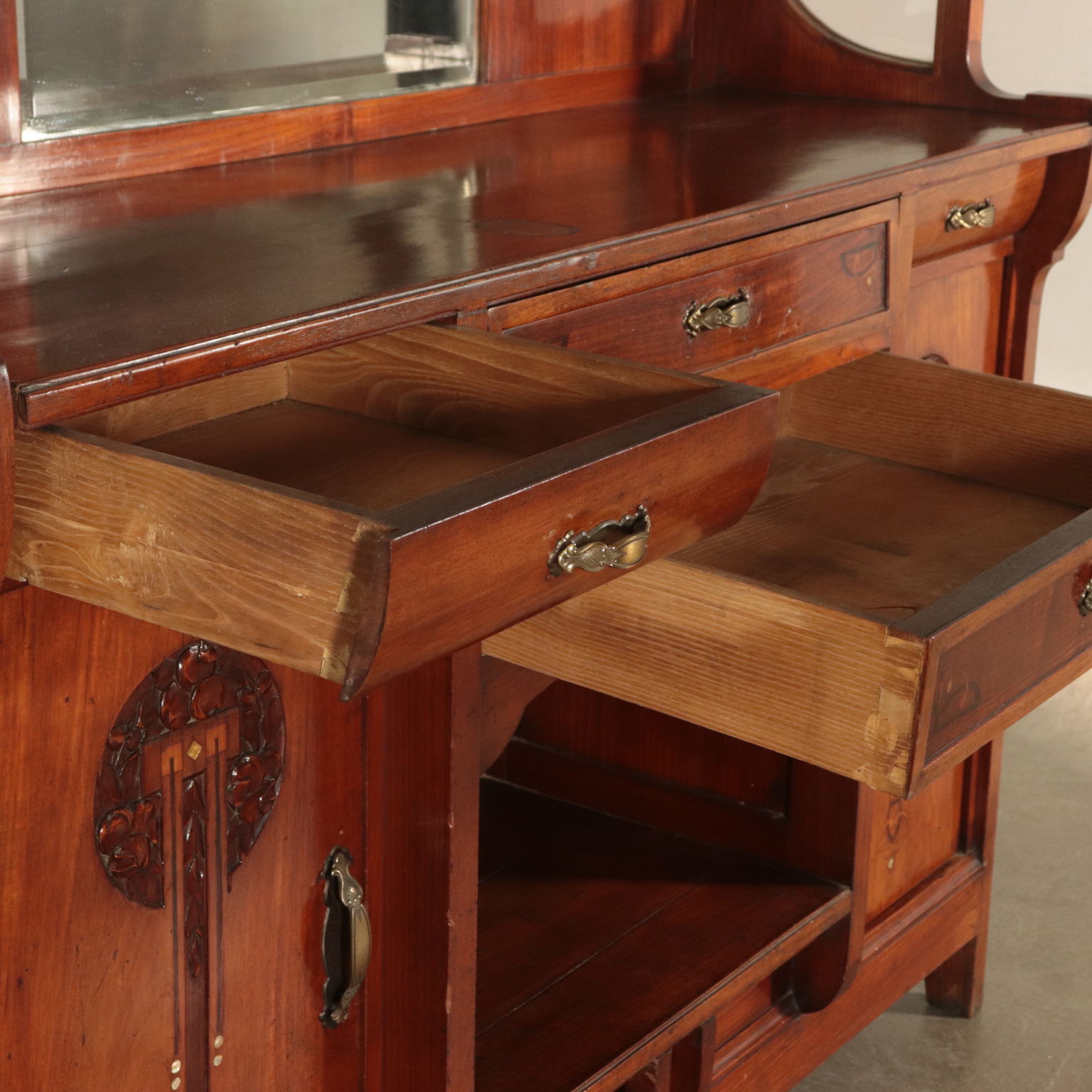 Credenza liberty dal fronte spezzato. Presenta quattro cassetti, due ante e un vano a giorno centrale. Alzata con vetri bisellati e specchio molato. Sul fronte intagli ed intarsi in essenze varie.