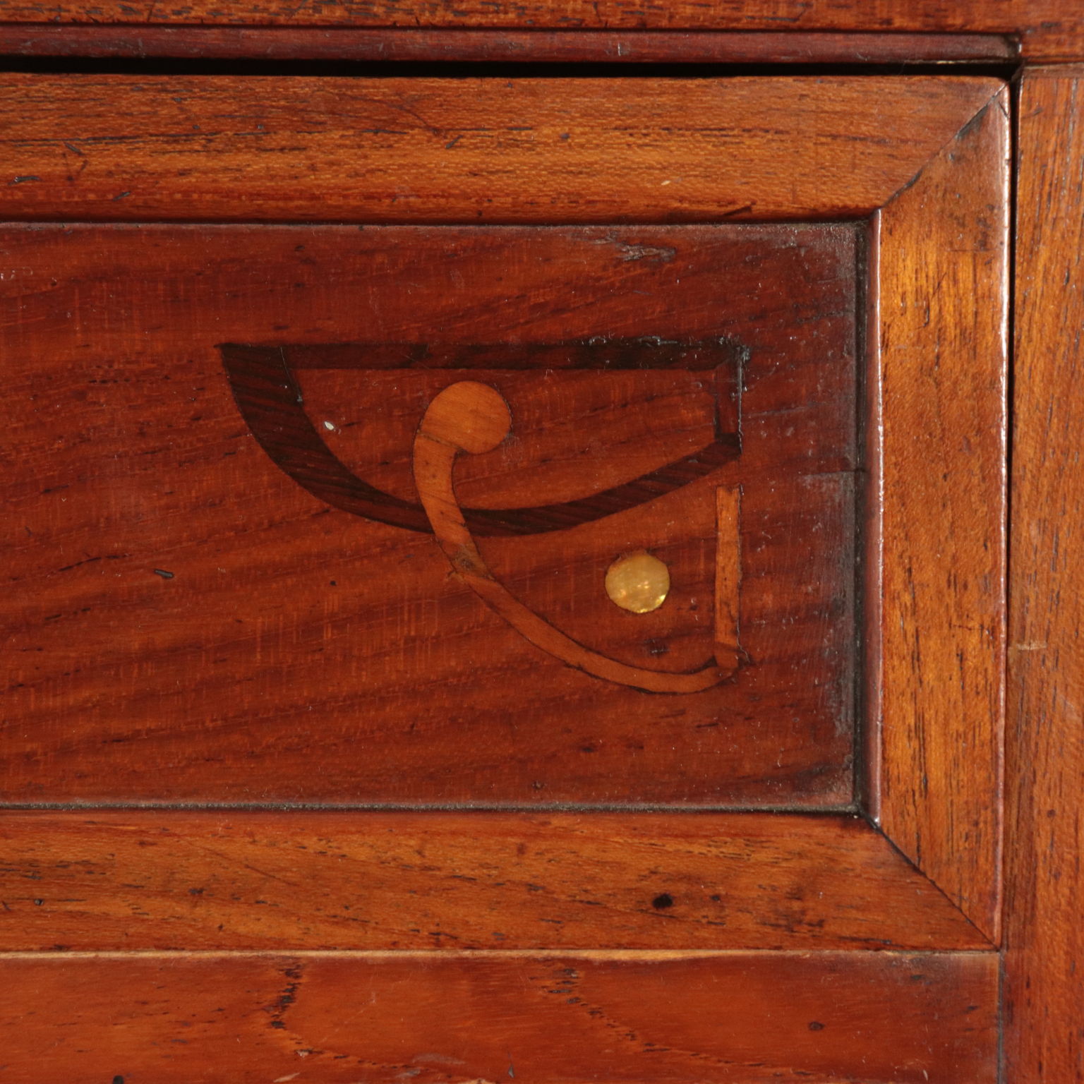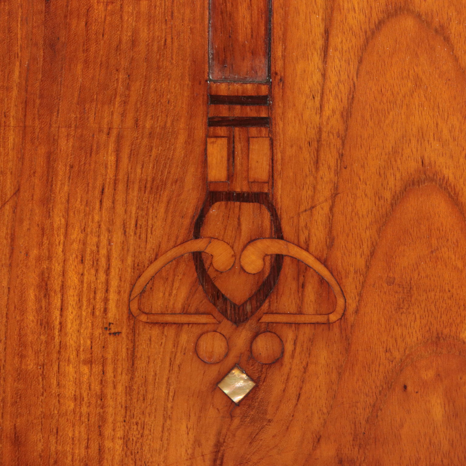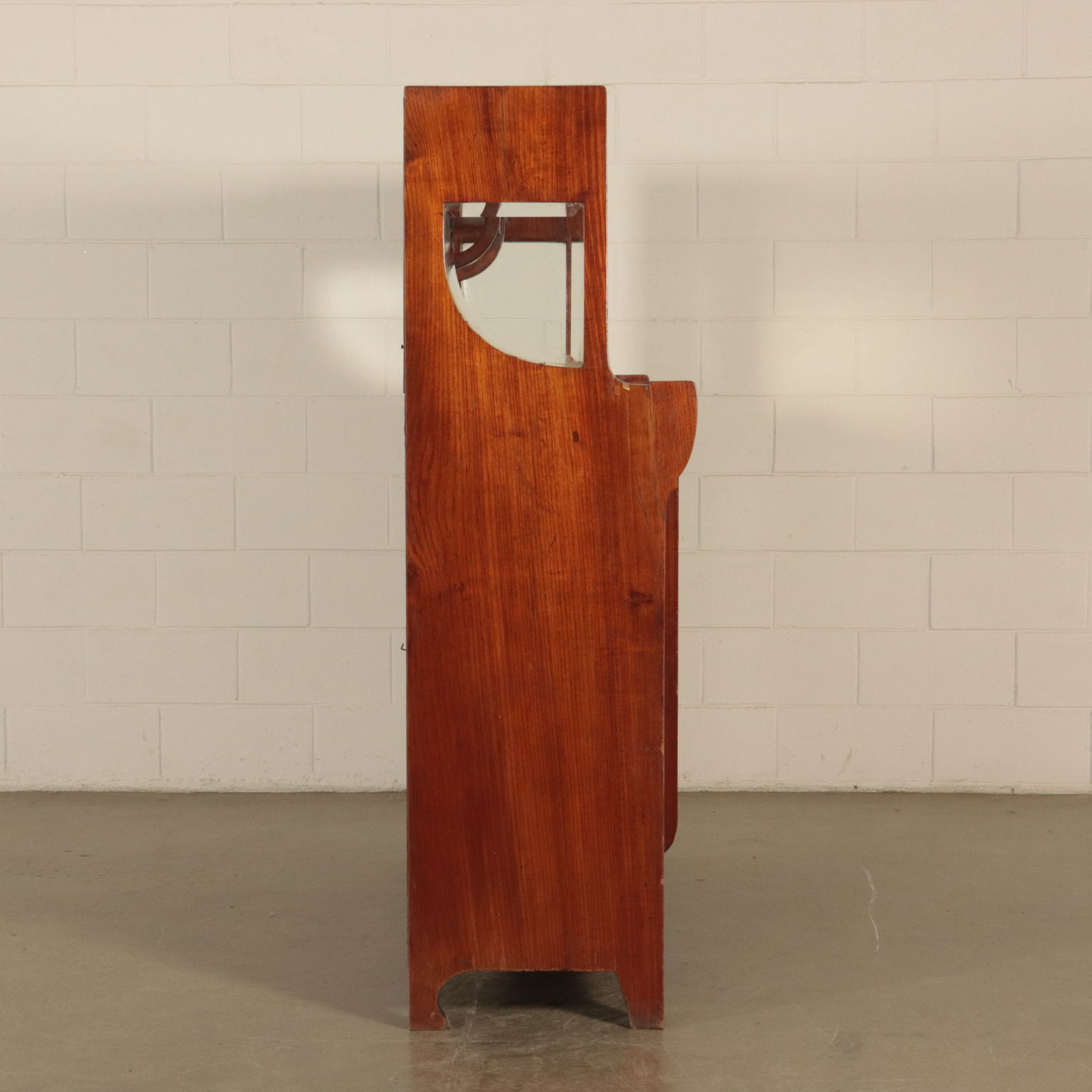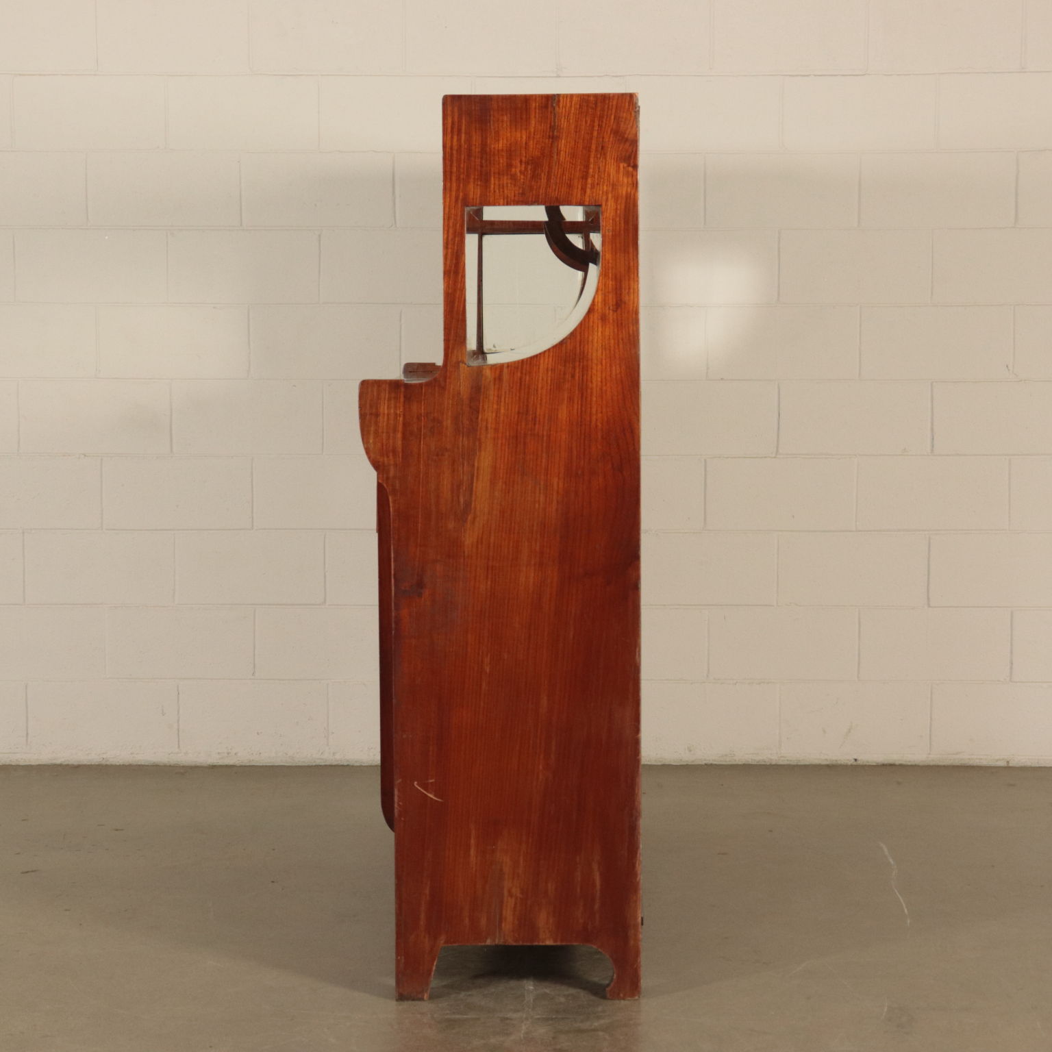 Credenza liberty dal fronte spezzato. Presenta quattro cassetti, due ante e un vano a giorno centrale. Alzata con vetri bisellati e specchio molato. Sul fronte intagli ed intarsi in essenze varie.