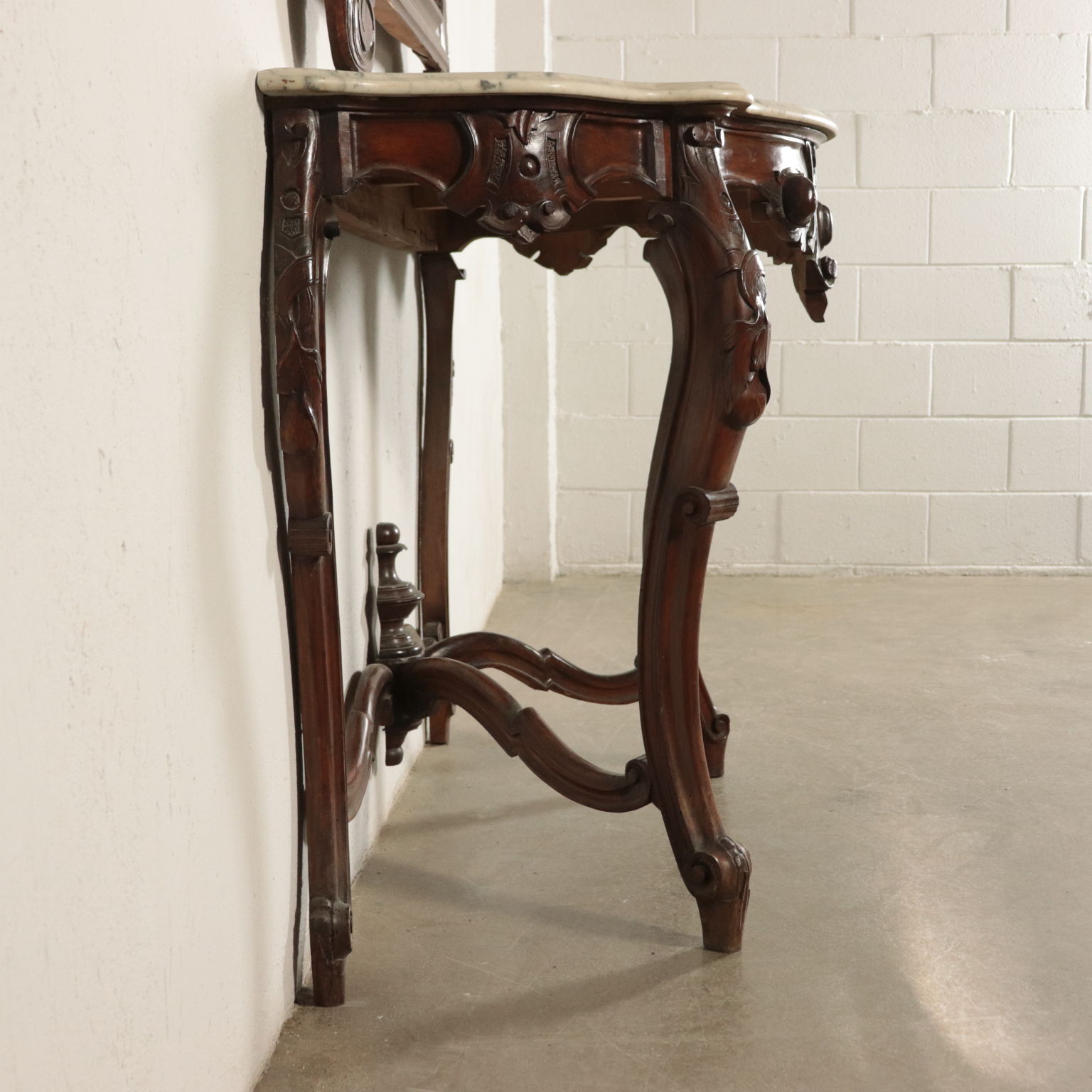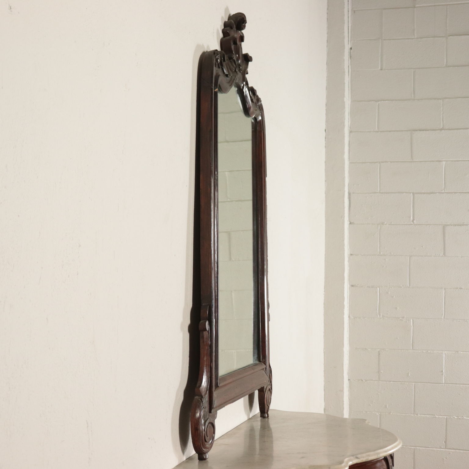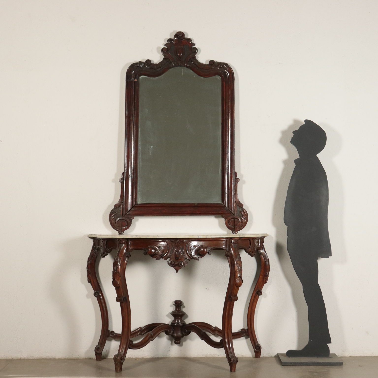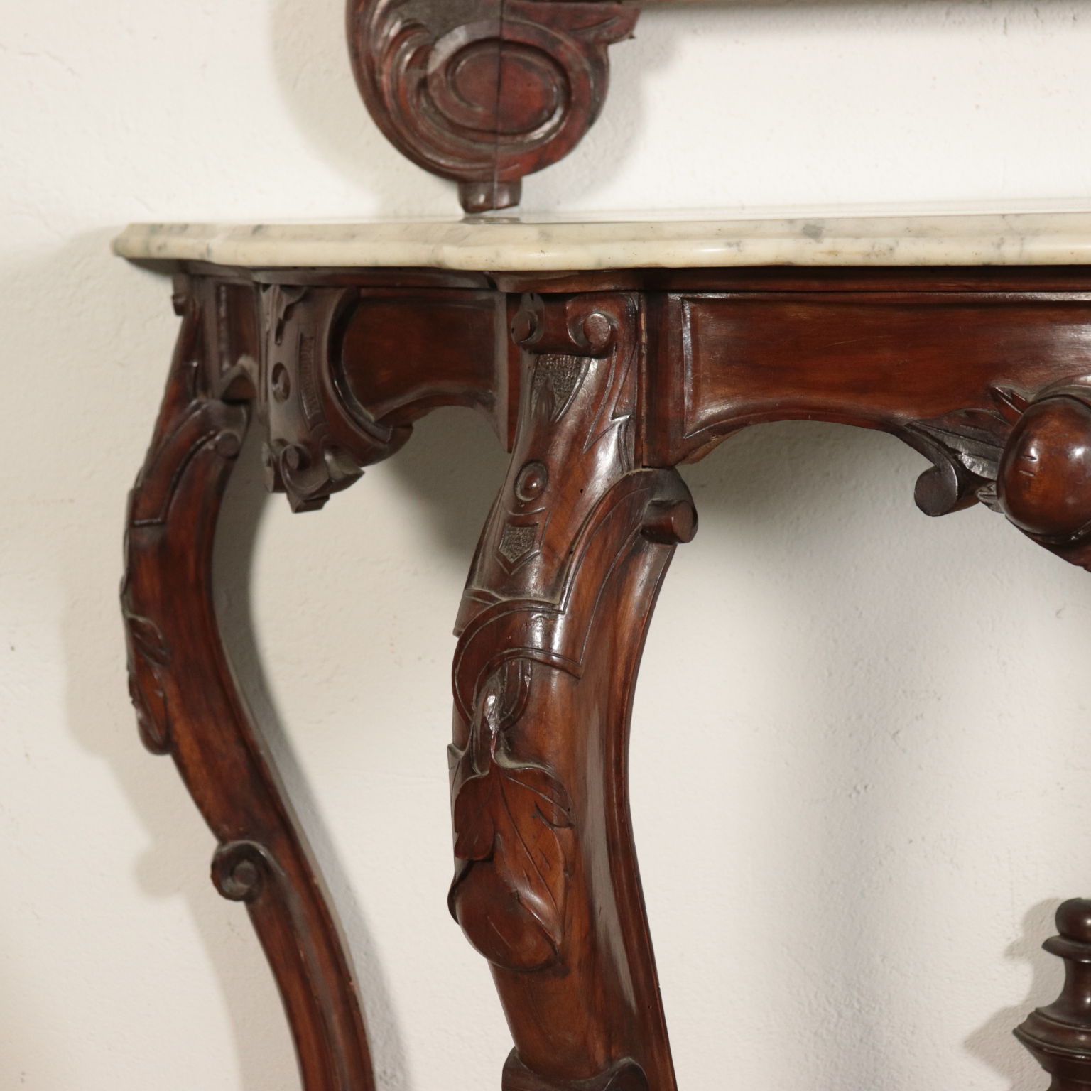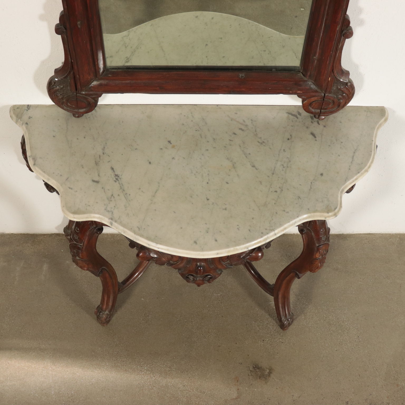 Consolle retta da gambe mosse raccordate da crociera. Piano sagomato in marmo di Carrara. Specchiera sagomata. Riccamente intagliata.