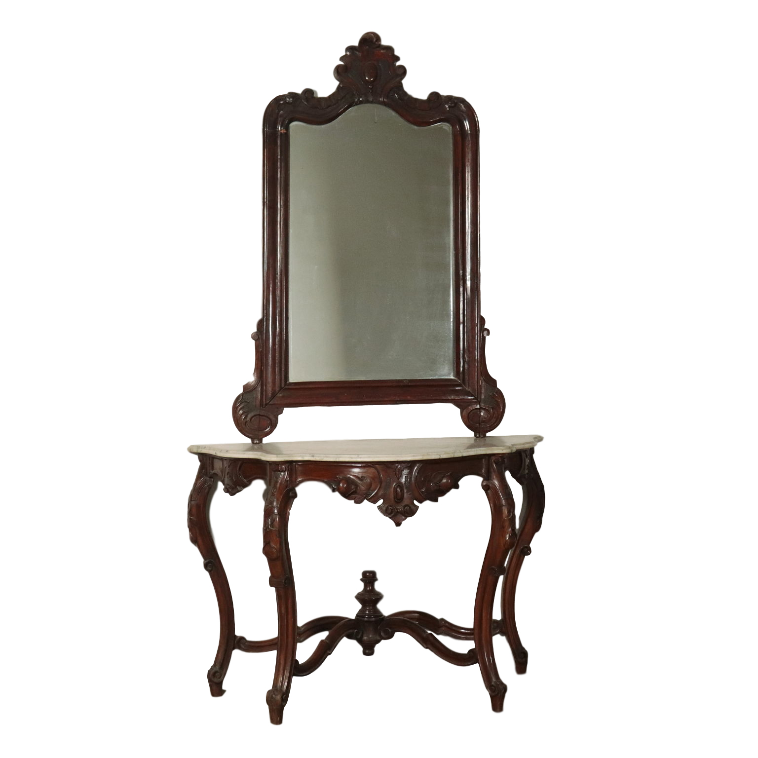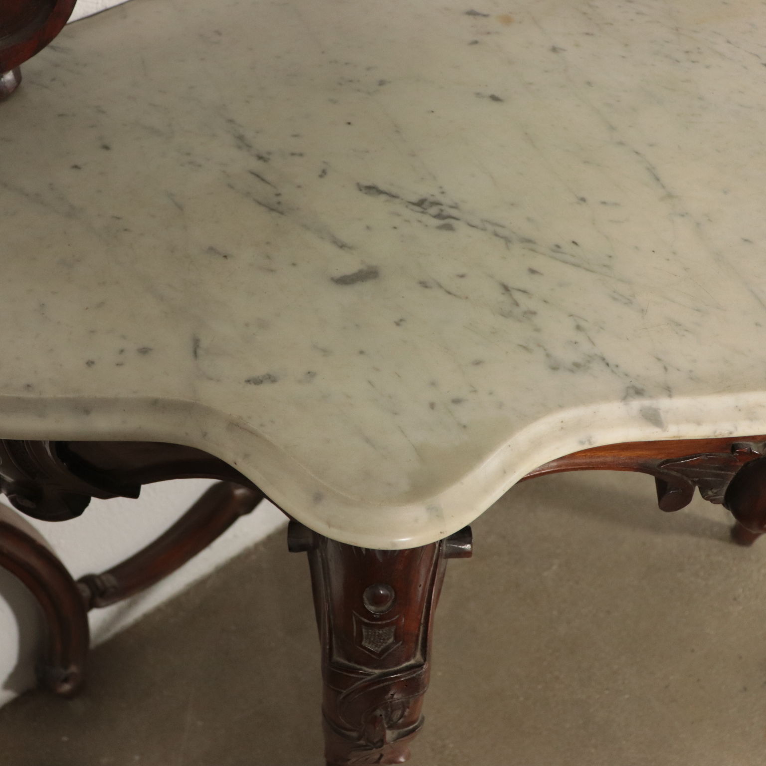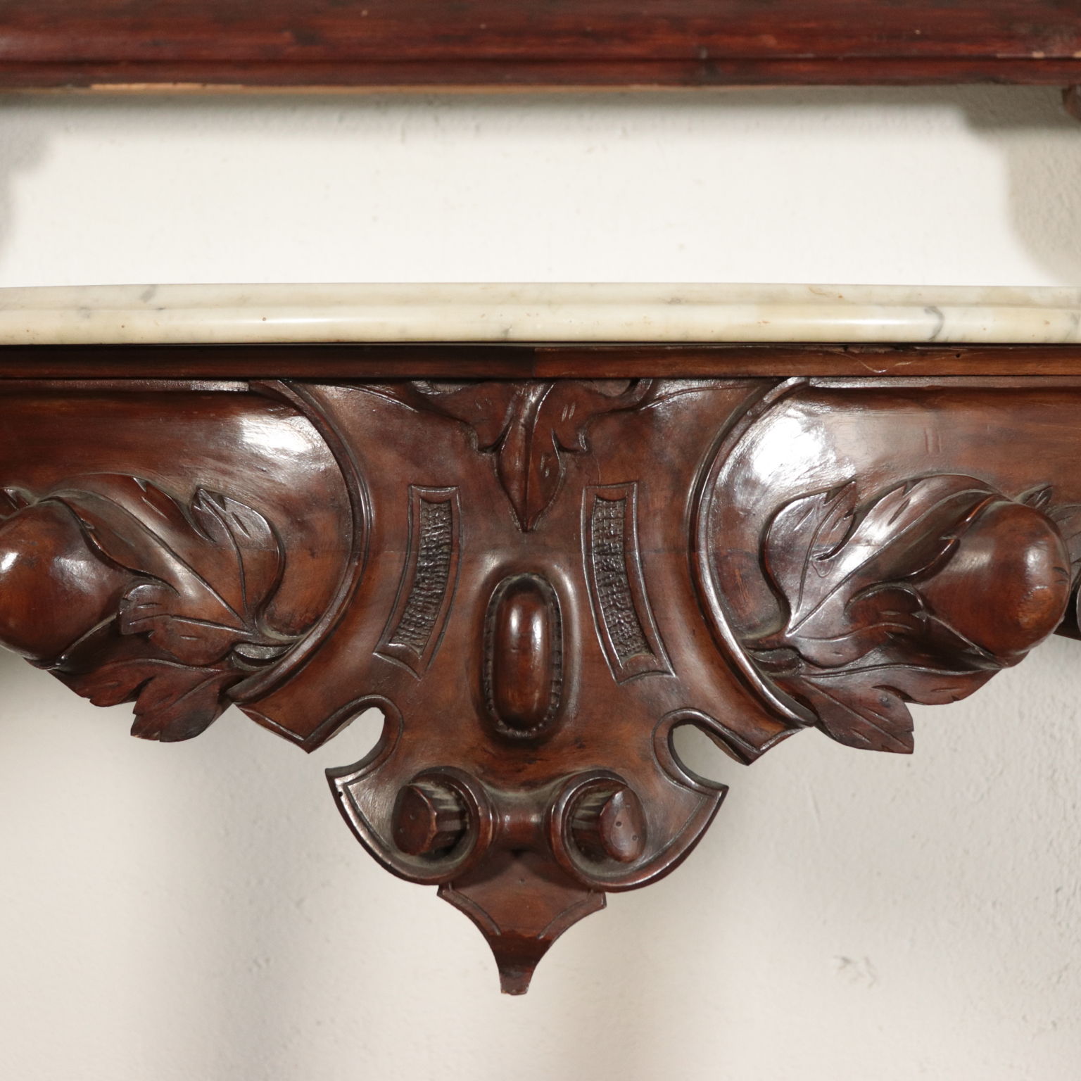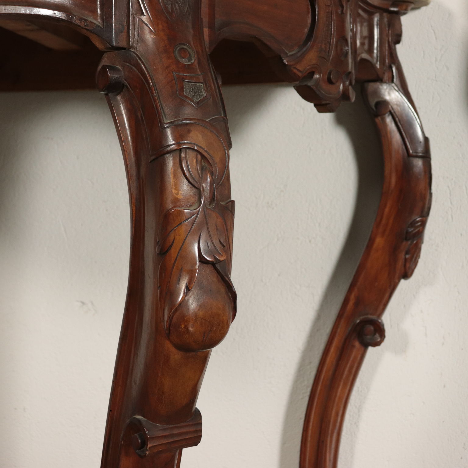 Consolle retta da gambe mosse raccordate da crociera. Piano sagomato in marmo di Carrara. Specchiera sagomata. Riccamente intagliata.