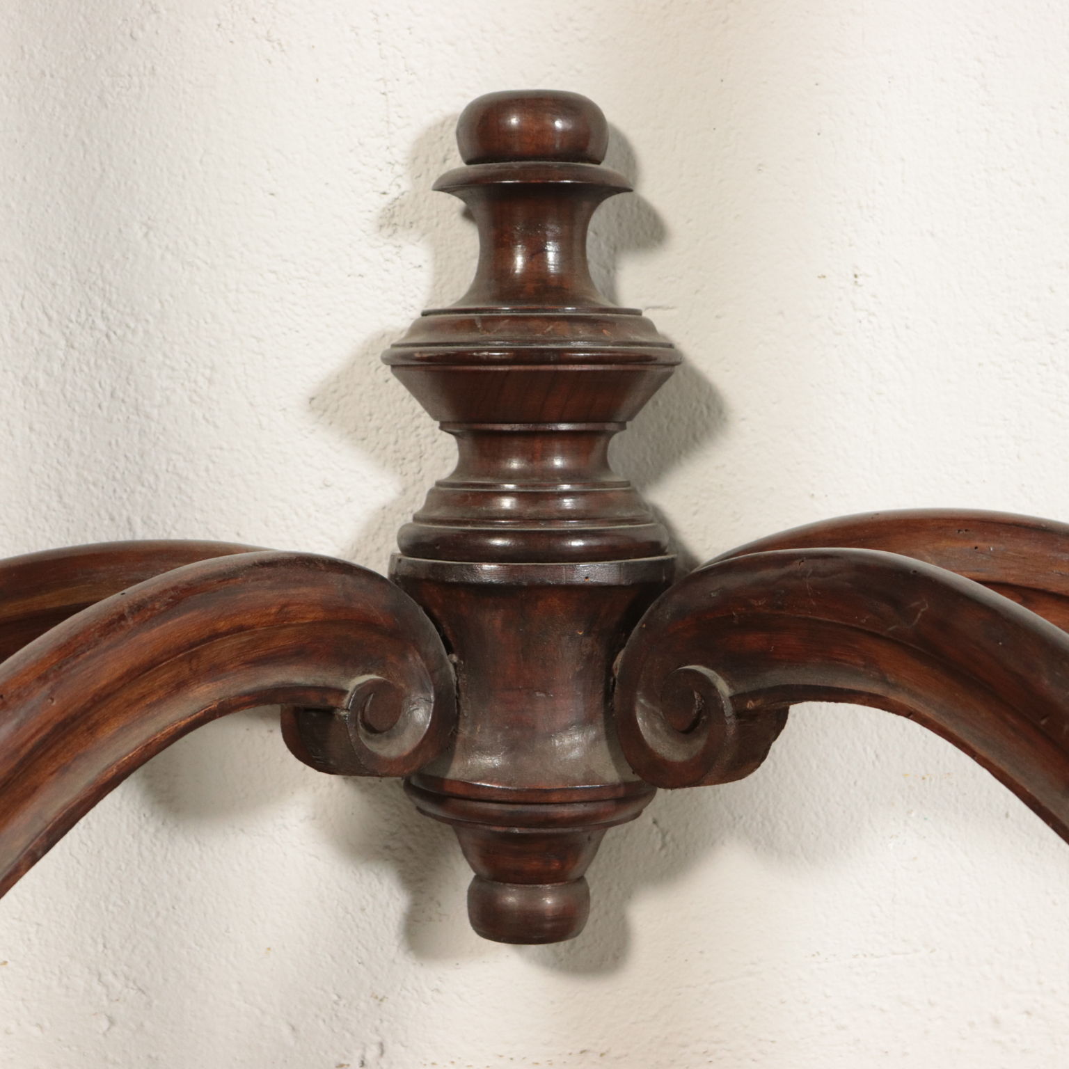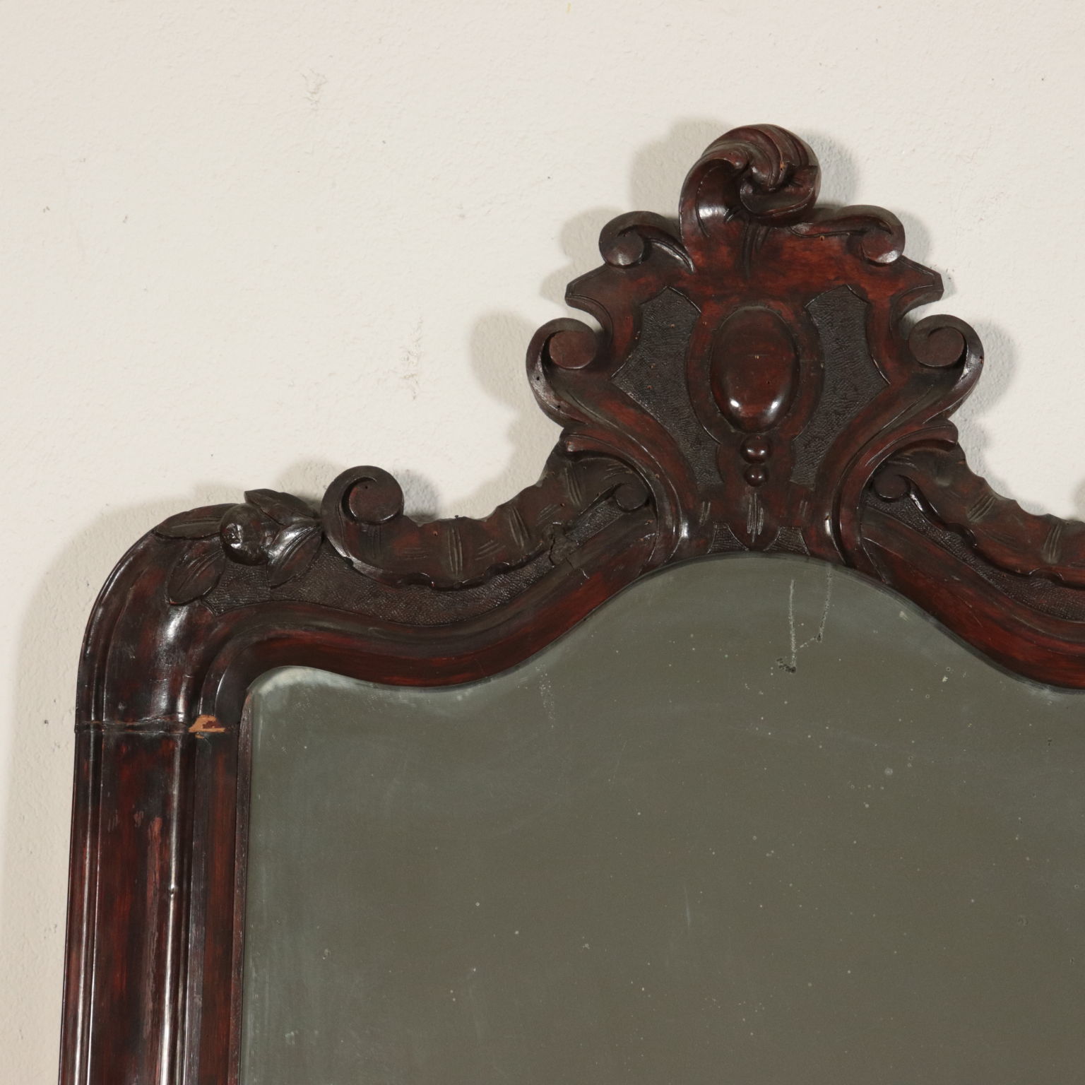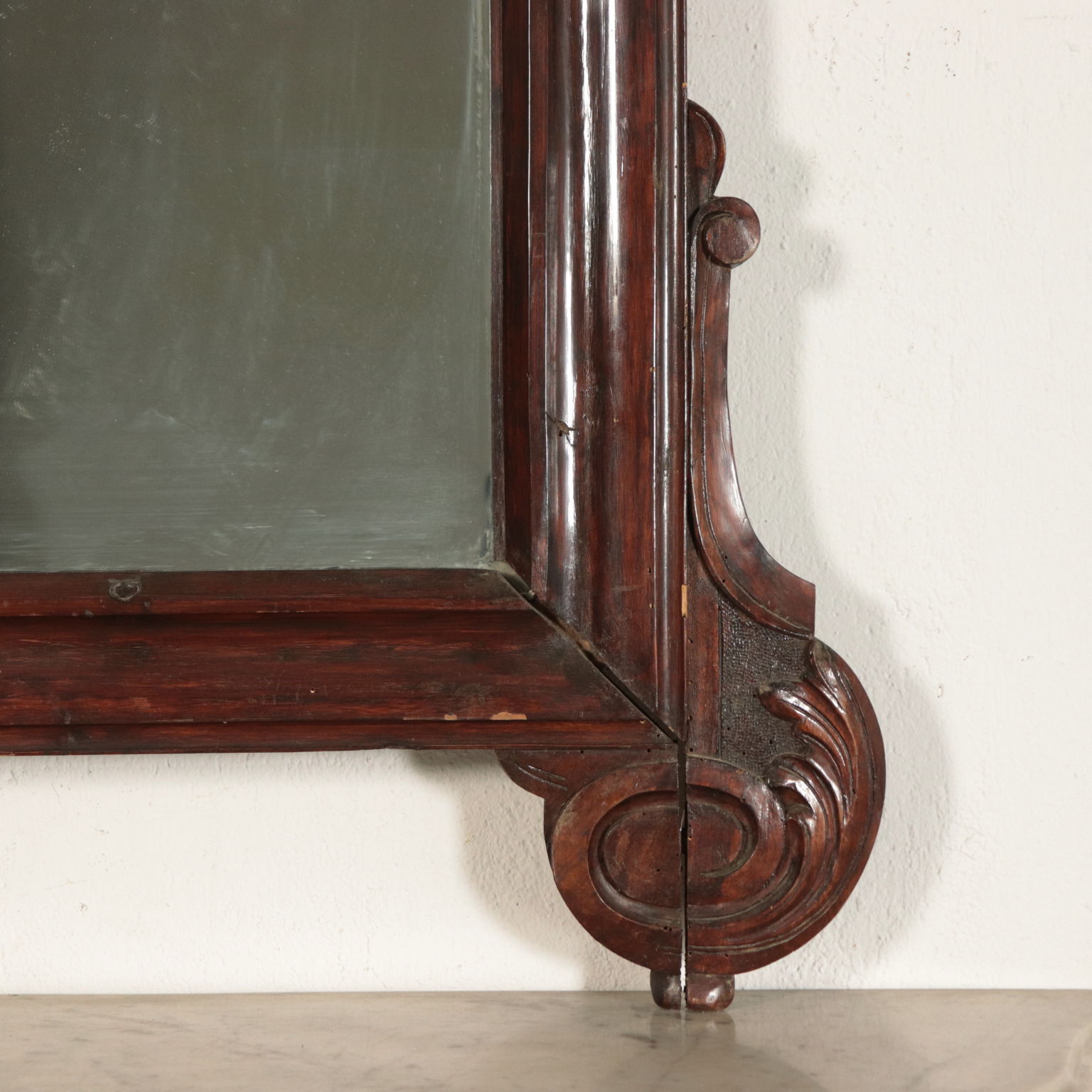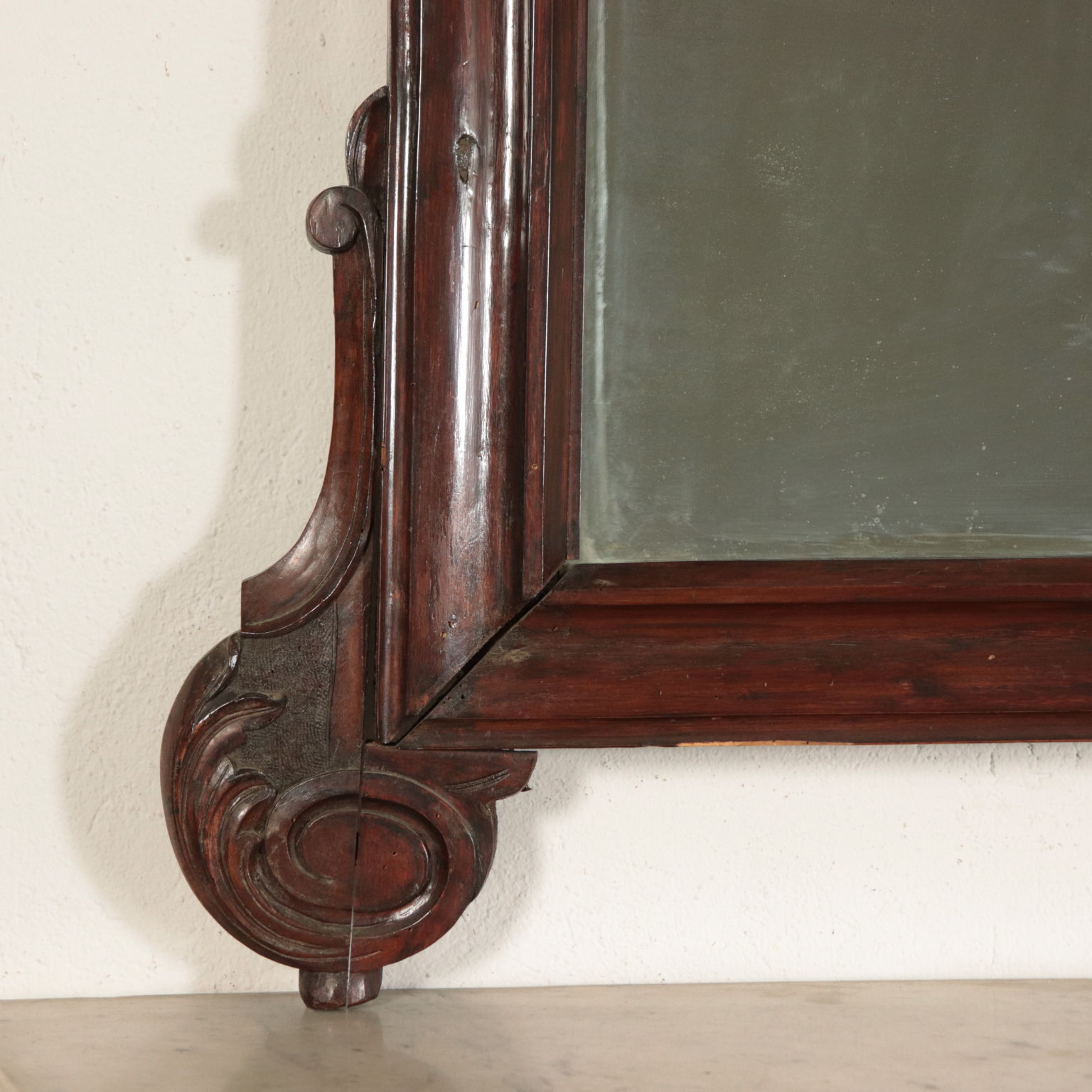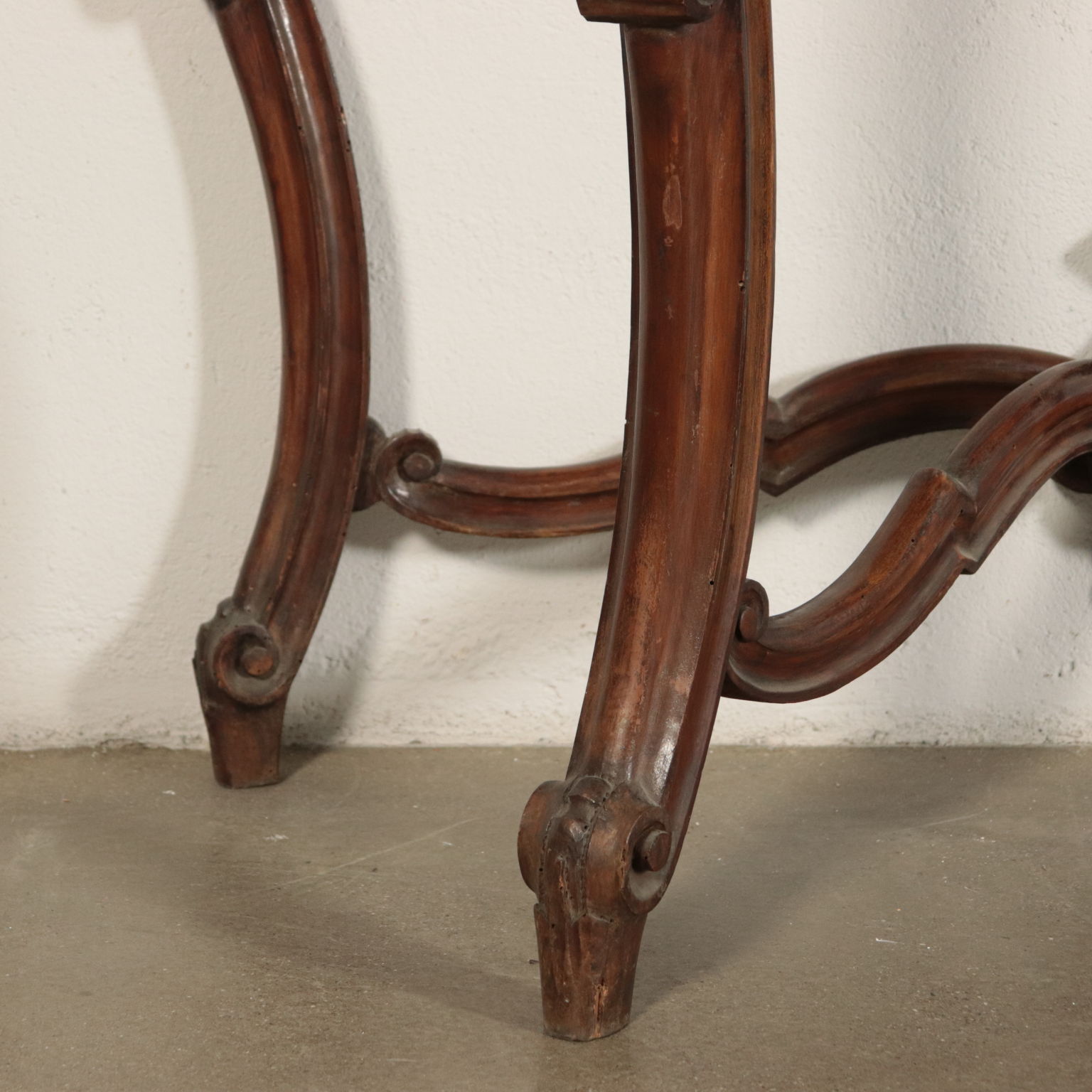 Consolle retta da gambe mosse raccordate da crociera. Piano sagomato in marmo di Carrara. Specchiera sagomata. Riccamente intagliata.