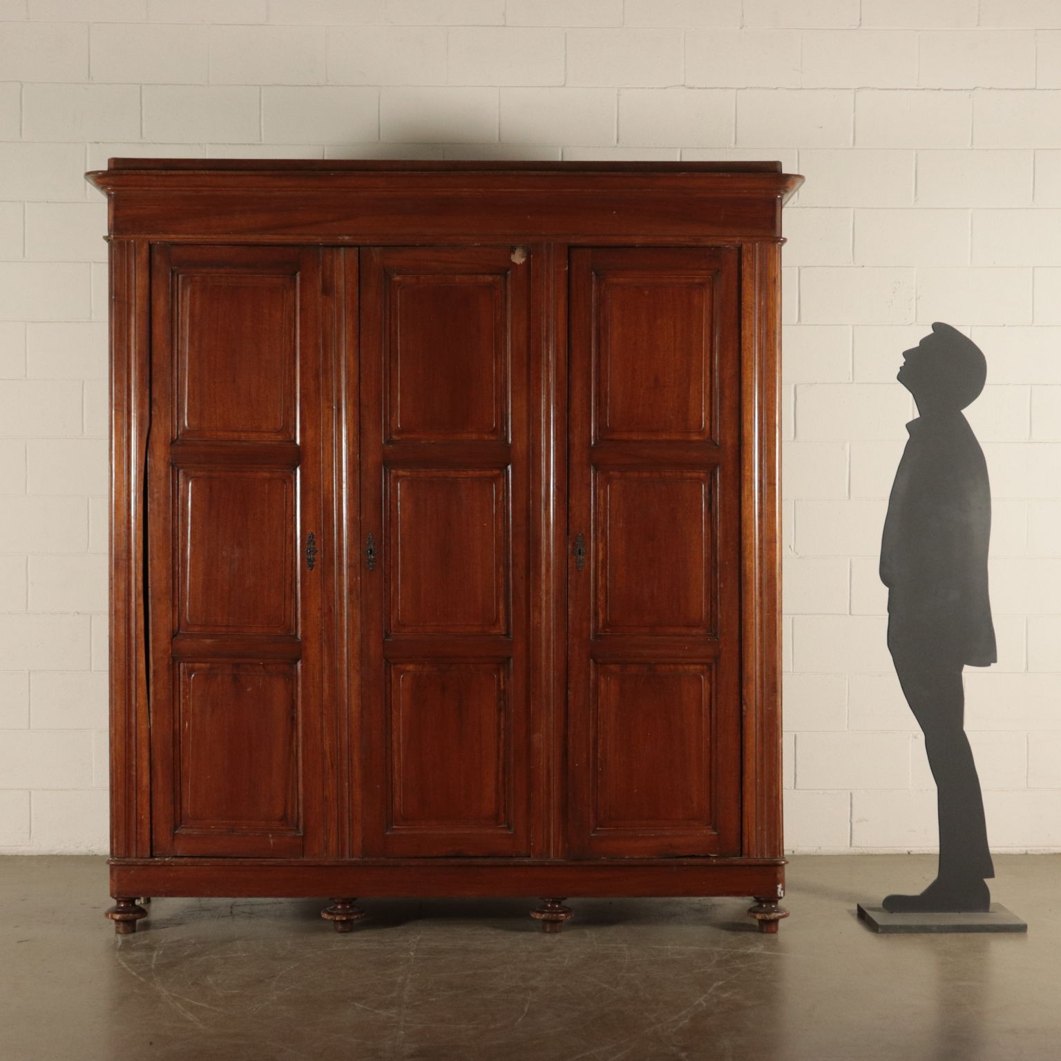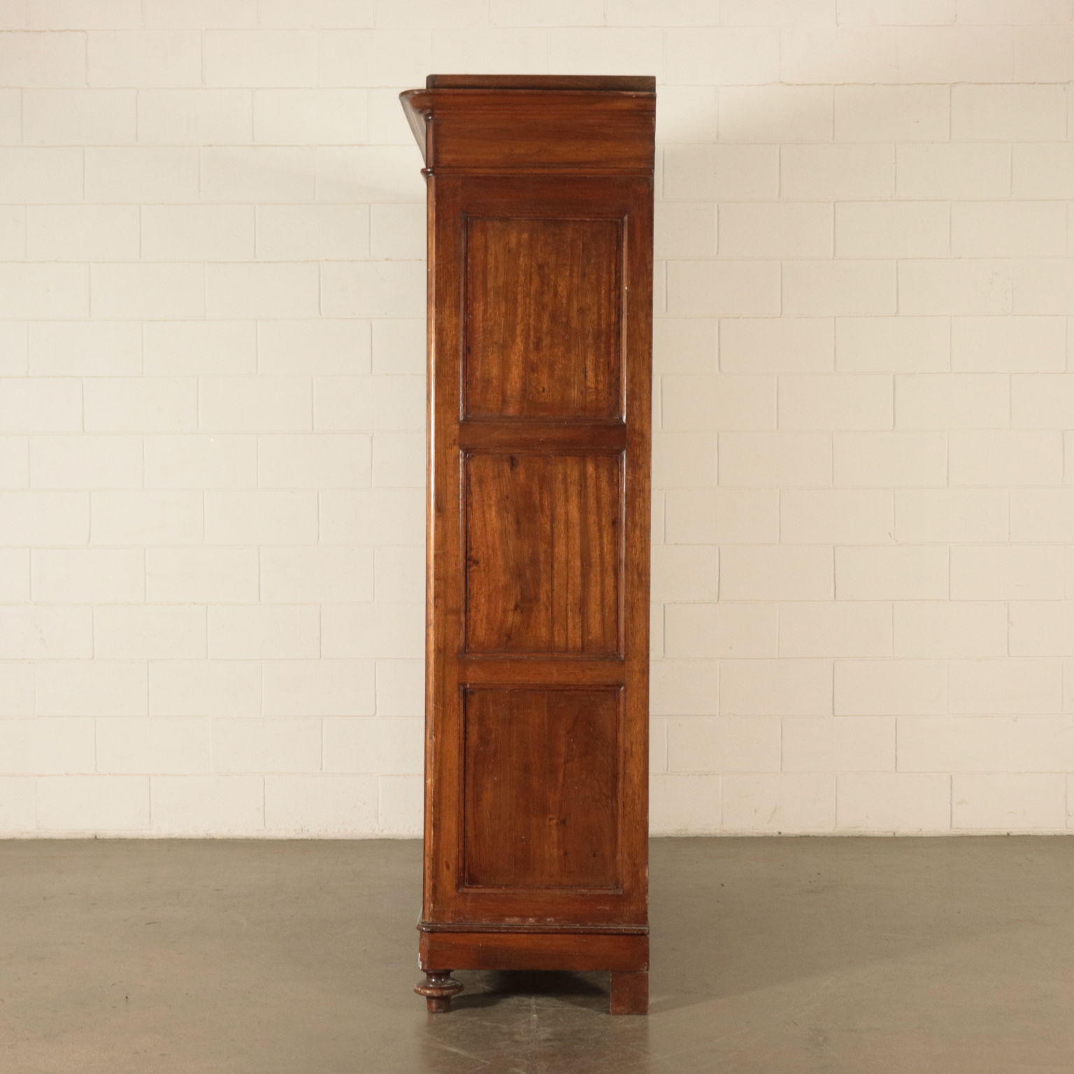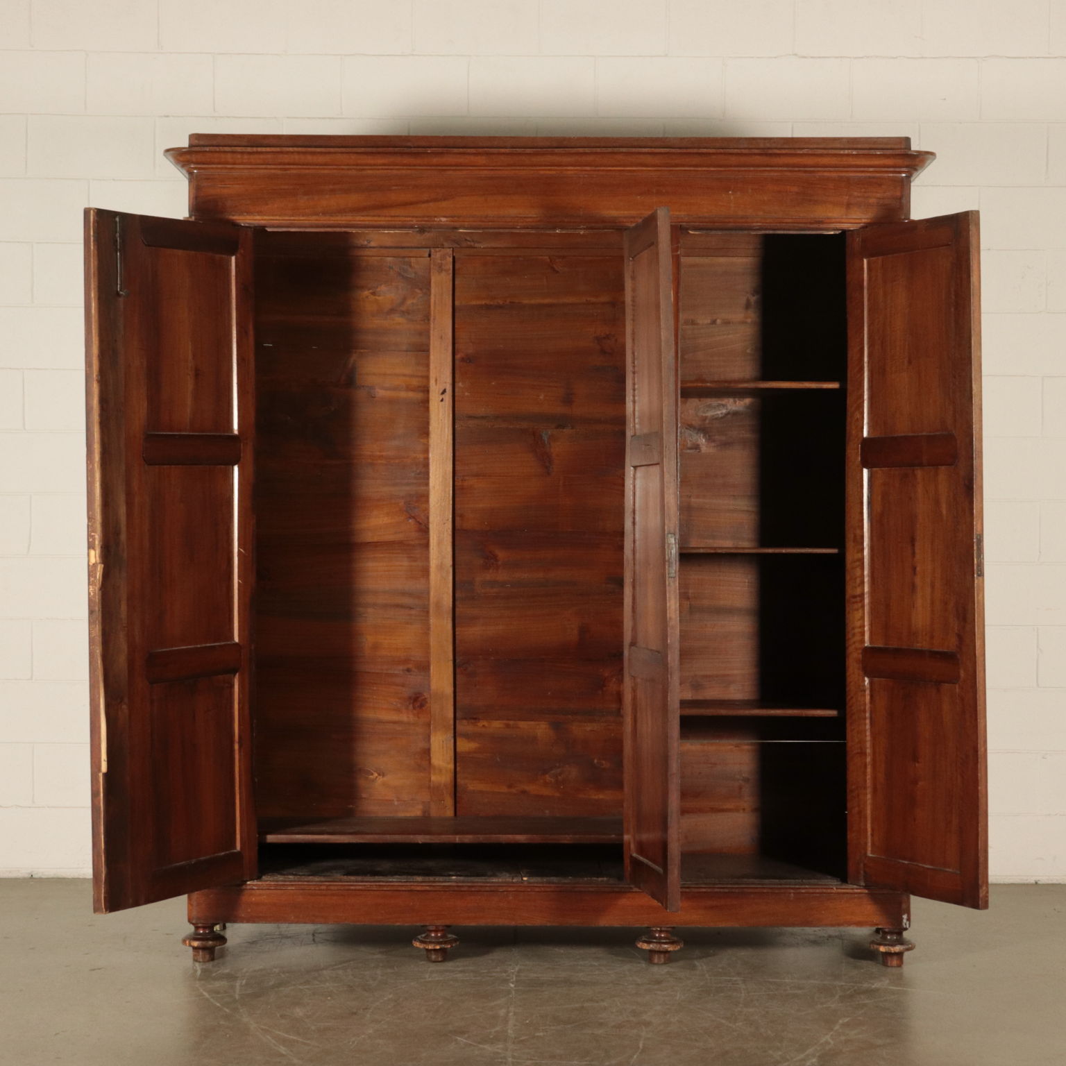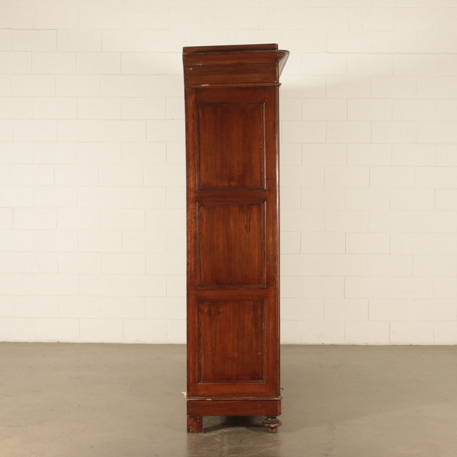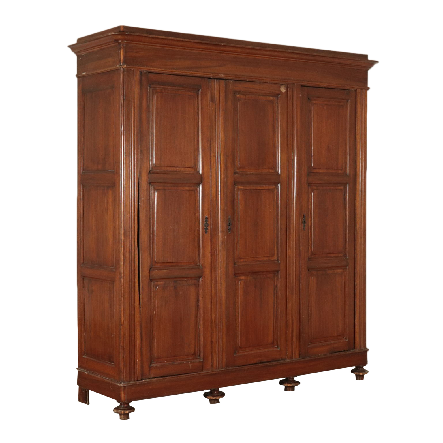 Armadio a tre antre retto da piedi torniti. Ante con pannelli con formelle intagliate. Cappello con cornice.