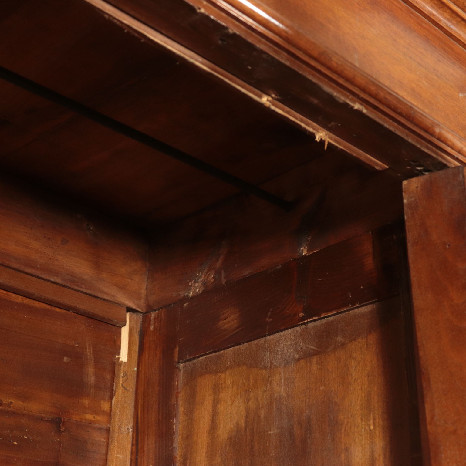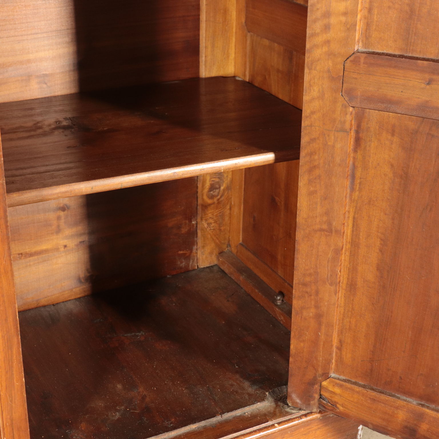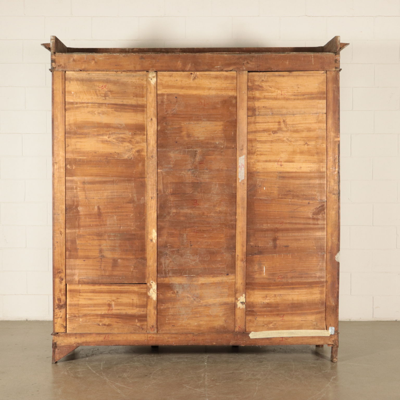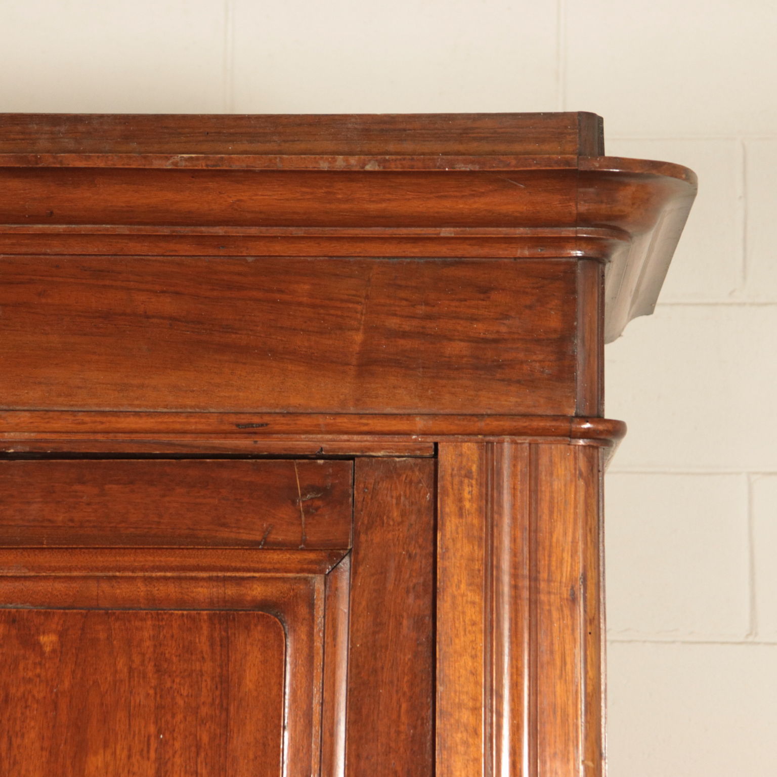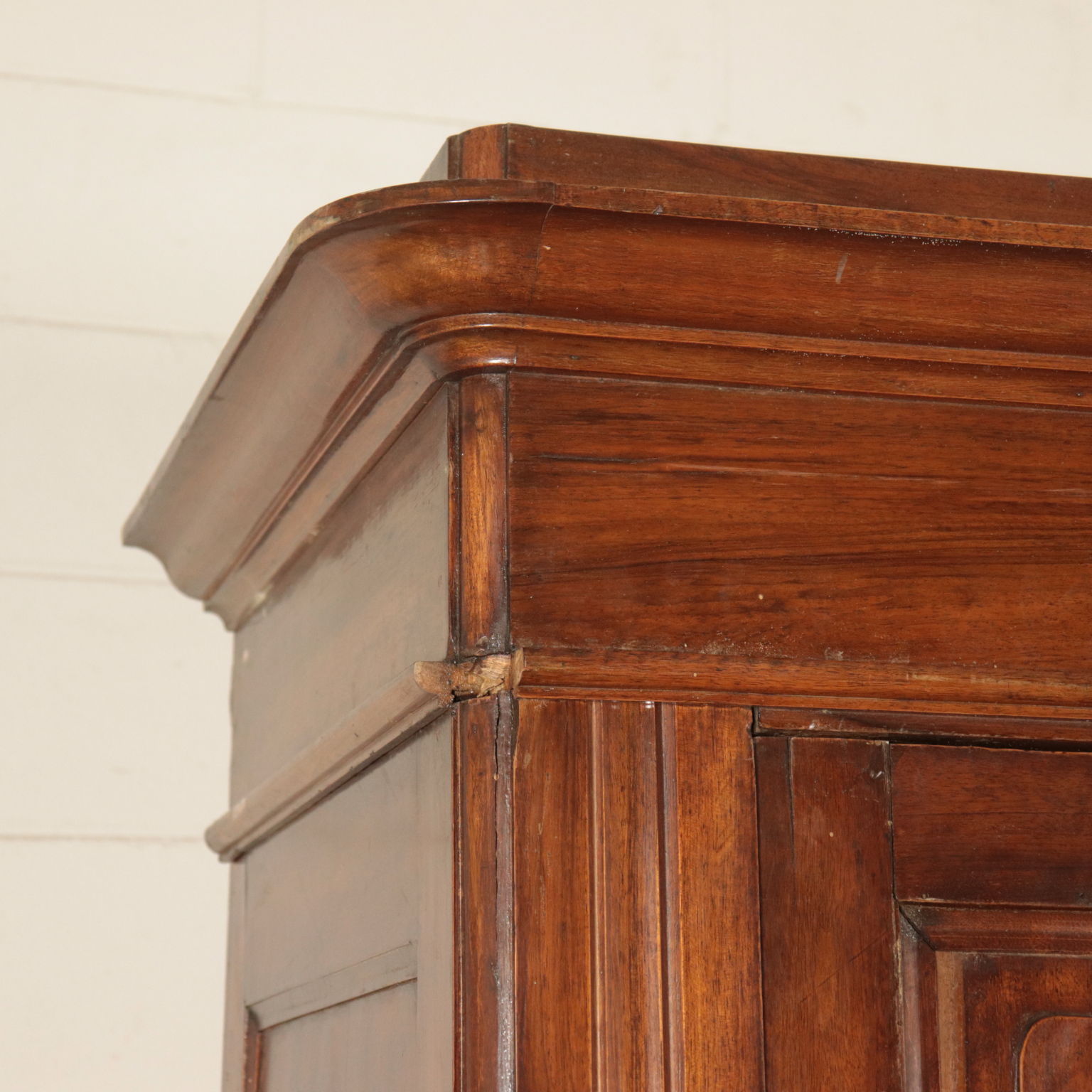 Armadio a tre antre retto da piedi torniti. Ante con pannelli con formelle intagliate. Cappello con cornice.
