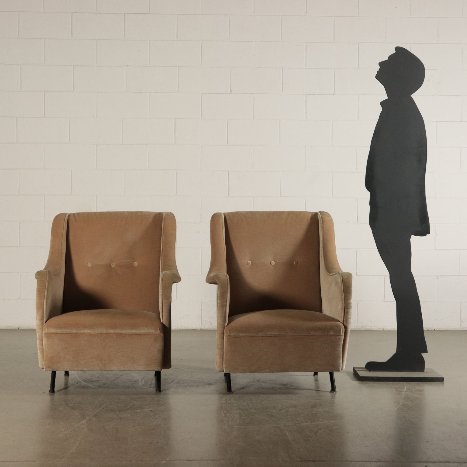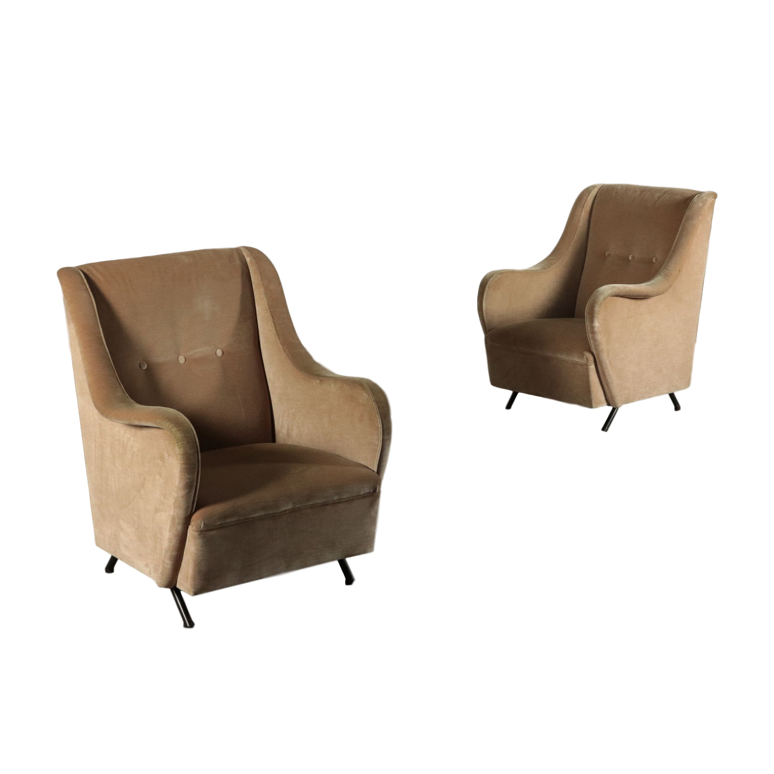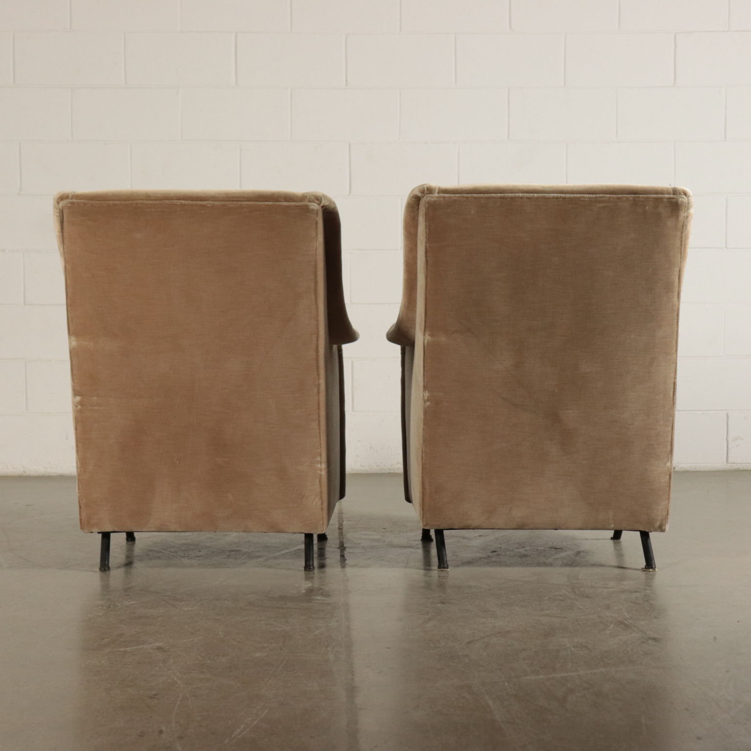Coppia di poltrone; imbottitura a molle, rivestimento in velluto, gambe in metallo.