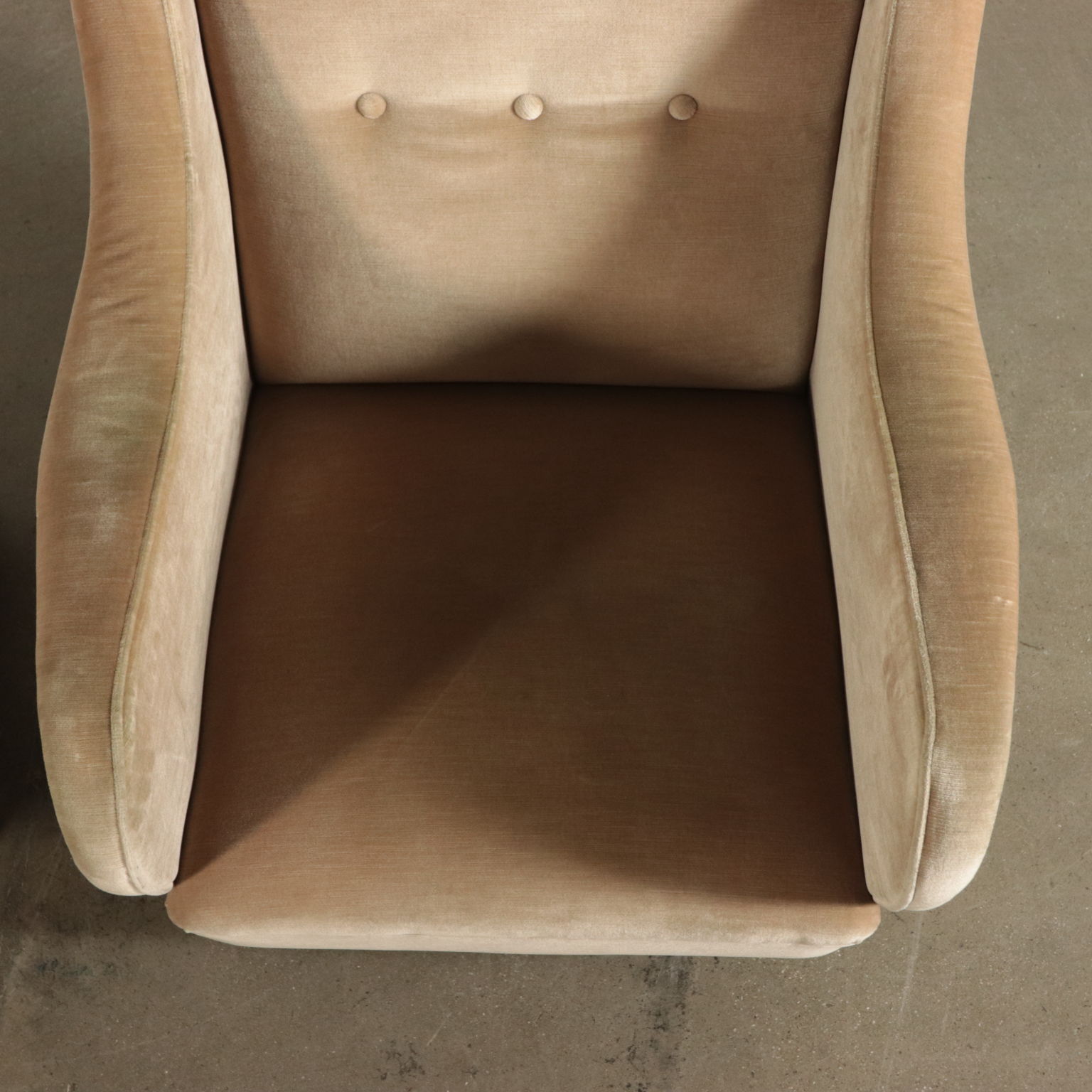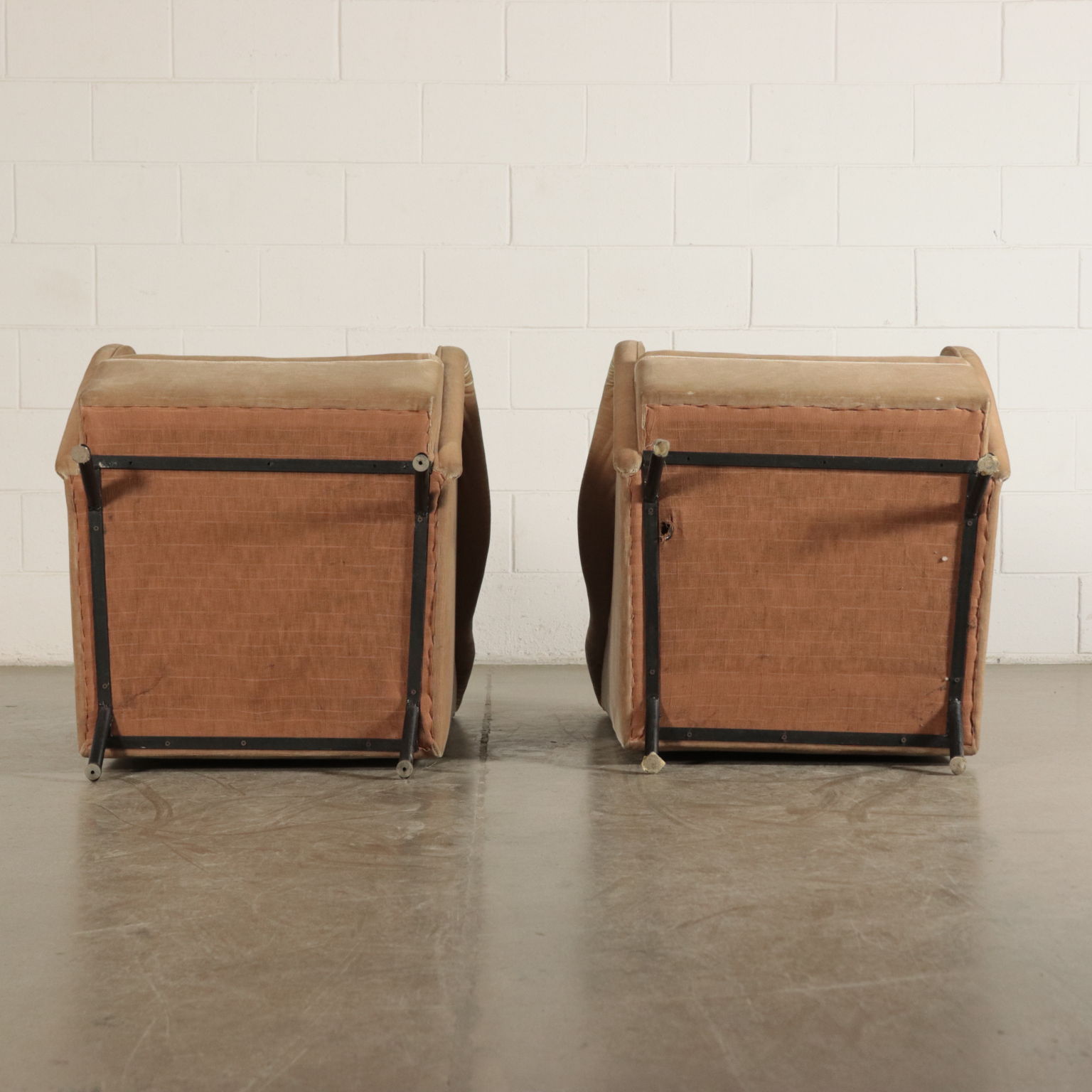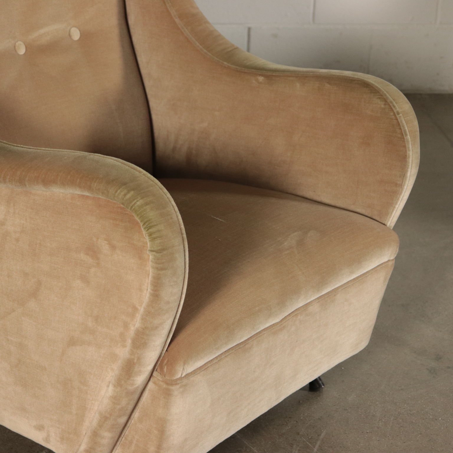 Coppia di poltrone; imbottitura a molle, rivestimento in velluto, gambe in metallo.
