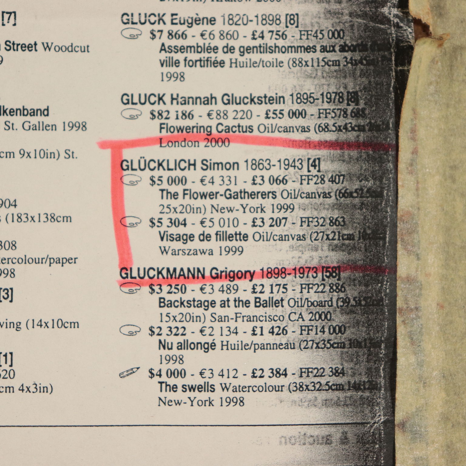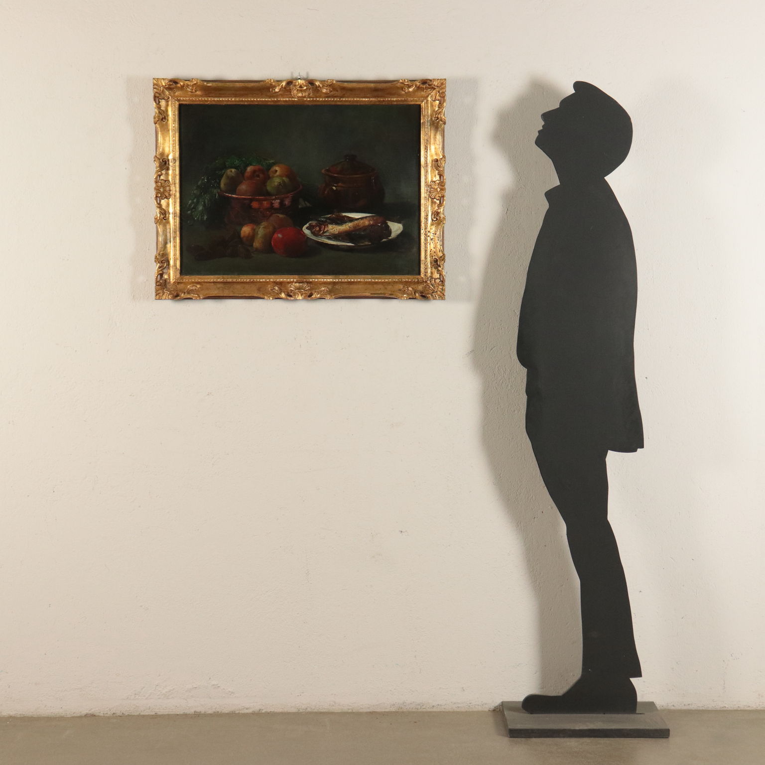Olio su cartone. Efficace natura morta con frutta autunnale, verdura e tranci di pesce, con vasellame in rame. In basso a destra è presente la firma Glücklich S., ma non è attribuibile, per qualità e stile pittorico, all'artista tedesco Simon Glücklich (1863-1843). Comunque interessante e d efficace nella resa coloristica. E' presentato in cornice coeva.