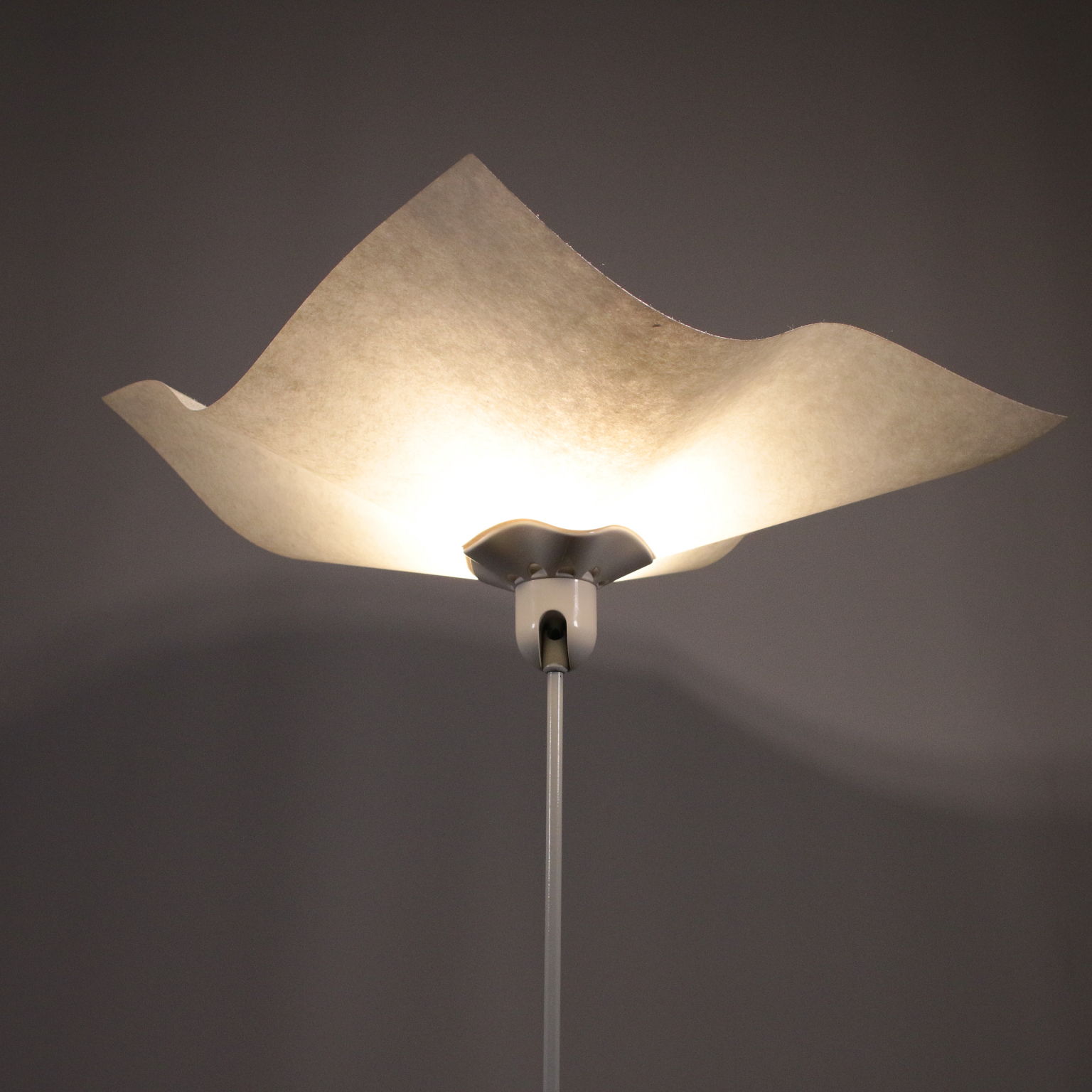 Lampada da terra orientabile, base in ghisa, stelo in metallo laccato, corpo in policarbonato, riflettore in tessuto sintetico.