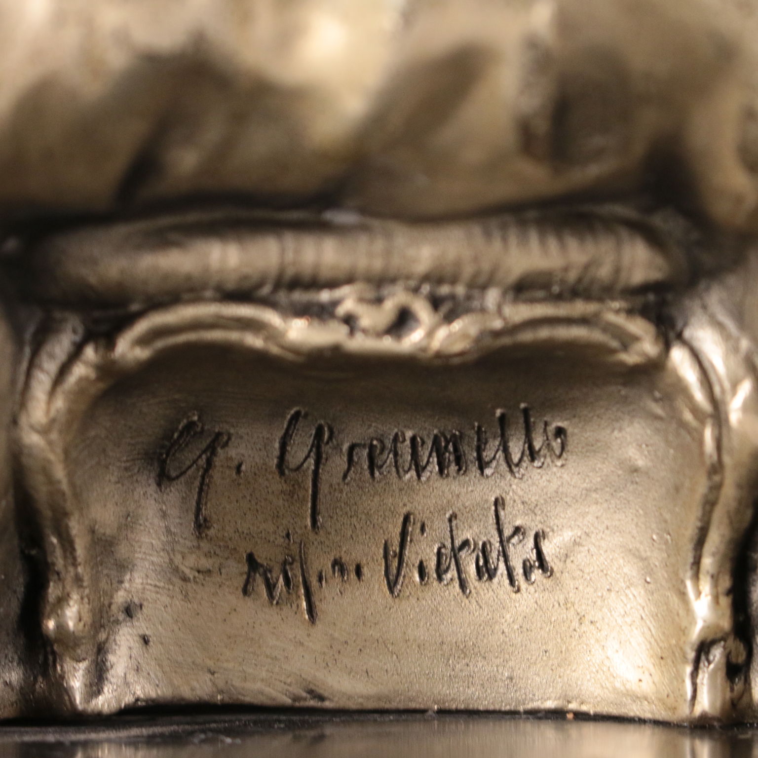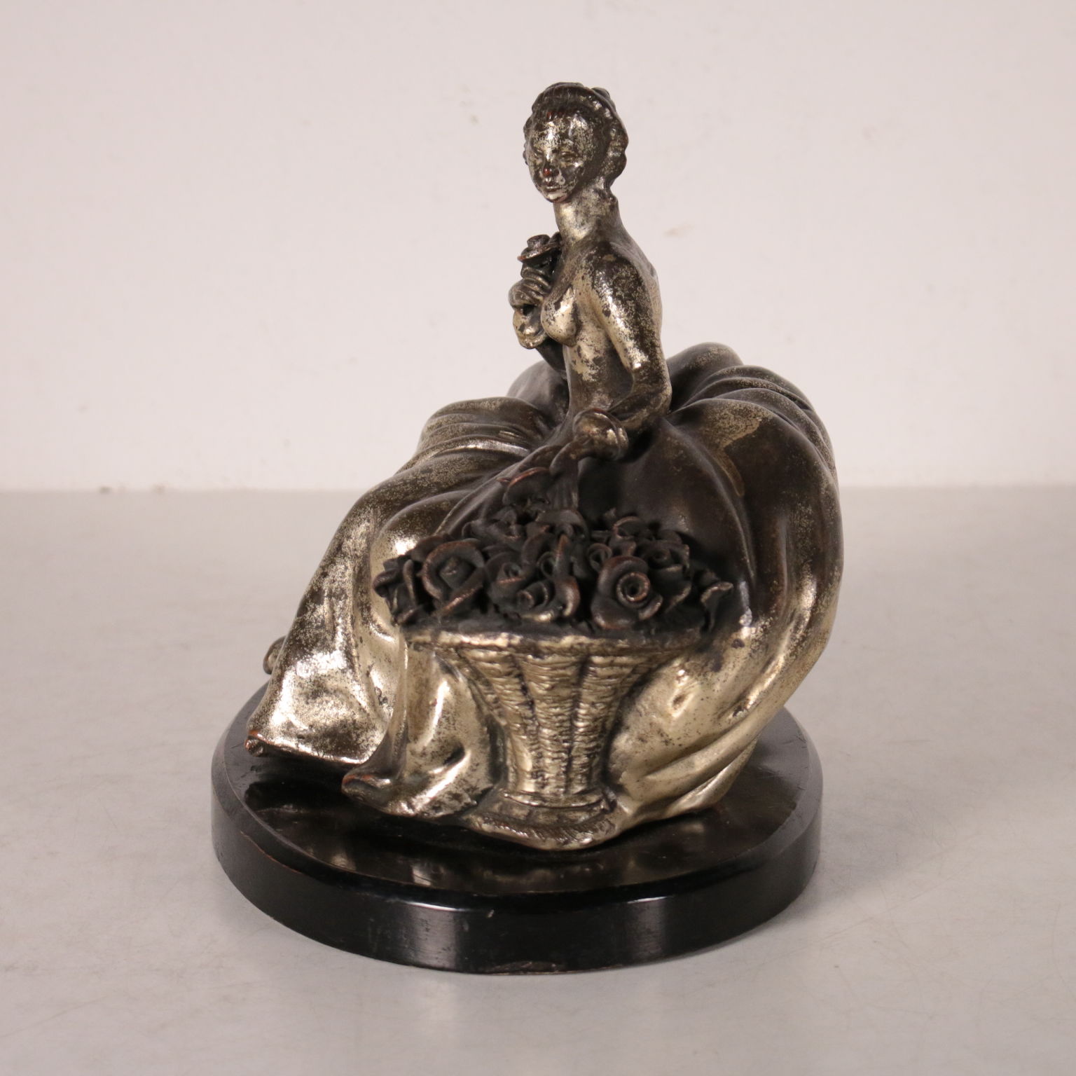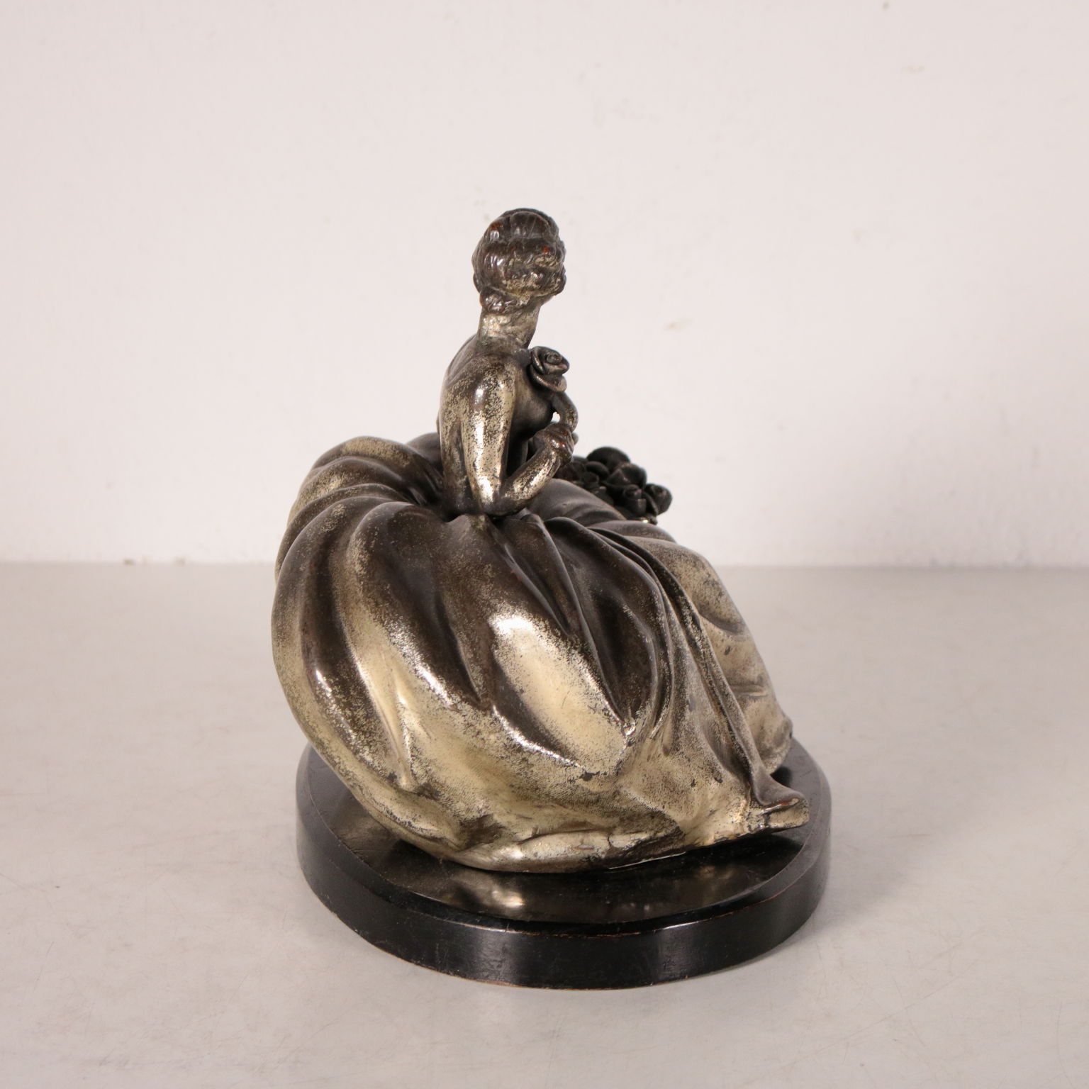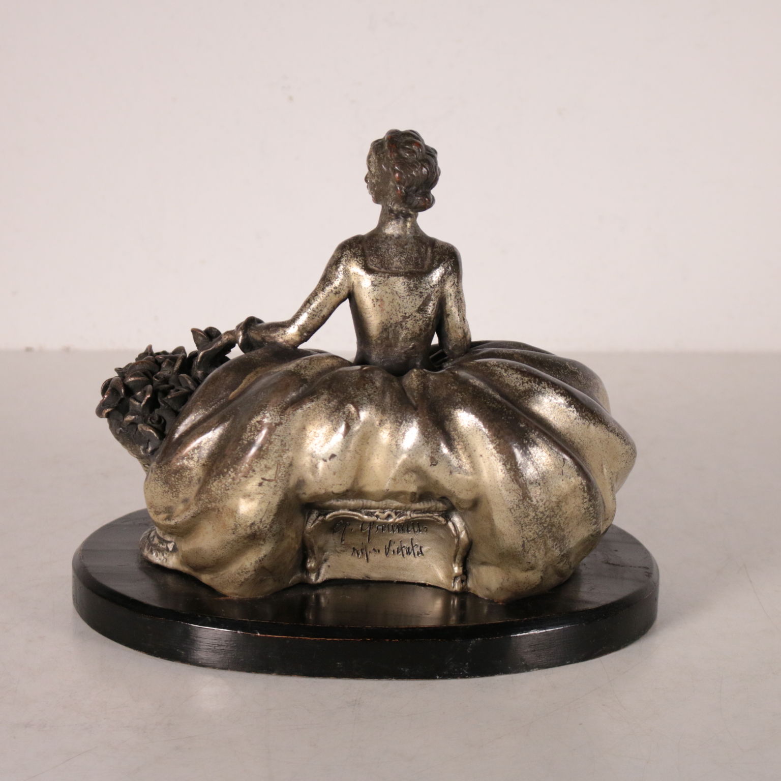 Damina in terracotta rivestita in metallo argentato con processo elettrolitico. Base a forma ovale in legno ebanizzato. Sul retro firma del ceramista. In quegli anni Giuseppe Granello lavorò presso la manifattura di Guido Cacciapuoti.