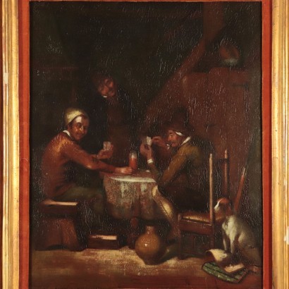 Olio su lastra di metallo. La scena di genere è ambientato in un interno di casolare ove, seduti al desco con il fiasco di vino, alcuni uomini giocano a carte: di fianco, sulla destra, il fucile appoggiato al muro e il cane in attesa, identificano un cacciatore. I personaggi sono ben caratterizzati, quasi caricaturali; la scena è divisa in due parti diagonalmente da una trave della parete; spiccano i giochi di luci e colori, con macchie di bianco che emergono qua e là a identificare dei particolari, nel contesto buoi della scena. Al retro dell'opera è presente etichetta cartacea con titolo "The players at cards" e attribuzione a Charles Vennemann, il pittore belga ottocentesco specializzato in scene di genere. Il dipinto è presentato in cornice coeva ridorata, che necessita di restauro per diverse mancanze; sul suo retro sono presenti inoltre timbri di appartenenza alla collezione del Conte Camillo Salvadego Molin Ugoni, della nobile famiglia bresciana.