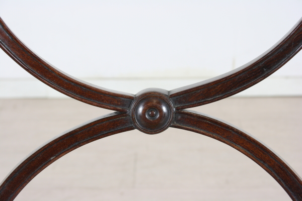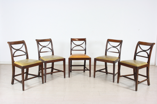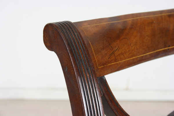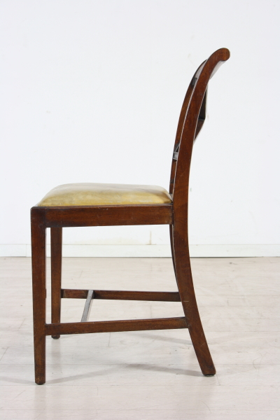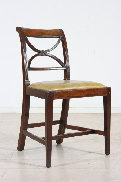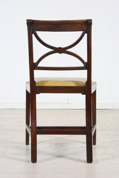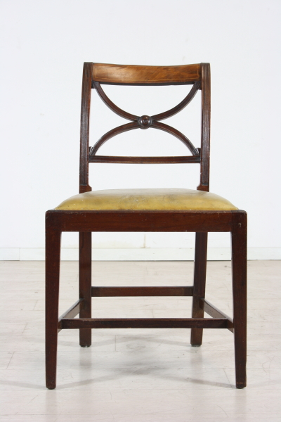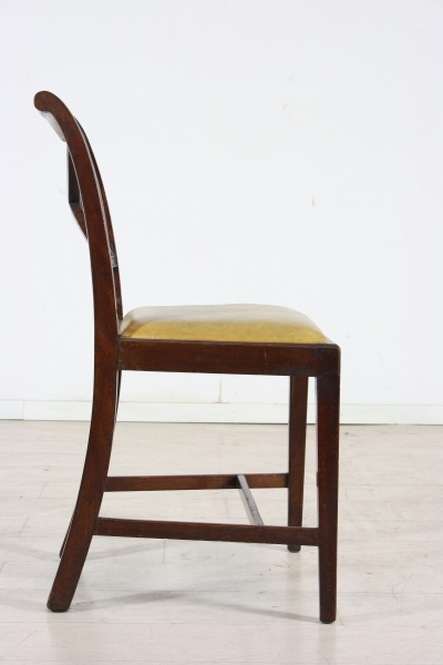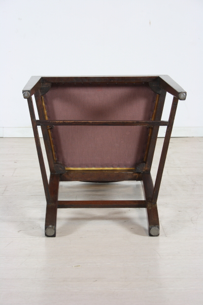 Gambe raccordate da traverse, schienale a giorno presentano i montanti scanalati e la cartella superiore con intarsio in acero e crociera sottostante. Seduta imbottita. Mancanze e rotture.