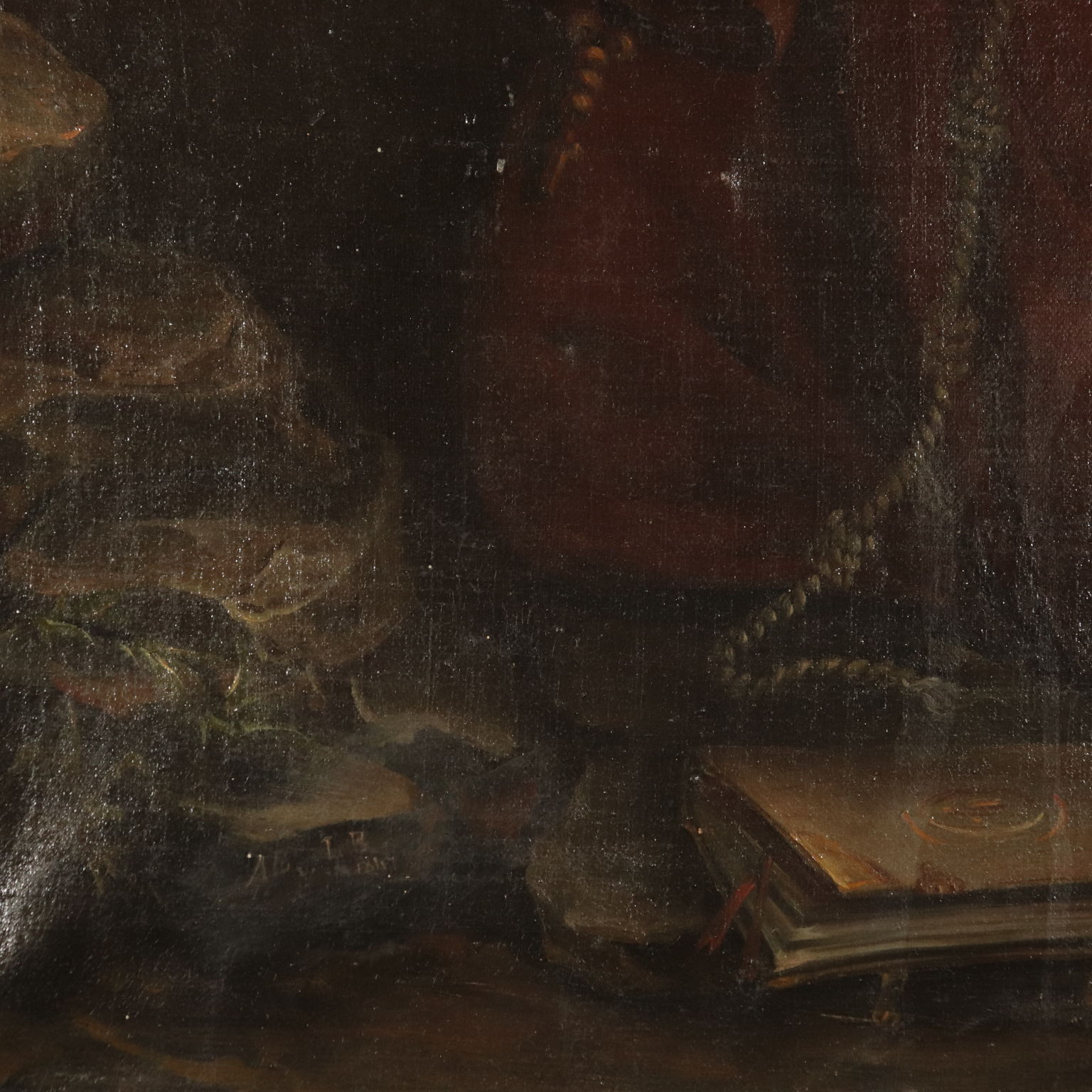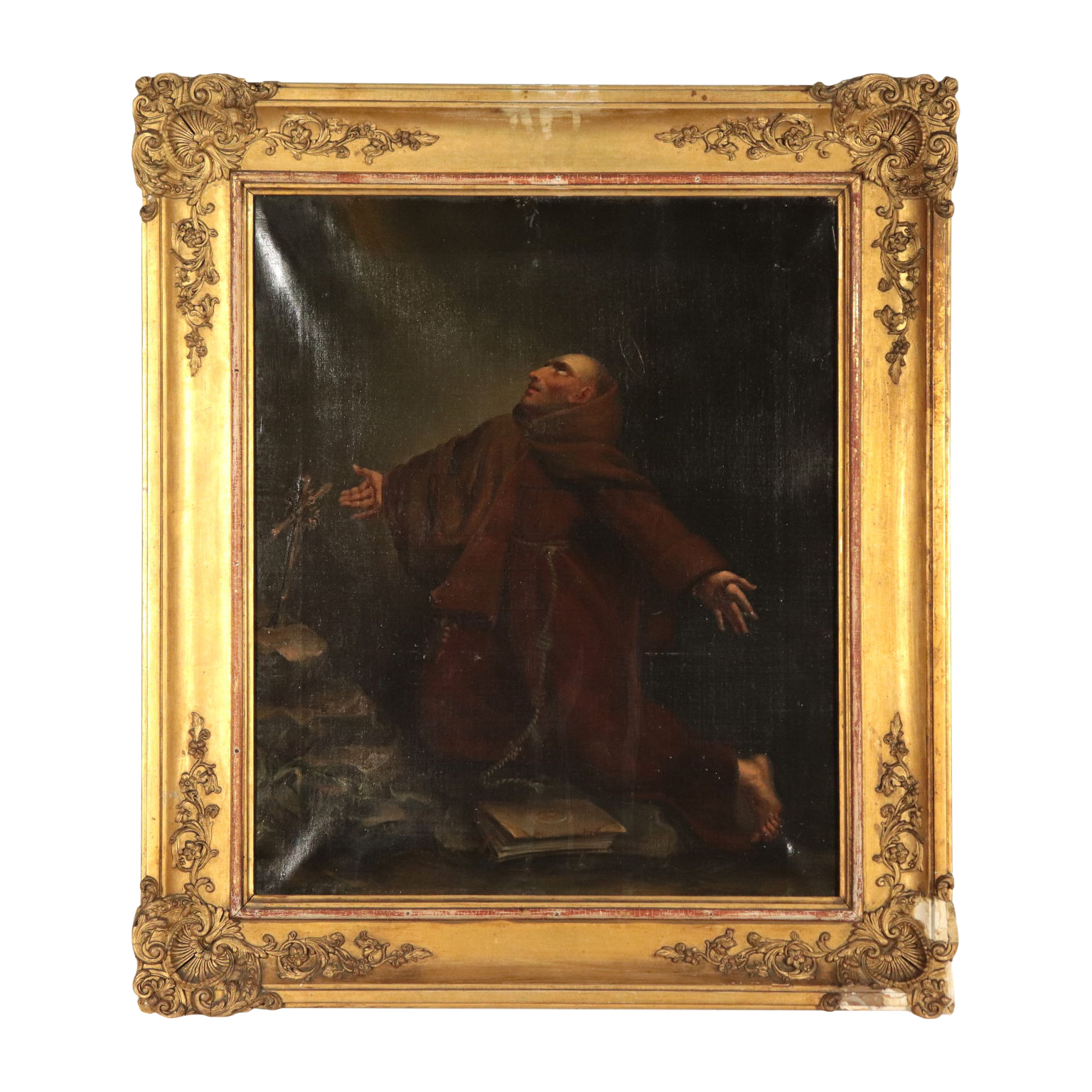 Olio su tela. In basso a sinistra presente un doppio monogramma AL -LB e la data 1847. San Francesco in contemplazione della Croce nel deserto roccioso, volge il capo in estasi verso la luce che proviene dall'alto. Il dipinto è presentato in cornice di fine '800.