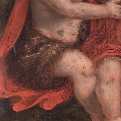 Olio su rame. Il Battista, benchè in fattezze di bambino piccolo, viene tradizionalmente raffigurato già con gli attributi iconografici della sua missione adulta: cinto di vesti di animali ma con il manto rosso del martirio, con a fianco un agnello e reggente il bastone sormontato dalla croce. Il piccolo dipinto è presentato in cornice lignea lavorata con decori floreali, di fine '800.