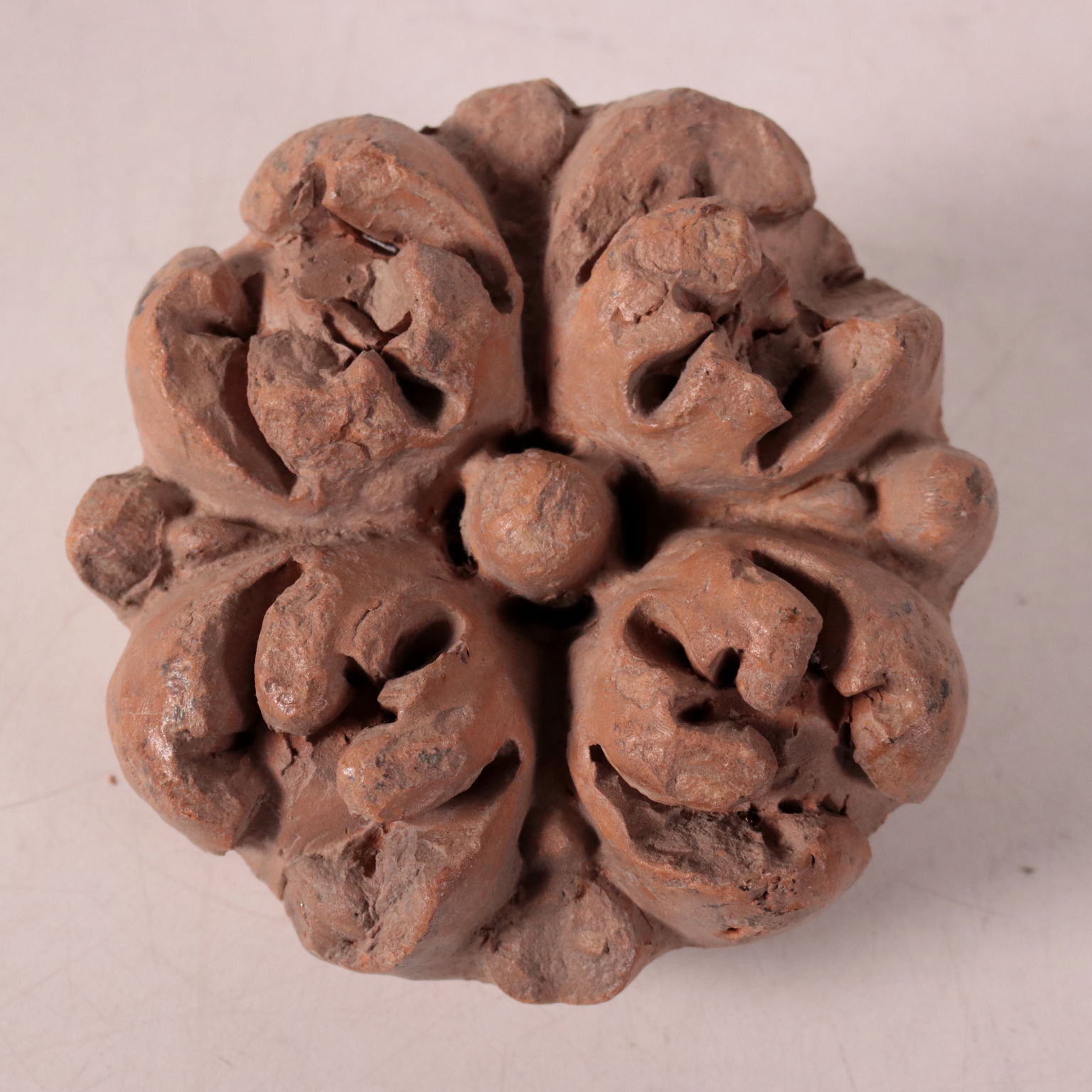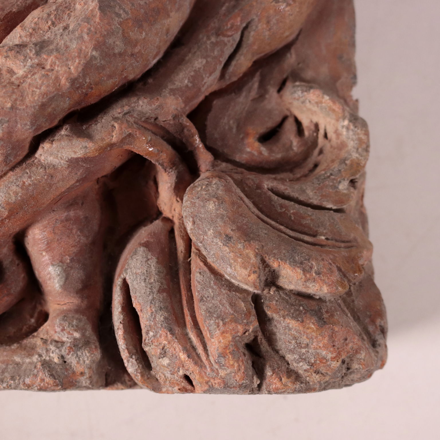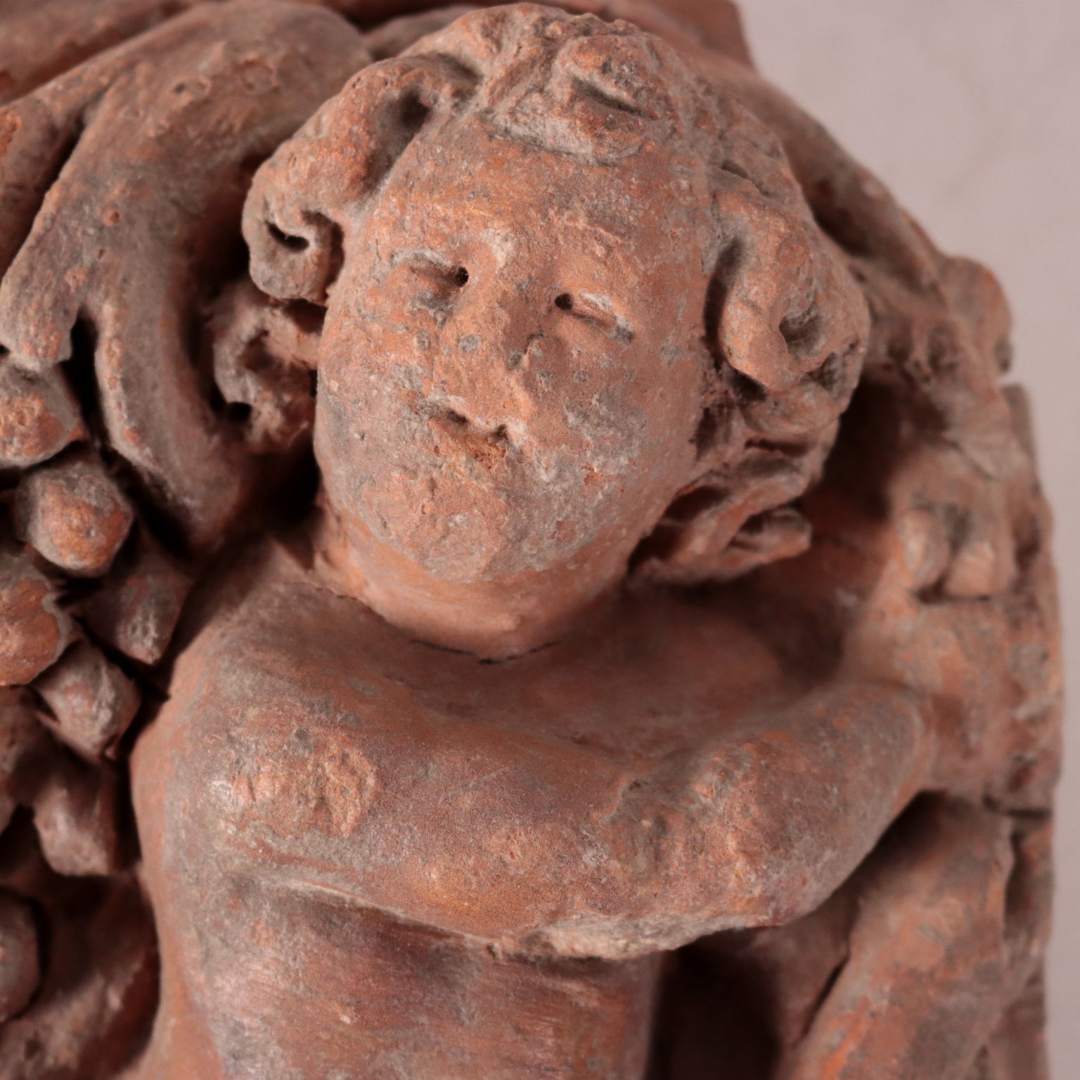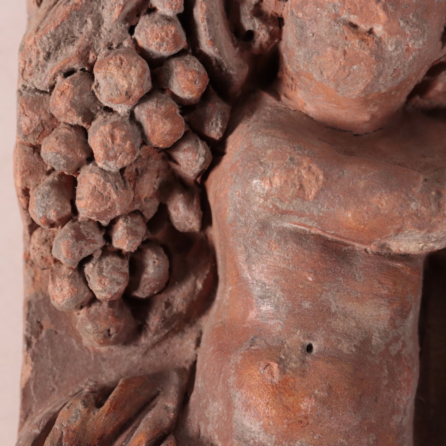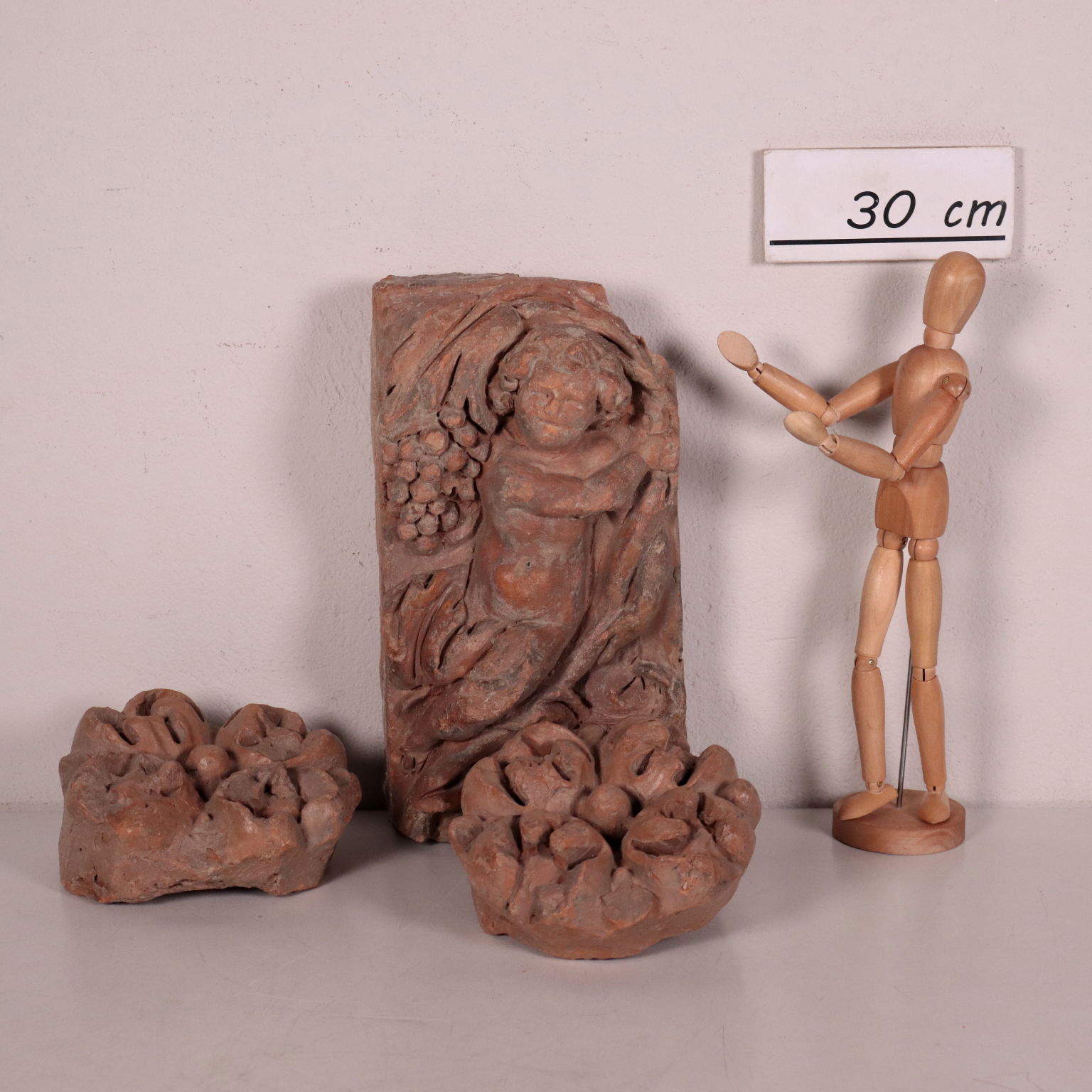 Gruppo di tre formelle in terracotta. Una raffigura un putto con ramo di vite e grappolo d'uva; le due formelle più piccole presentano un decoro a motivo vegetale.