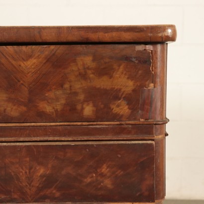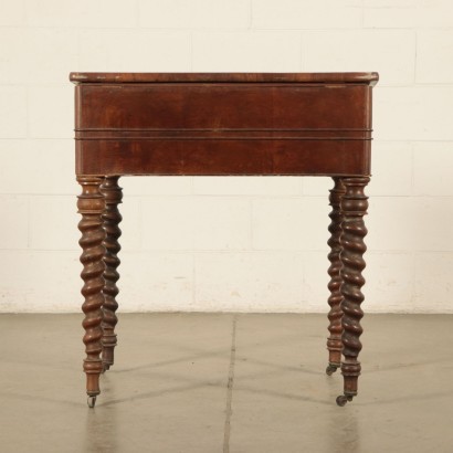 Tavolino sorretto da quattro gambe a colonne tornite e a torciglione, dotate di rotelle. Nella fascia sottopiano, impiallacciata in pedule di noce, presenta un cassetto; il piano è apribile a libro.