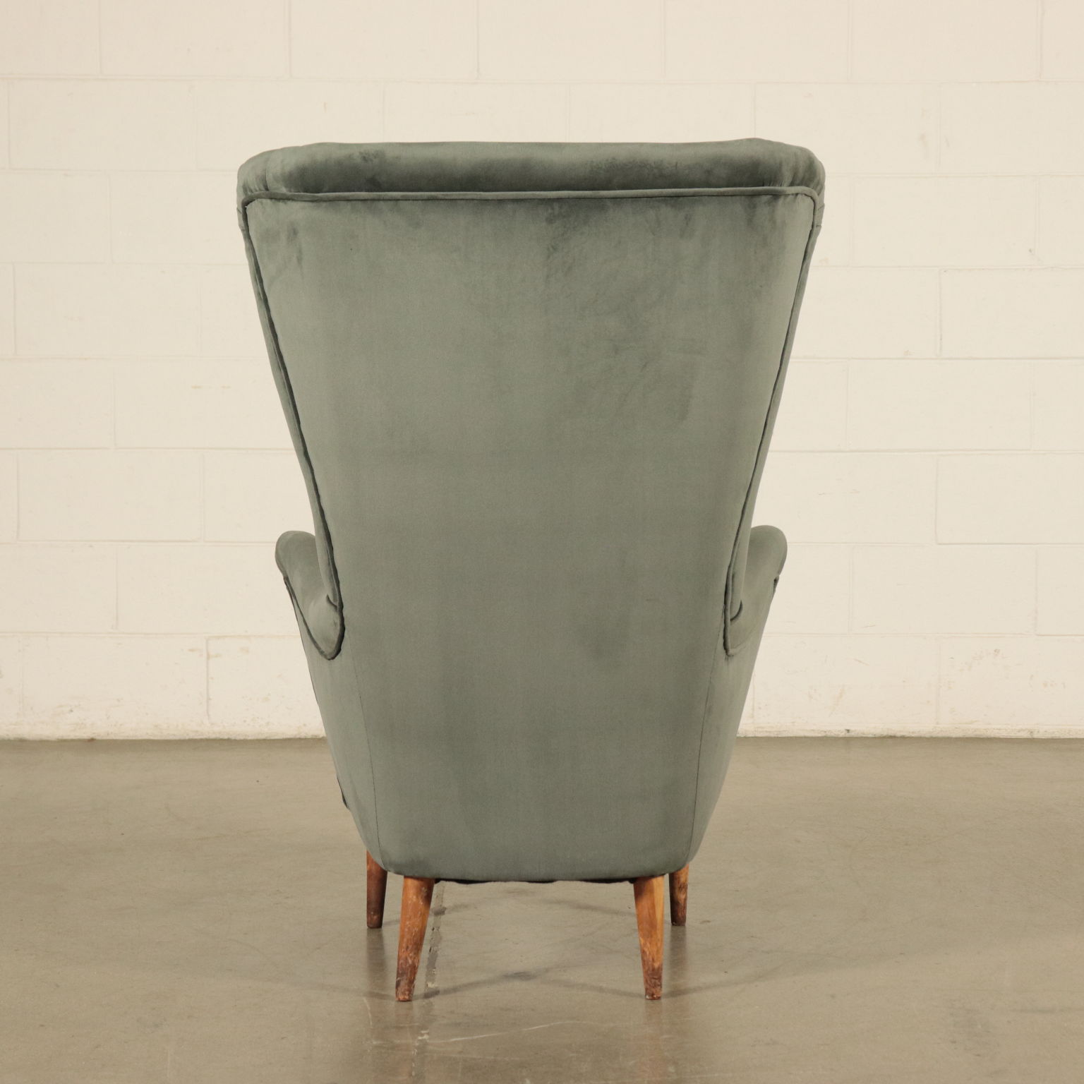 Poltrona "Bergere". Imbottitura a molle ed espanso, cuscino in piuma, rivestimento in velluto, gambe in legno.