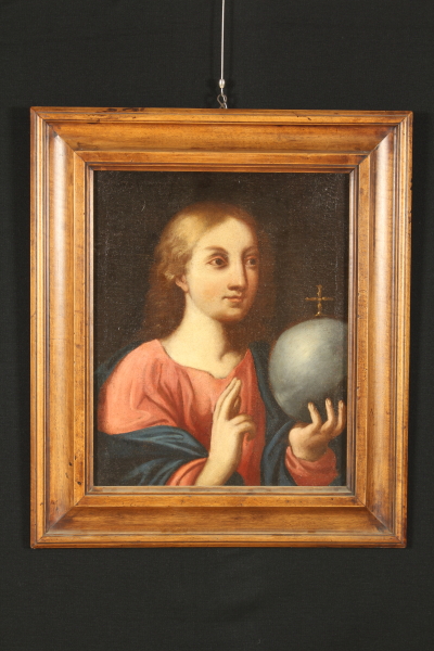 Il dipinto, rappresentante il Cristo Salvatore del Mondo, è stato reintelato e restaurato in epoca recente e probabilmente scorciato sul lato destro. In cornice in noce di fine '800