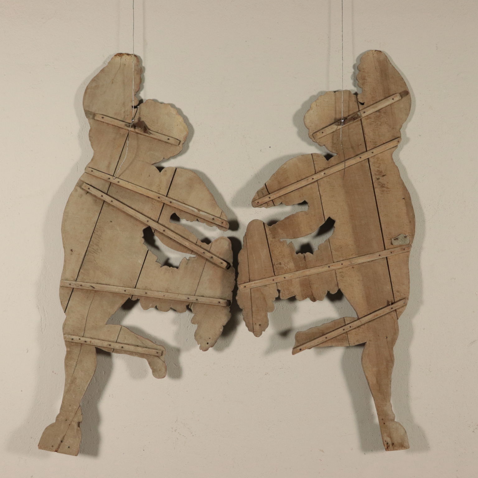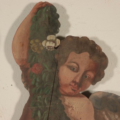 Coppia di sagome in legno di abete dipinte a policromia con angeli a reggere ghirlande fiorite.