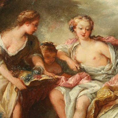 Olio su tela. Scuola francese. Bella copia del celebre dipinto conservato al museo del Louvre di Parigi, realizzato nel 1747 da François Boucher che, quale primo pittore alla corte di Luigi XV, realizzò una serie di opere a soggetto mitologico, con le quali rappresentò la società parigina ruotante attorno al re, attraverso figurazioni eleganti e sensuali, scene luminose, colori chiari, forme avviluppate. Il mito qui raffigurato racconta di Europa, bellissima principessa fenicia di cui Giove si innamorò. Per rapirla, il dio prese le sembianze di un toro bianco e avvicinò Europa e le sua ancelle mentre solevano bagnarsi e cogliere fiori in riva al mare; data la docilità dell'animale, Europa lo avvicinò e gli salì in groppa e il dio ne approfittò per rapirla e portarla a Creta, ove la sposò. Sul retro di questa copia, è presente timbro a ceralacca di importazione. Il dipinto presenta un taglio in alto al centro. E' presentato in cornice dorata della prima metà del '900.