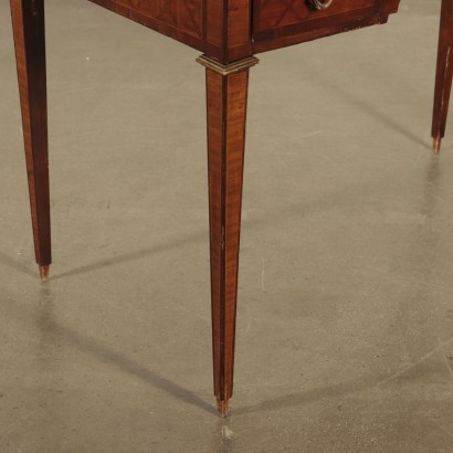 Sorretta da quattro gambe tronco-piramidali, nella fascia sottopiano presenta un lungo cassetto centrale e due di altezza maggiore ai lati. Interamente intarsiato in essenze varie sul fronte e sui fianchi, con un motivo a triage; il piano presenta un inserto in finta pelle.