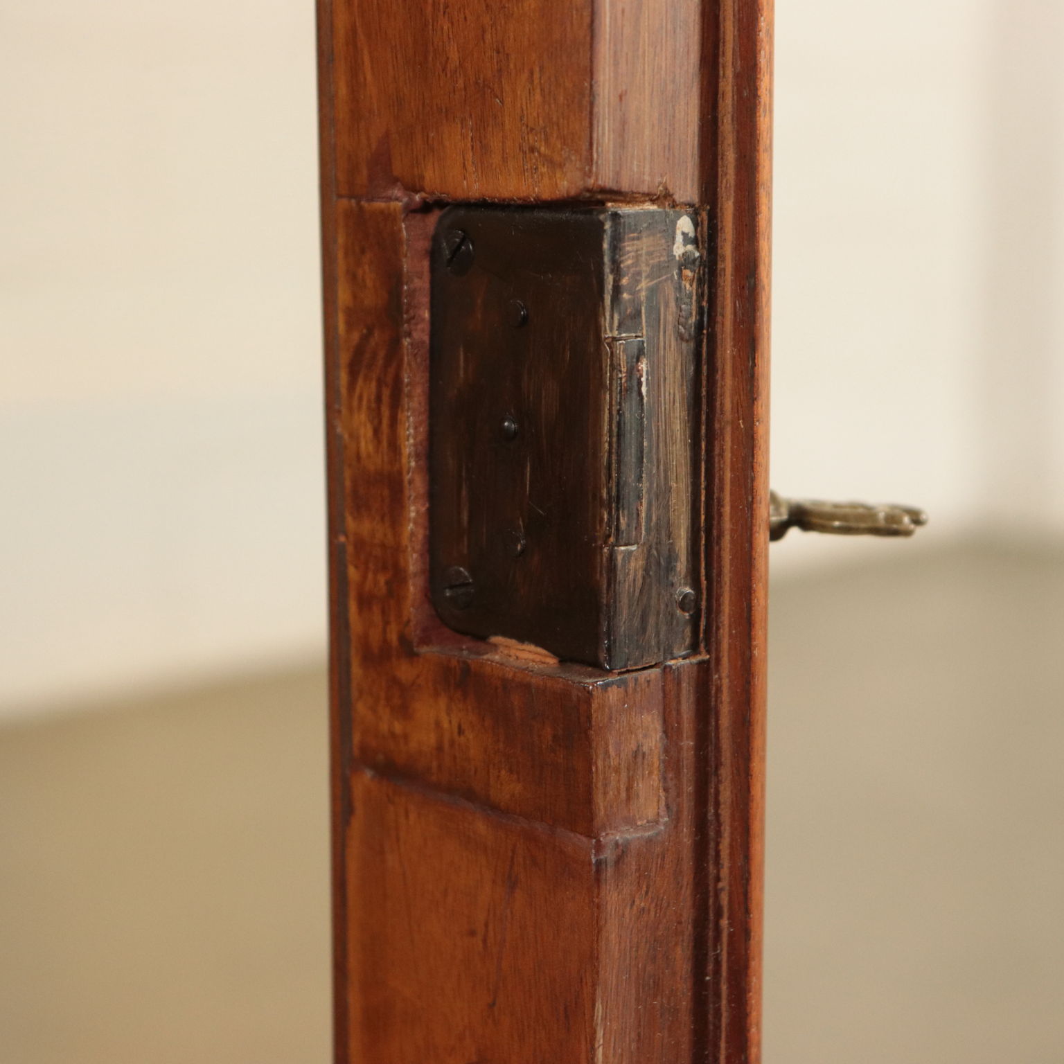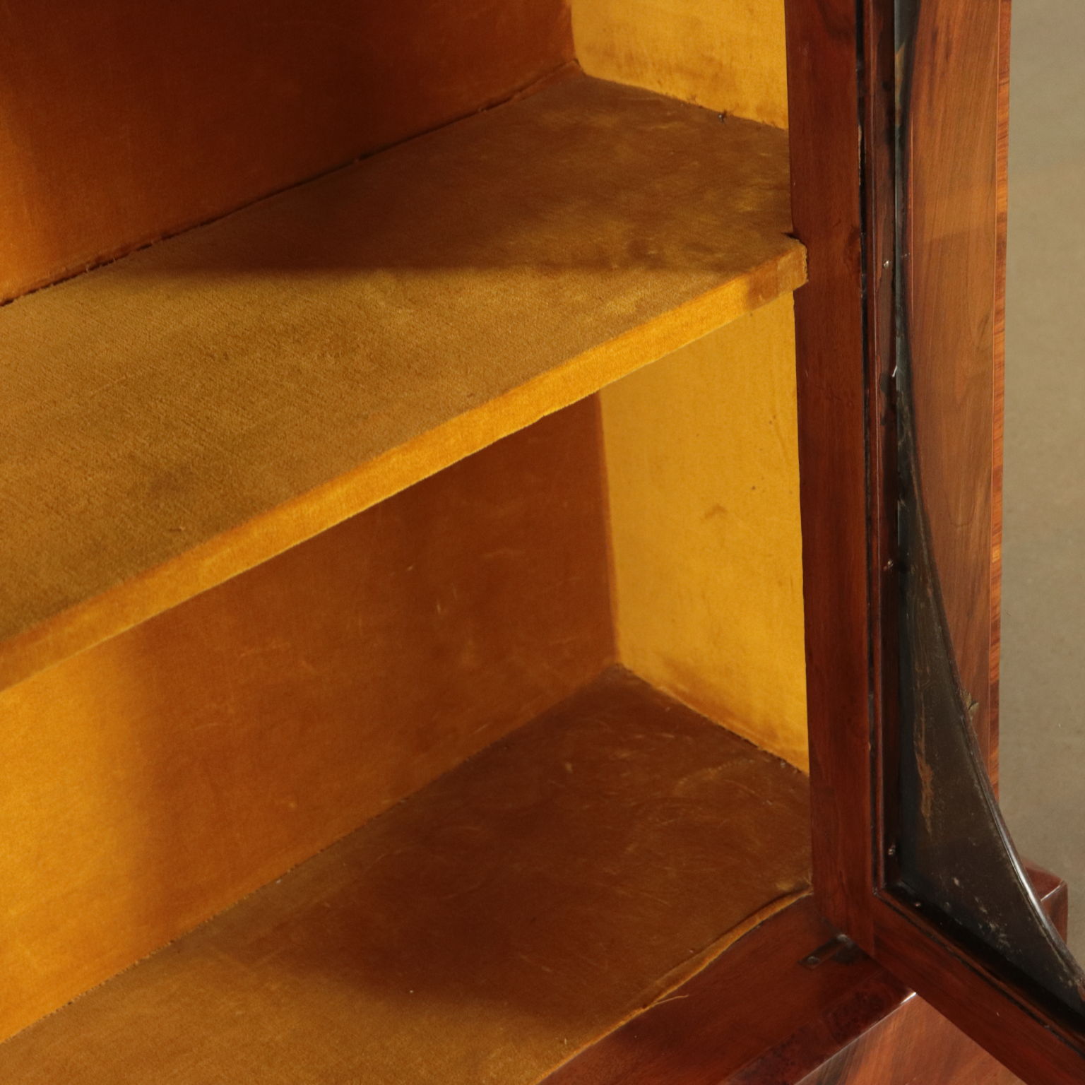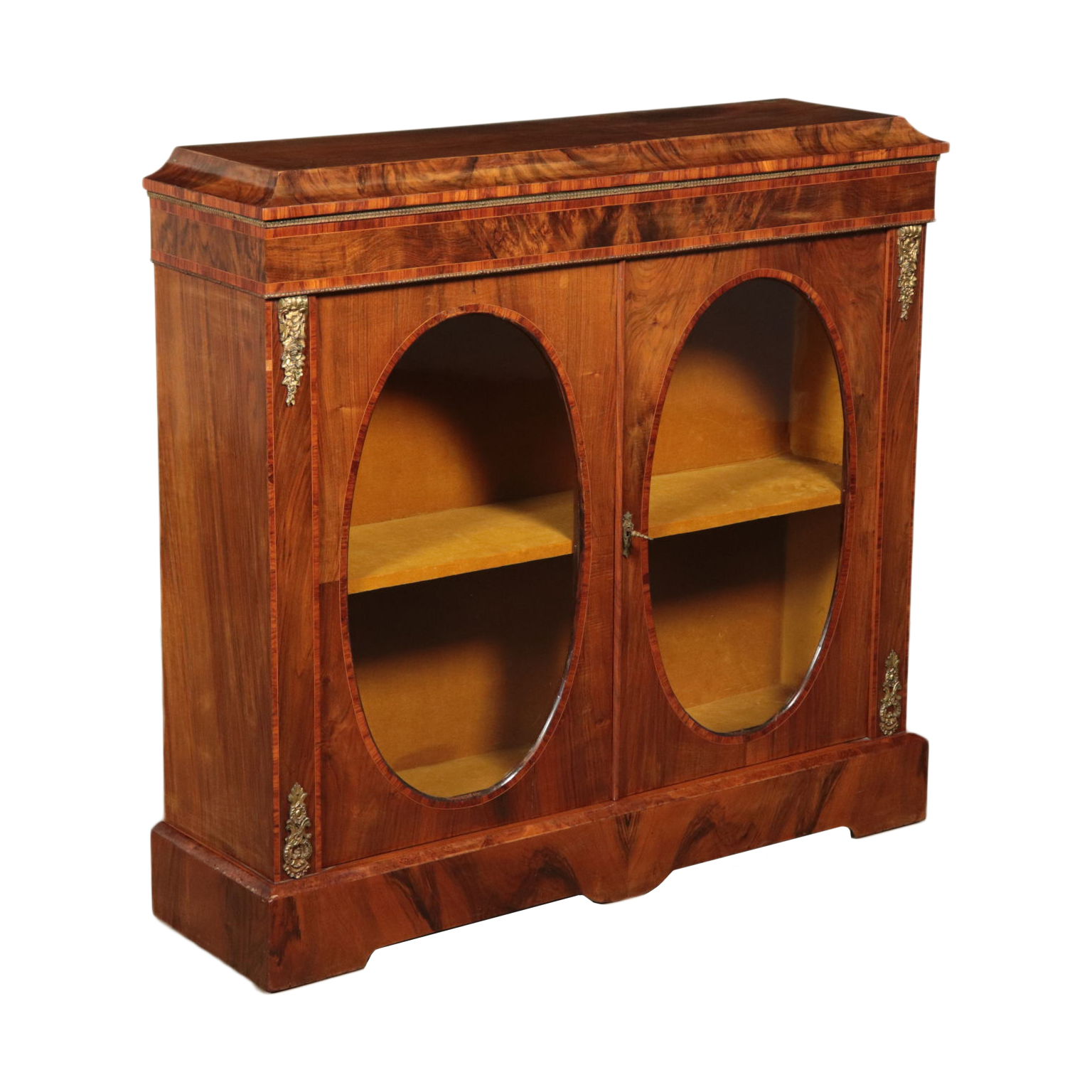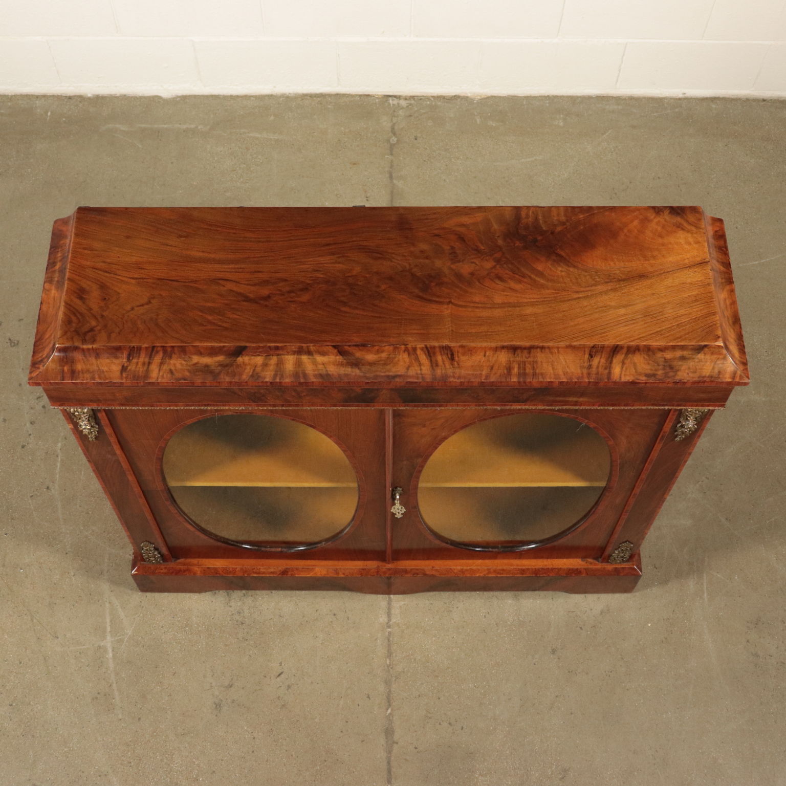 Sul fronte presenta due ante con vetri ovali. Impiallacciata in radica, presenta filettature in acero e bordure in bois de rose; I montanti sono ornati con applicazioni bronzee a forma di festoni fioriti; anche le cornicette sottopiano sono in bronzo.