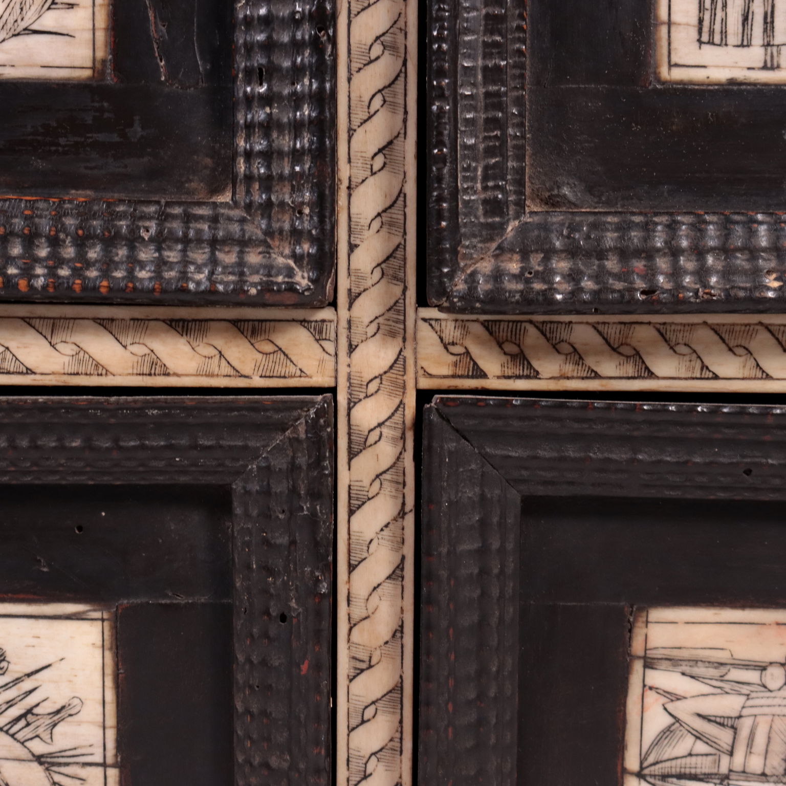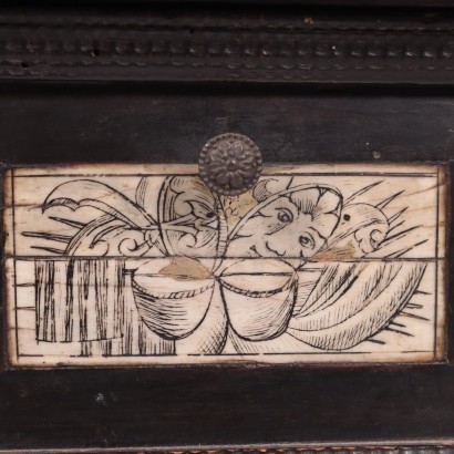 In legno ebanizzato, sul fronte presenta quattro cassetti bordati da una cornice guilloche e ornati con formelle in avorio incise a bulino. Intarsi in avorio disegnati sono presenti anche sui piedini anteriori e tra i cassetti. Gli interni sono in pioppo. Dotato di documentazione CITES.