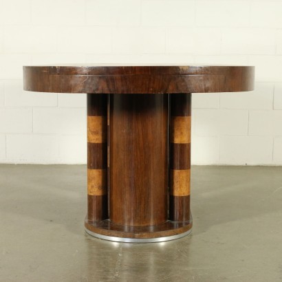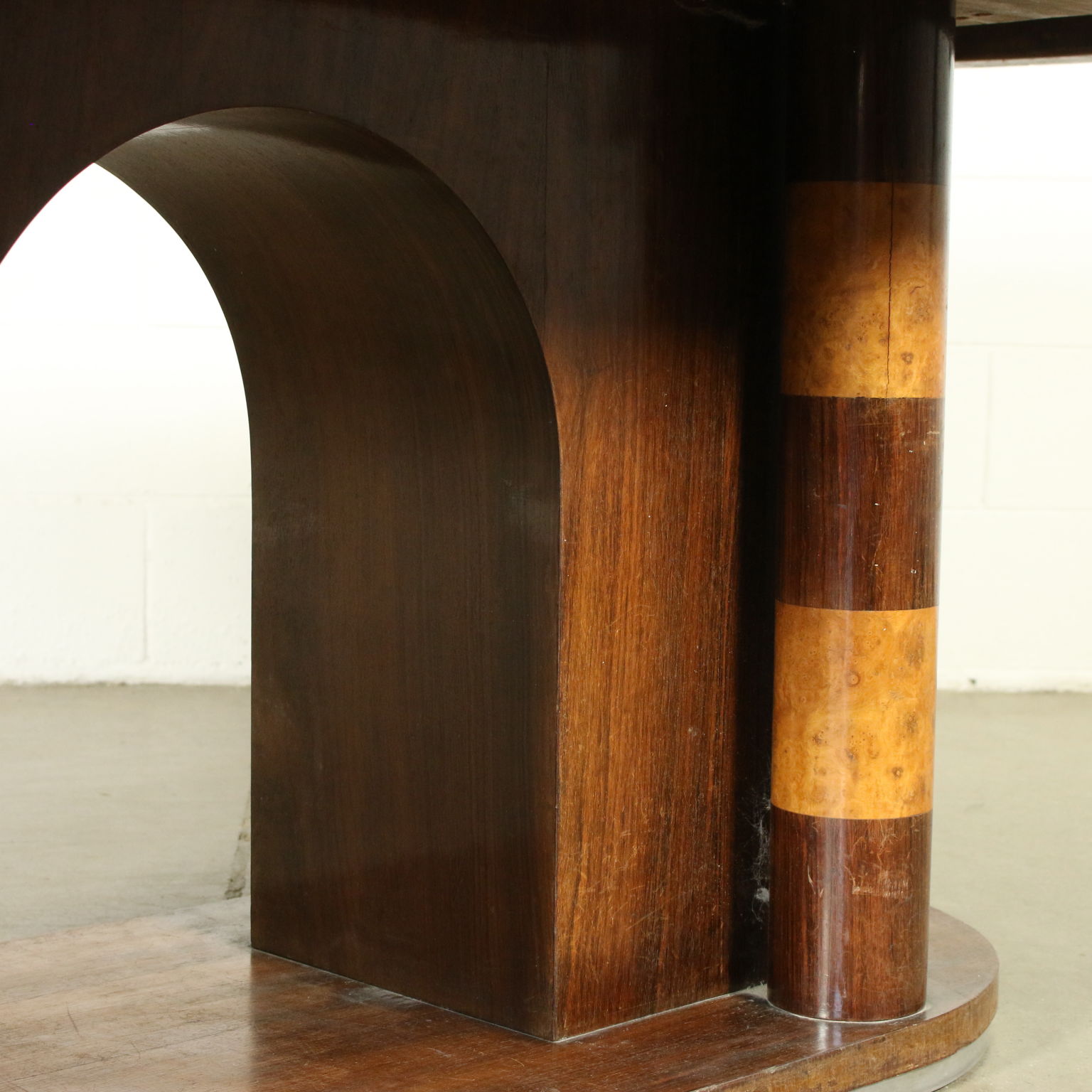 Poggiante su un pianetto ornato con una cornice in ottone, il sostegno è costituito da due grandi plinti con un vano centrale voltato ad arco e sono affiancati da quattro colonne. Impiallacciato in palissandro e radica di acero, sulle colonne e sul piano l'accostamento dei due legni genera un contrasto cromatico.