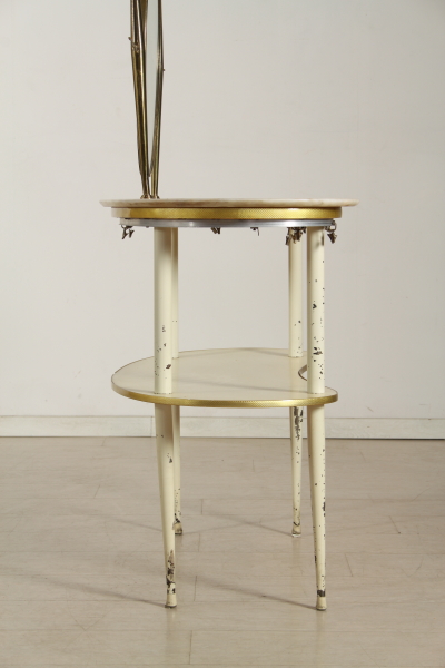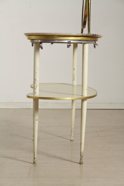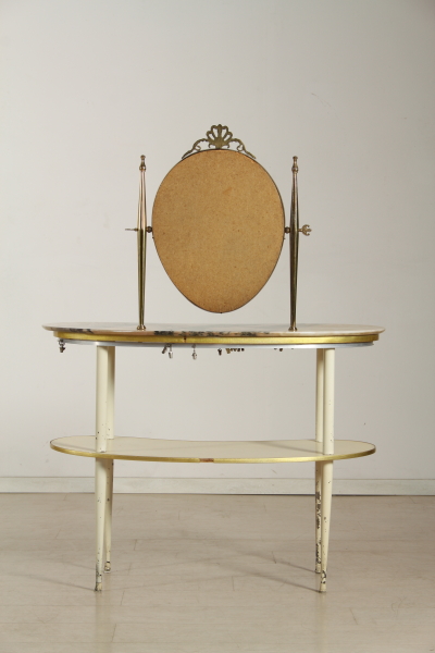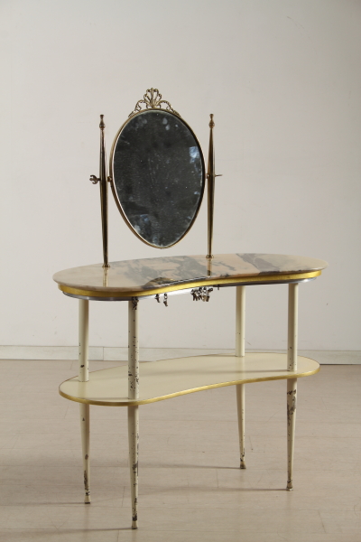 Toelette con piano in marmo a fagiolo e ripiano intermedio in legno. Specchio con cornice in ottone ed inclinazione regolabile.