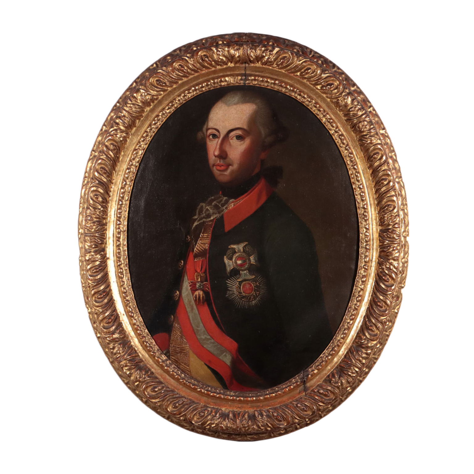Olio su tela. Ritratto di Giuseppe II d'Asburgo-Lorena (Vienna 1741-1790) fu Imperatore del Sacro romano impero dal 1741, insieme alla madre Maria Teresa d'Austria, e dal 1780 come unico regnante. E' considerato uno dei rappresentanti del "dispotismo illuminato", per il programma di riforme interne ed estere volte allo sviluppo e al rafforzamento del suo regno. Di lui esistono numerosi ritratti, come questo, che risale alla giovinezza, in posa convenzionale con le insegne imperiali (il Toson d'oro, la croce di Maria Teresa d'Austria) e la bandoliera rossa e bianca, i colori dell'Austria. Il dipinto, in prima tela, è stato sottoposto a restauri in tempi diversi; presenti toppe al retro. E' presentato in importante cornice ovale in legno intagliato e dorato, con decori fogliacei e a nastro.