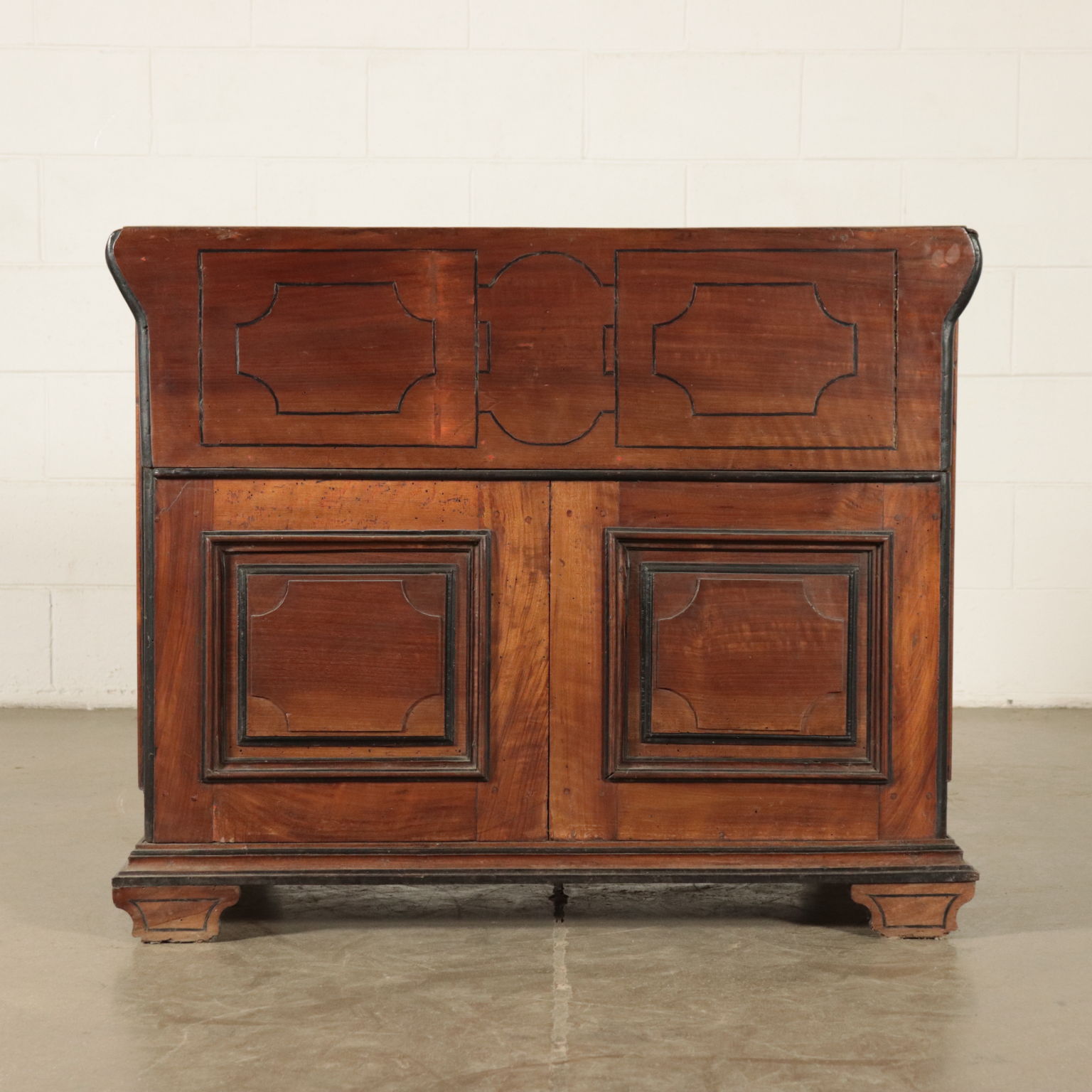 Sorretto da quattro piedini a mensola, sul fronte presenta due ante pannellate e un'anta sollevabile che, sostenuta da due tiretti dotati di meccanismo a molla, diventa prolungamento del piano trasformando il mobile in uno scrittoio. Sotto l'anta sono celati quattro cassetti. Il mobile in noce è elegantemente decorato con cornicette intagliate ed ebanizzate e con filettature in rovere annerito. Lo stesso disegno presente sul fronte è presente anche nella parte posteriore, rifinita a giorno e dunque rendendo il mobiletto un complemento d'arredo da centro.