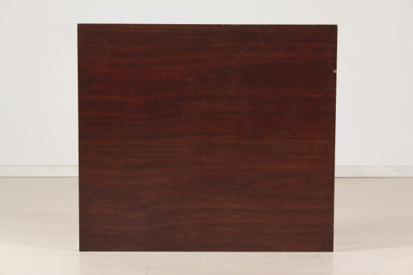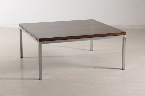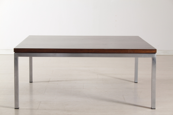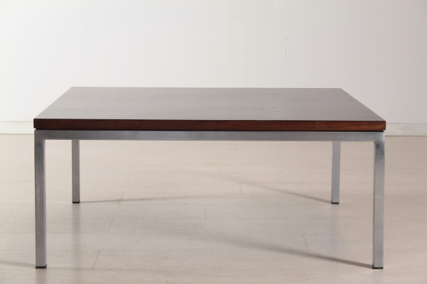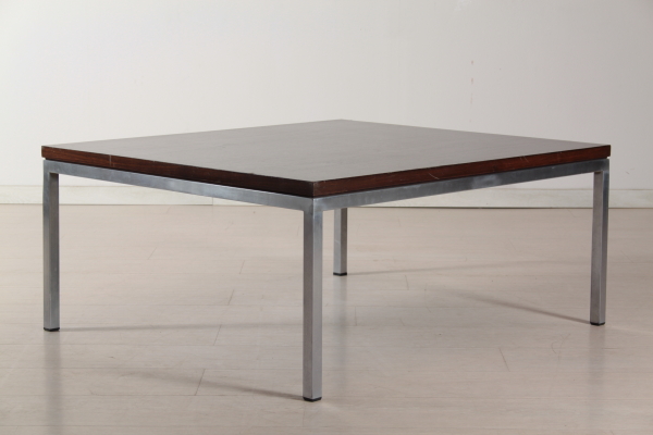 Tavolino con struttura in metallo cromato. Il piano è in palissandro.