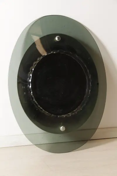 Specchio dalla forma ovale con vetro specchiante, accoppiato ad una cornice in vetro. Molatura di decoro.