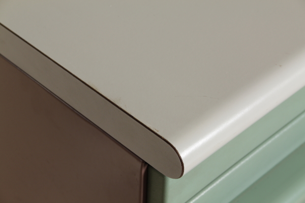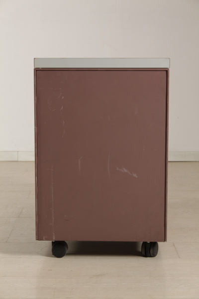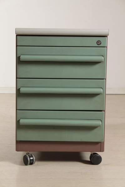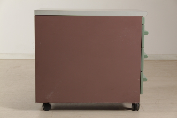 Cassettiera con rotelle. Struttura in metallo portante tre cassetti e piano in legno laminato.