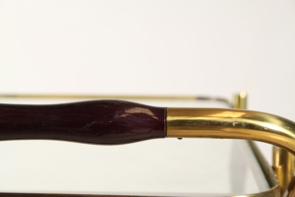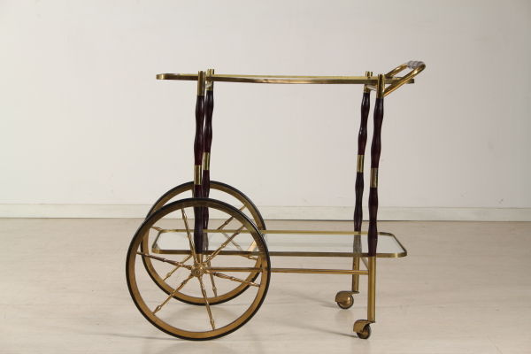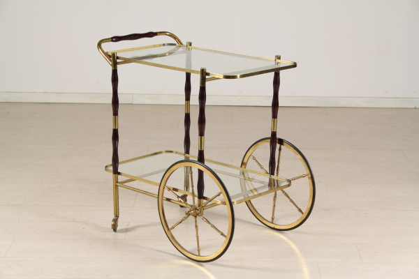 Carrello con struttura in legno e ottone. Presenta due piani di appoggio in vetro.