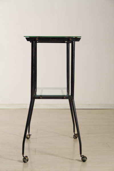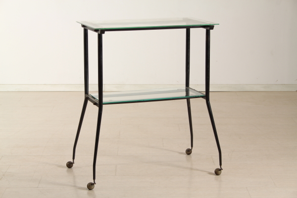 Carrellino porta tv, con la struttura tubolare in metallo verniciato. Presenta quattro rotelle girevoli e due piani in appoggio in vetro.