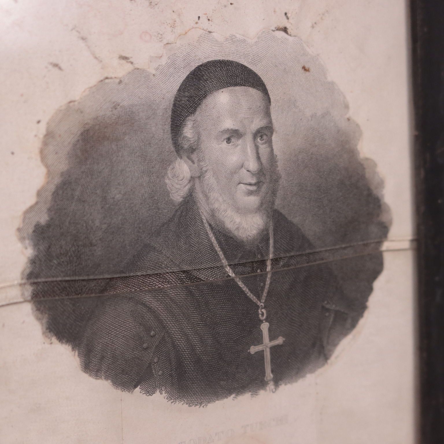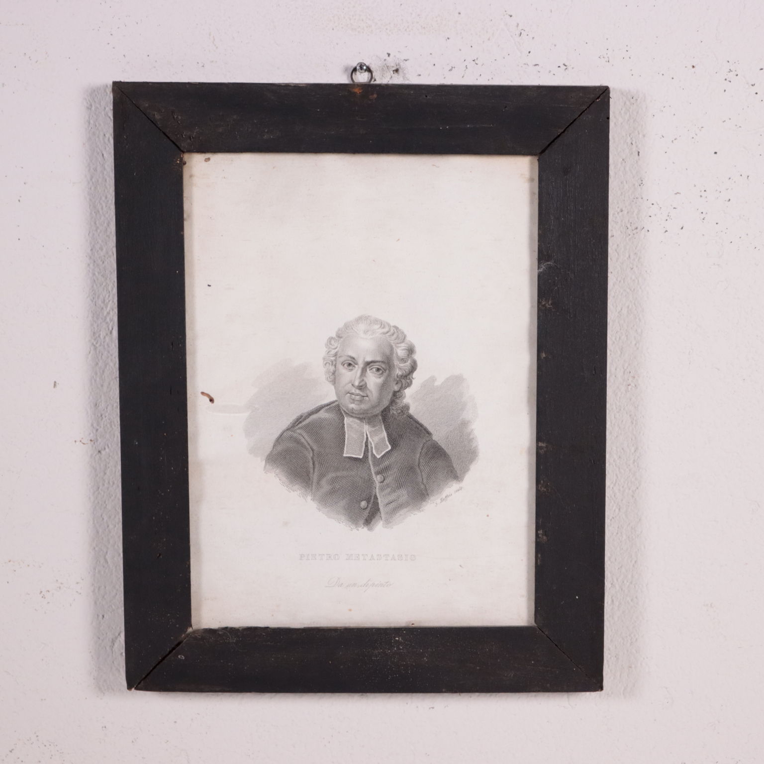 Le incisioni, del XIX Secolo, sono tratte da pubblicazioni differenti e comprendono ritratti di artisti, filosofi, studiosi, militari,ecc., per lo più copie di opere pittoriche illustri. In ciascuna compare il nome dell'opera di riferimento e dello stampatore: Alcune di esse sono attribuibili a Giacomo Lombroso, tratte da "Galleria militare. Vite dei marescialli, generali, ammiragli....", edito da Borroni e Scotti nel 1841. Le incisioni sono presentate in cornici coeve con vetri d'epoca.