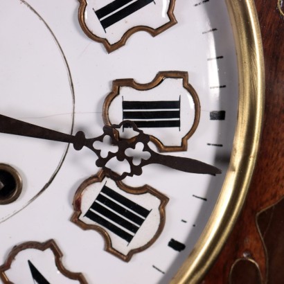 Orologio a pendolo da parete in varie essenze di legno con intarsi in madre perla e legno. Mostra in metallo smaltato con ore a numeri romani e lancette in ferro finemente traforate.