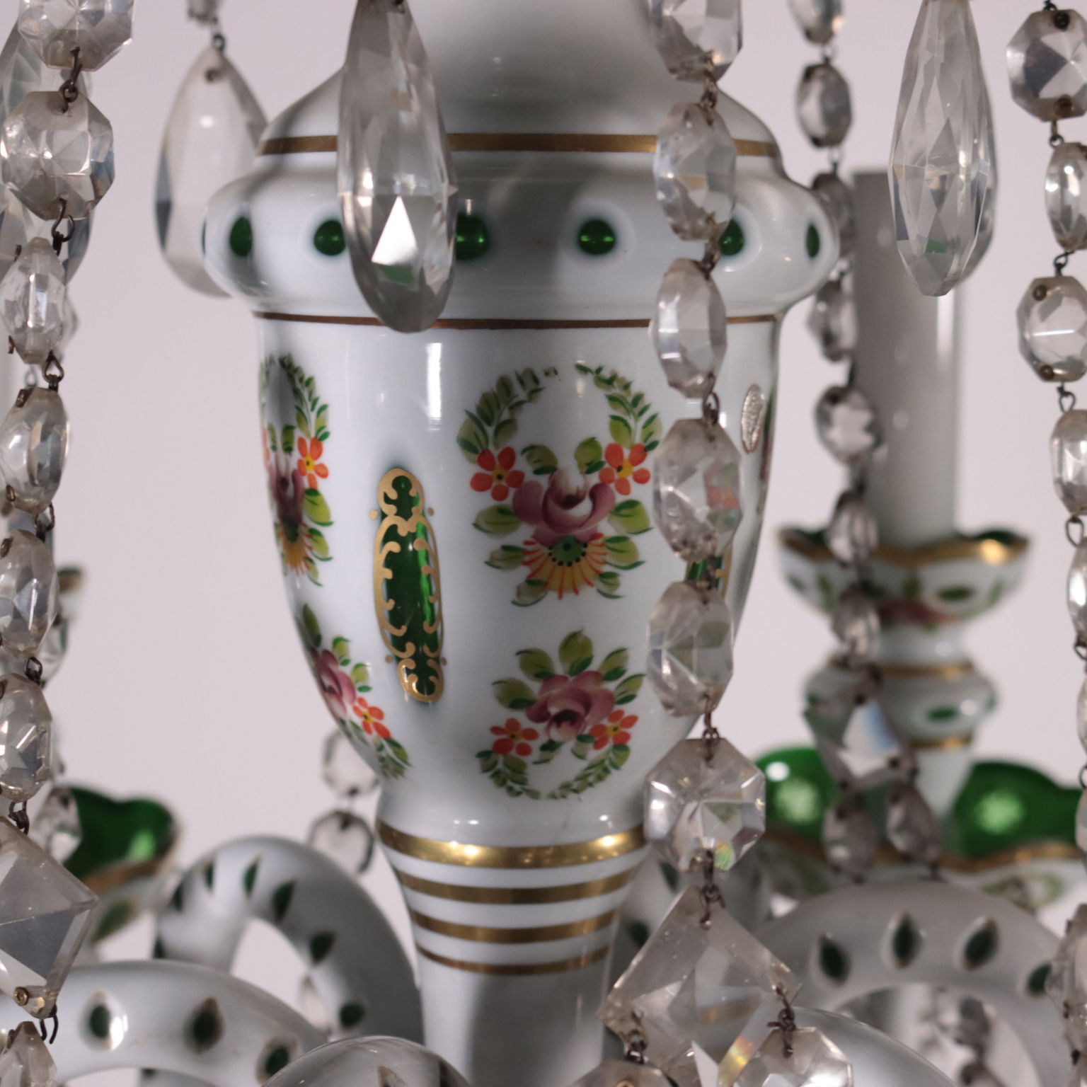 Lampadario di Boemia in vetro dipinto di verde e bianco e ornato con piccole ghirlande floreali, anch'esse dipinte. A sei braccia, queste e il balaustro centrale sono ornate con pendenti in vetro.