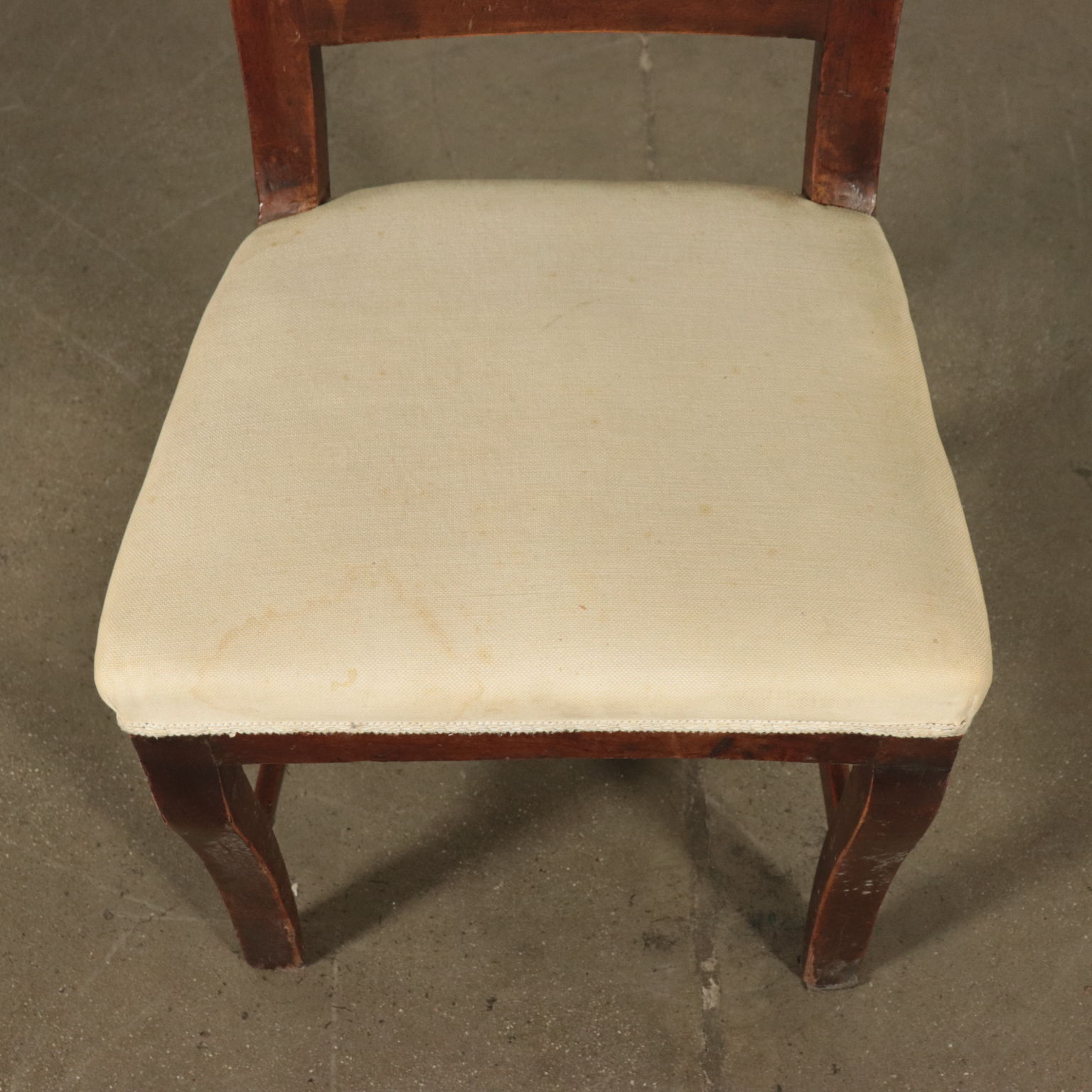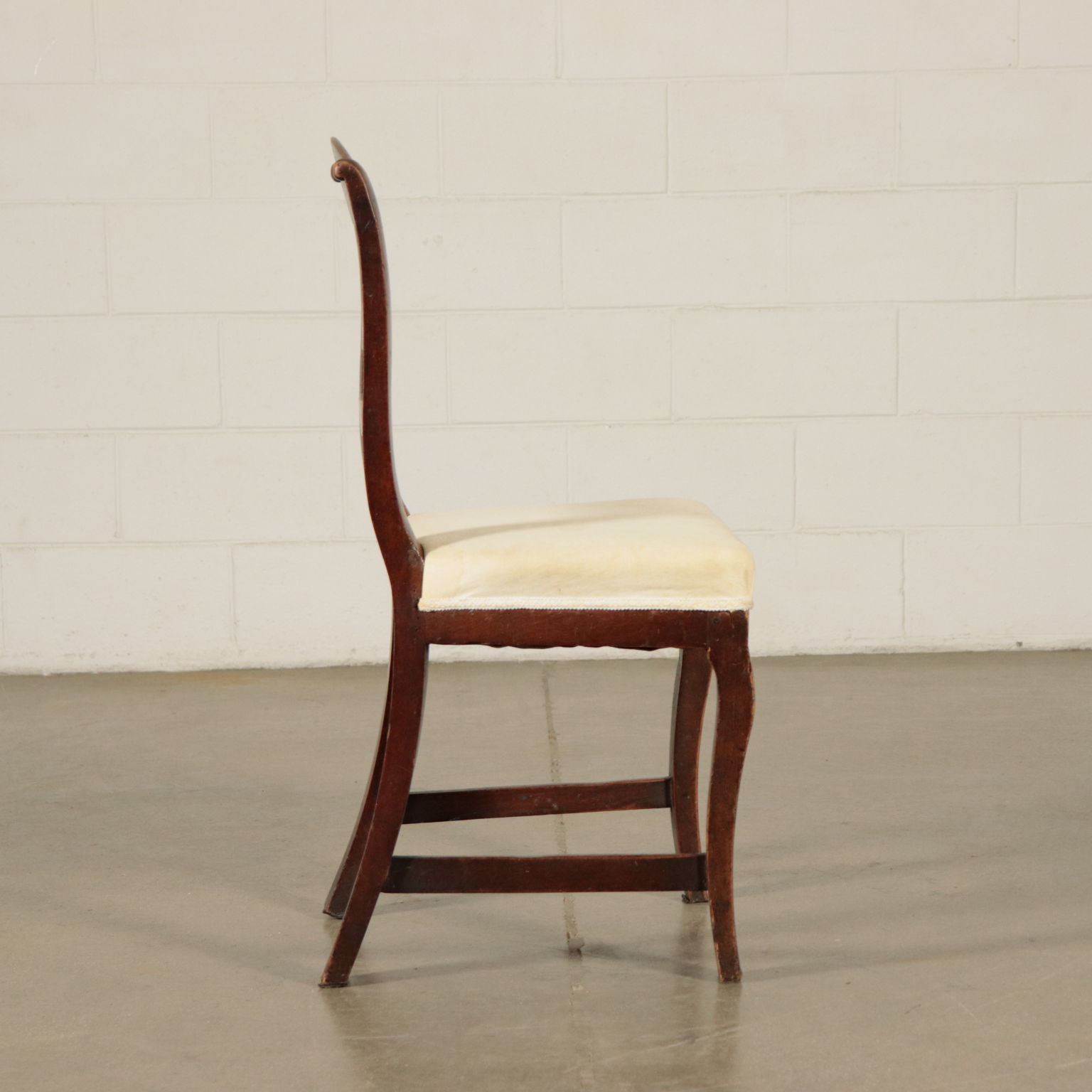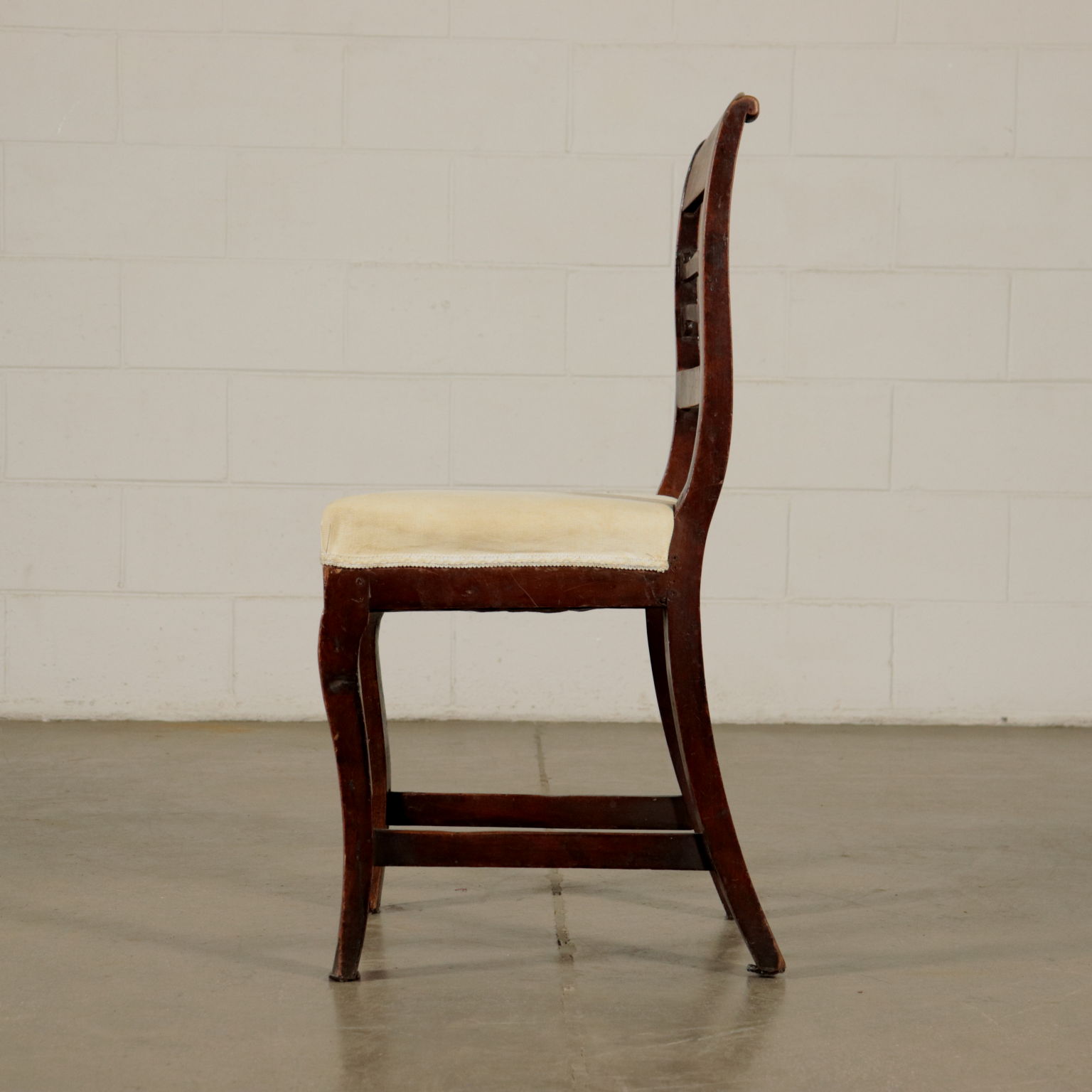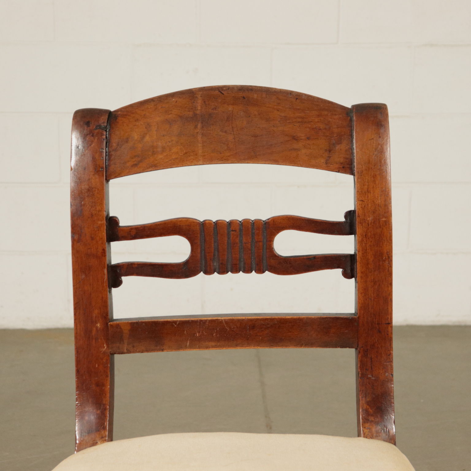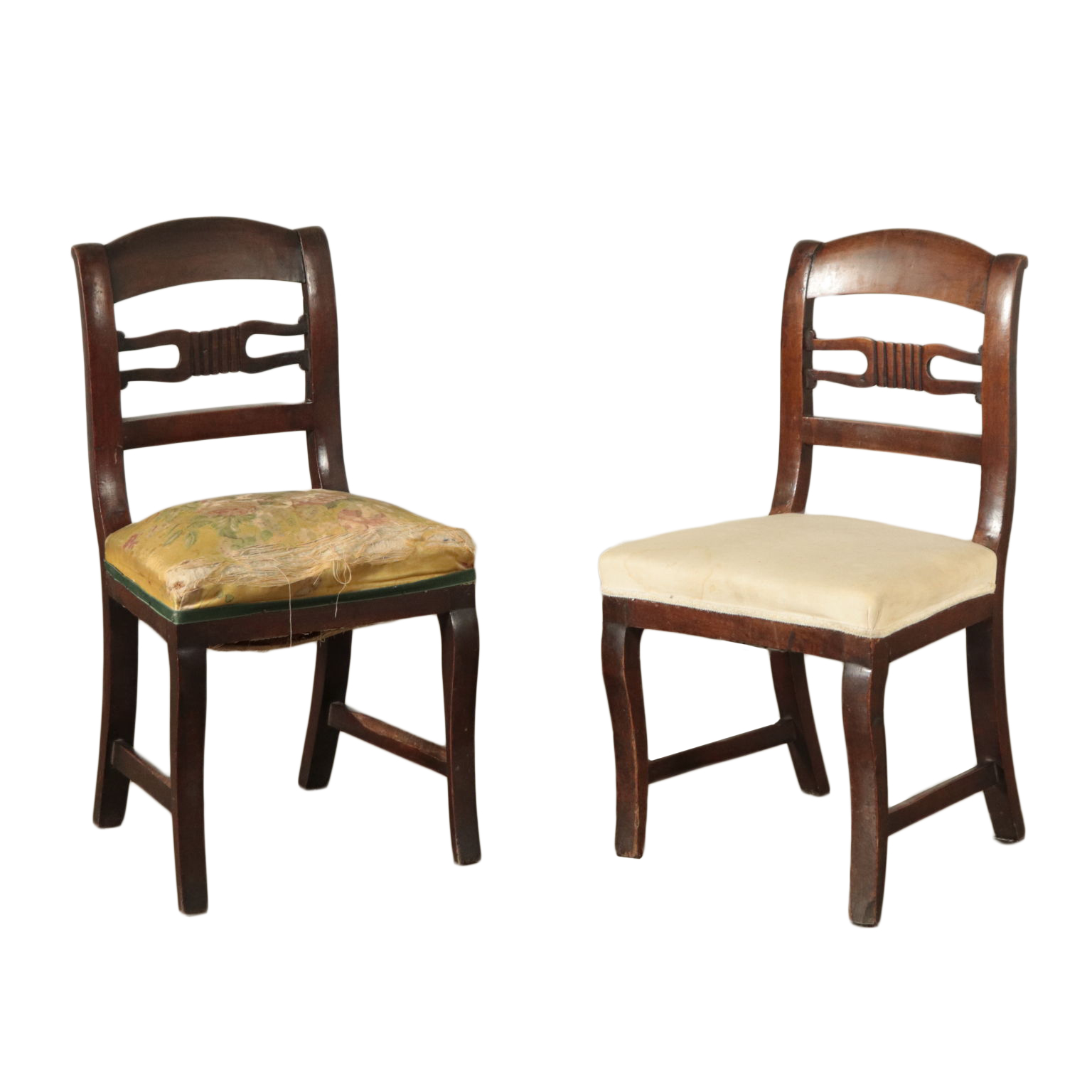Coppia di sedie Restaurazione, sorrette da quattro gambe, delle quali quelle posteriori a sciabola e quelle anteriori mosse, connesse da traverse. La seduta è imbottita, mentre lo schienale a giorno è intagliato e traforato. In noce.