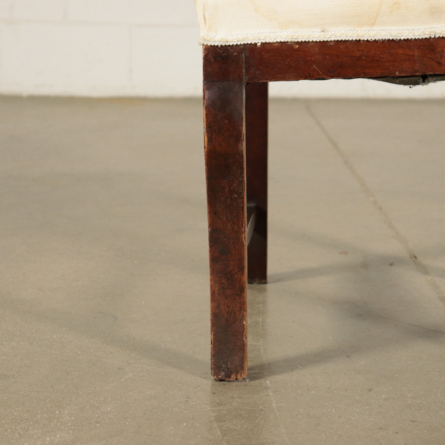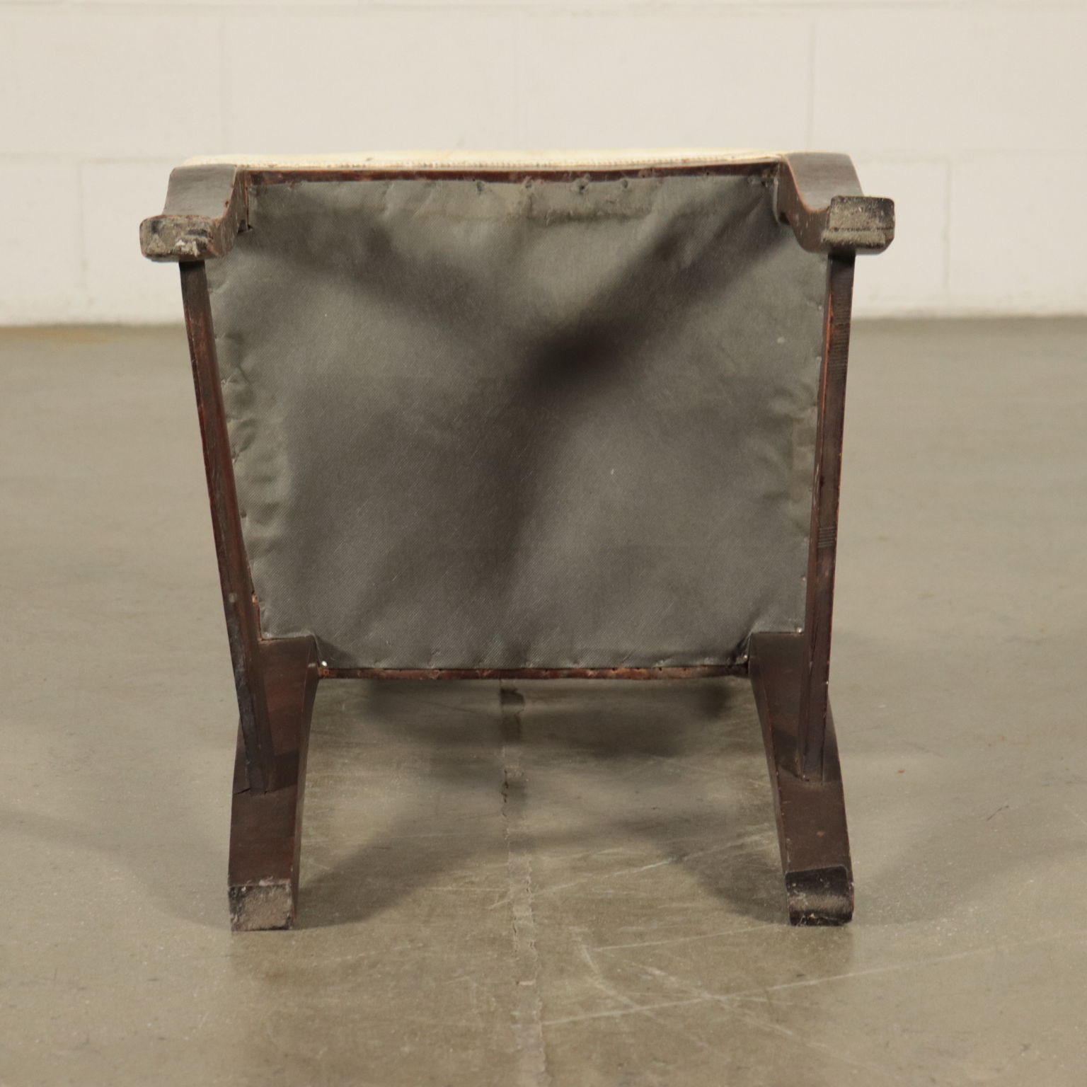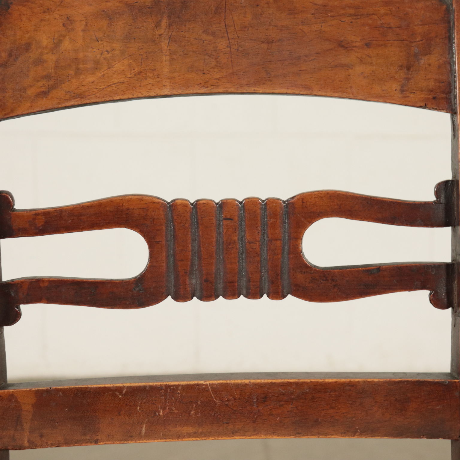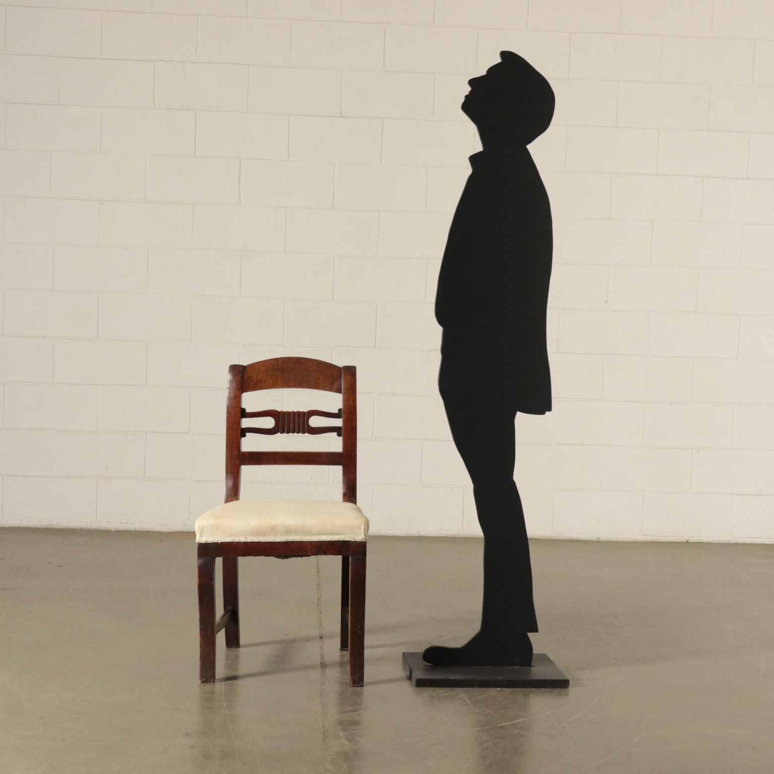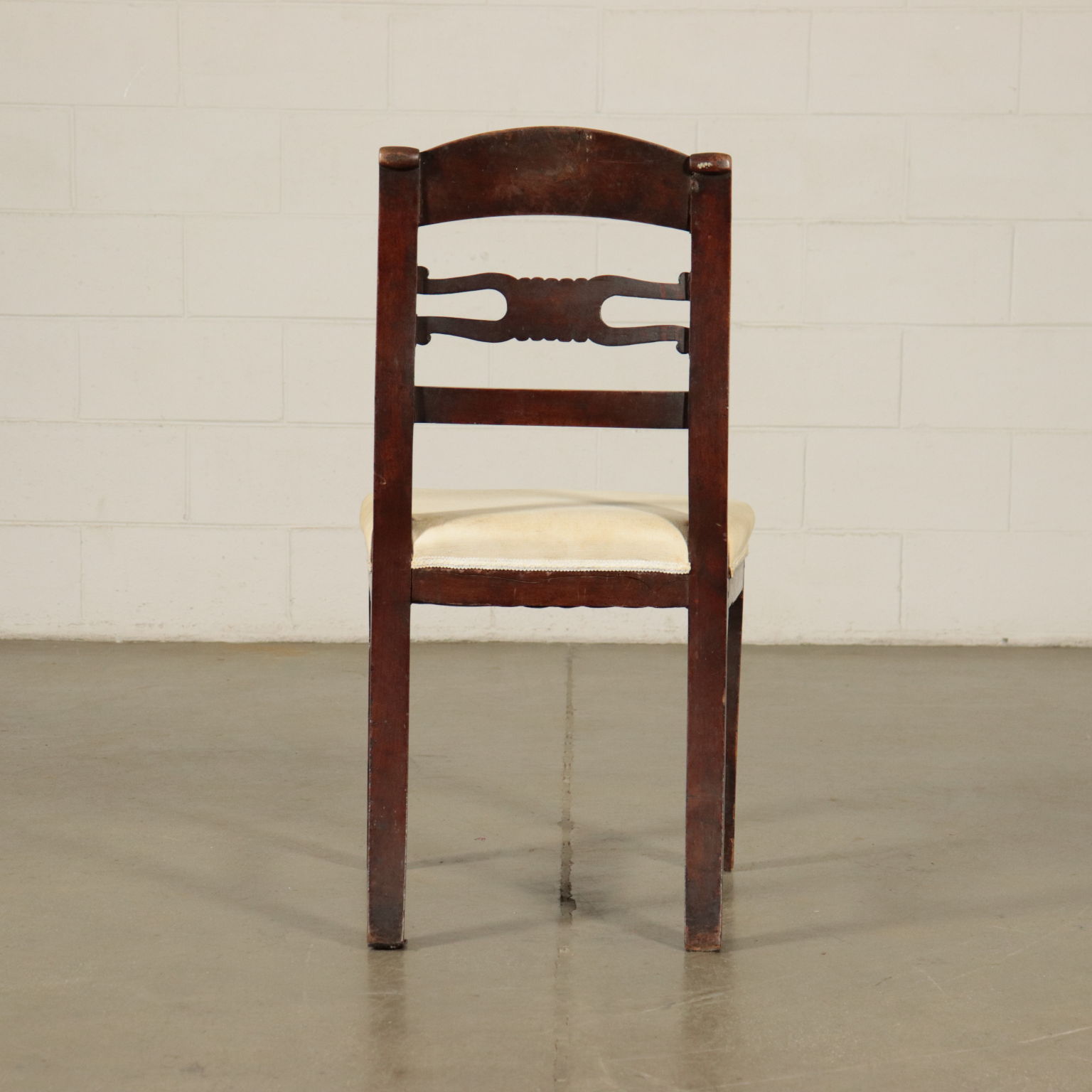 Coppia di sedie Restaurazione, sorrette da quattro gambe, delle quali quelle posteriori a sciabola e quelle anteriori mosse, connesse da traverse. La seduta è imbottita, mentre lo schienale a giorno è intagliato e traforato. In noce.